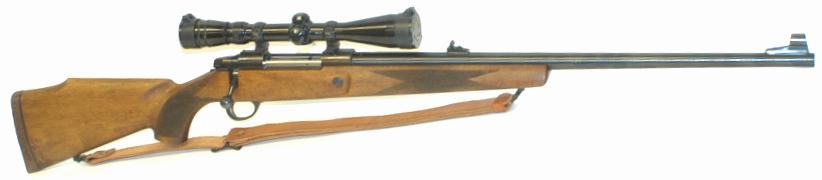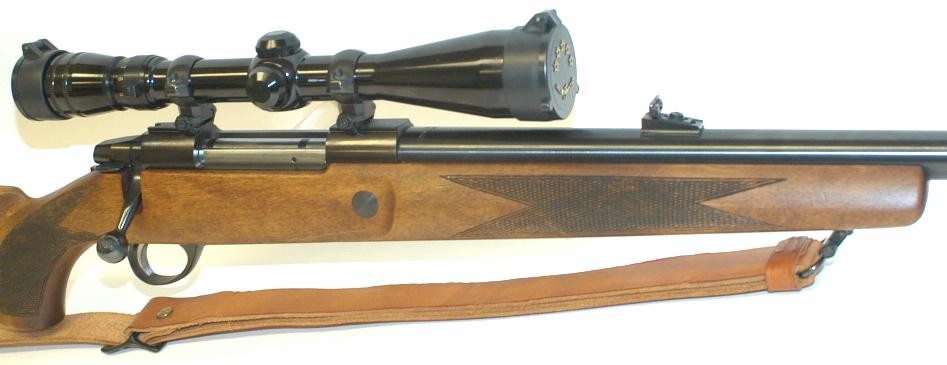 Sako Finnbear 7mm Rem Mag caliber rifle. Early model (pre-Garcia) with heavy barrel & iron sights, Redfield 3 x 9 scope & leathe (r2973)