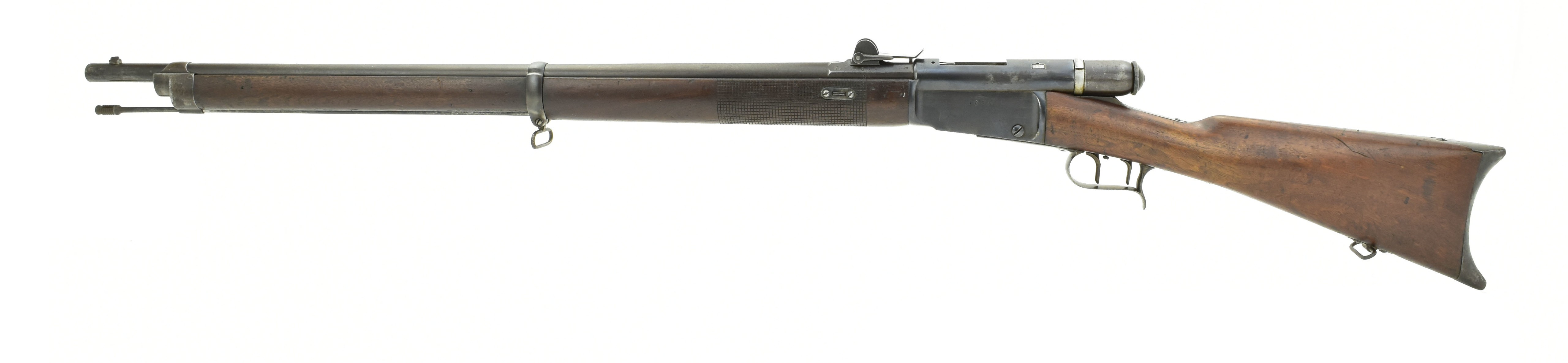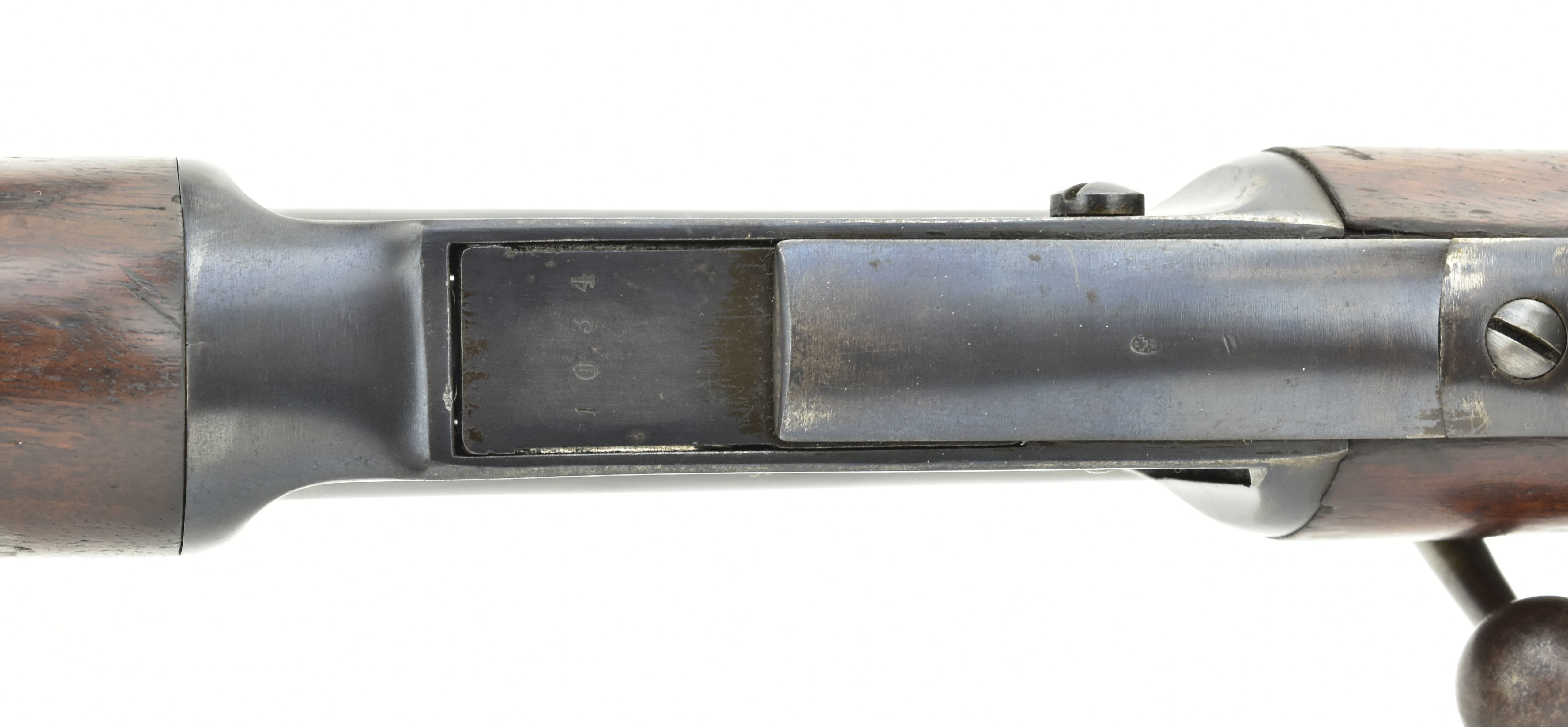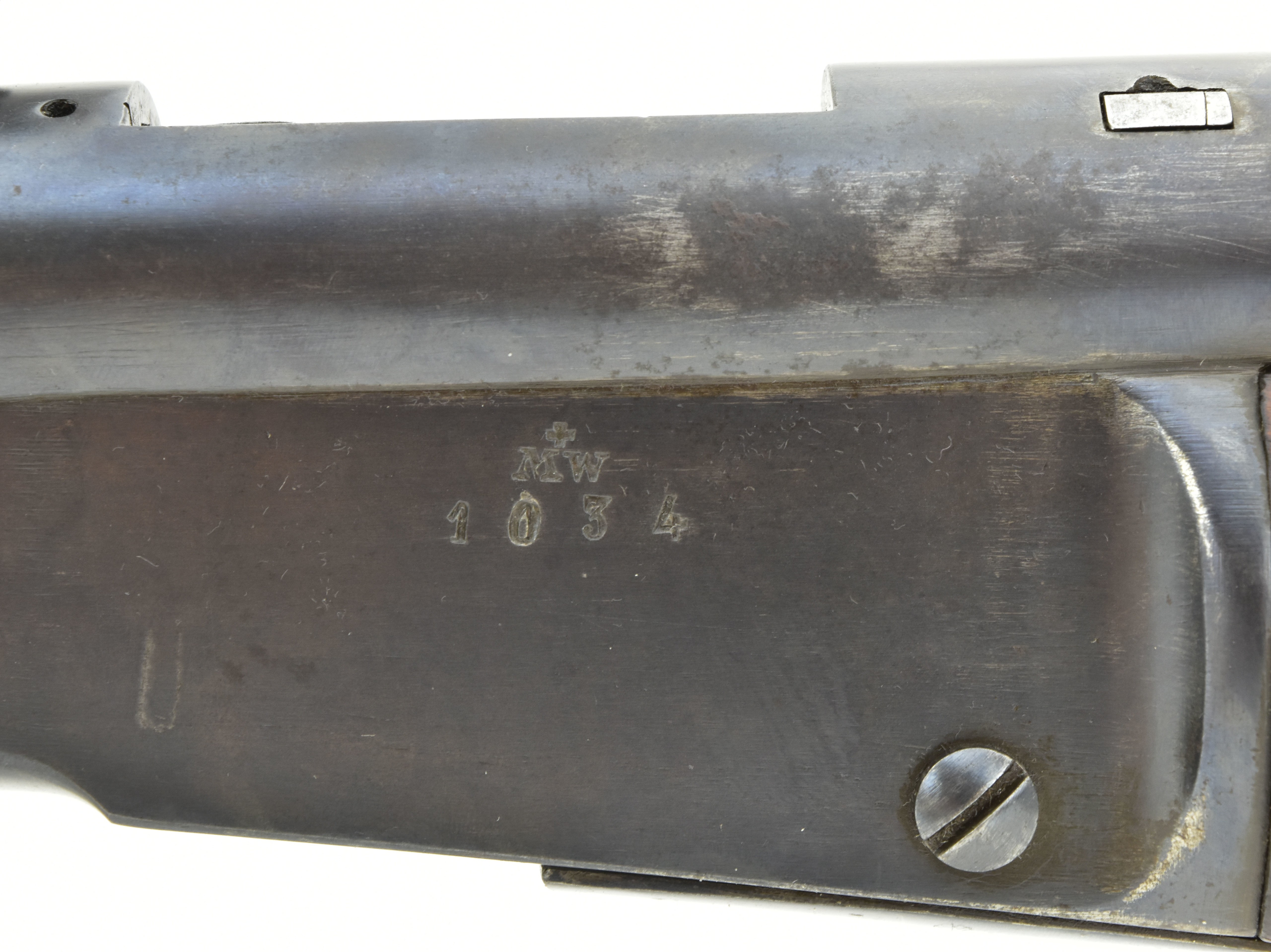 Very scarce Swiss Model 1871 Stutzer 10.4mm Swiss Rimfire sharpshooter rifle. 30⅞” Round barrel with fine bore, approximately 90% blue. Wood is very good with inspectors’ mark at bottom of butt stock. Action works correctly. There are no chips or cracks in the stock. Both sling swivels are present. Has scarce double set triggers. If you are a Swiss or European military rifle collector, this model 1871 Stutzer is a must have.