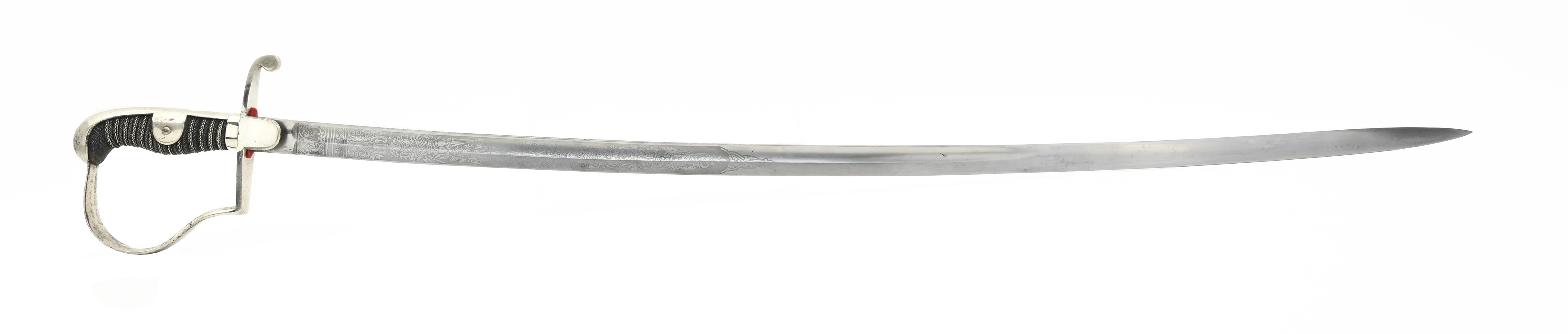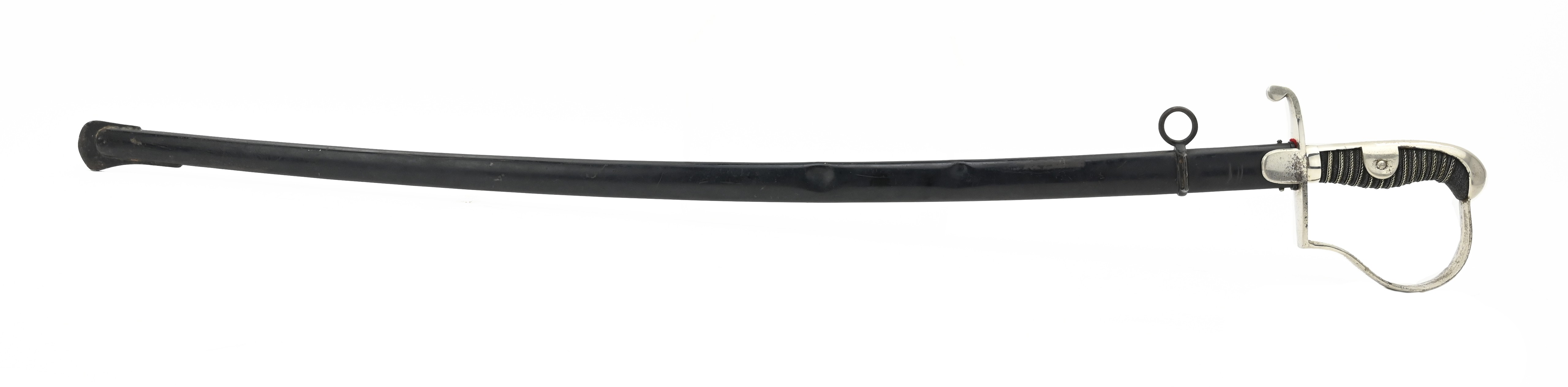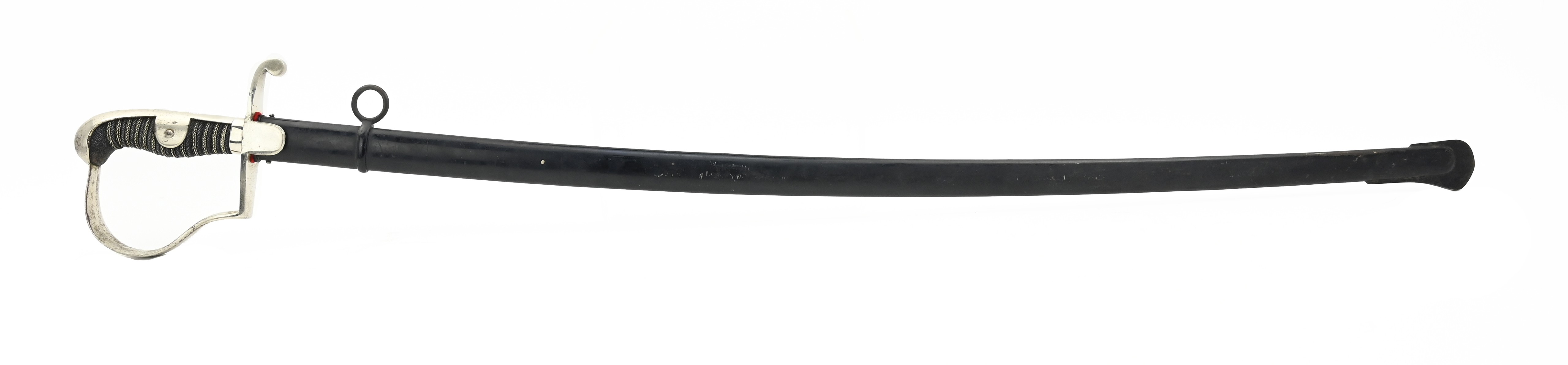German Pre-WWII NCO Dress sword. Ricasso is “Wh & C.” marked. Blade is approximately 32” and is etched with several panoply of arms. Scabbard is good with some minor dents. Wire wrap is excellent and ray skin grip is very good plus. Very good overall condition.