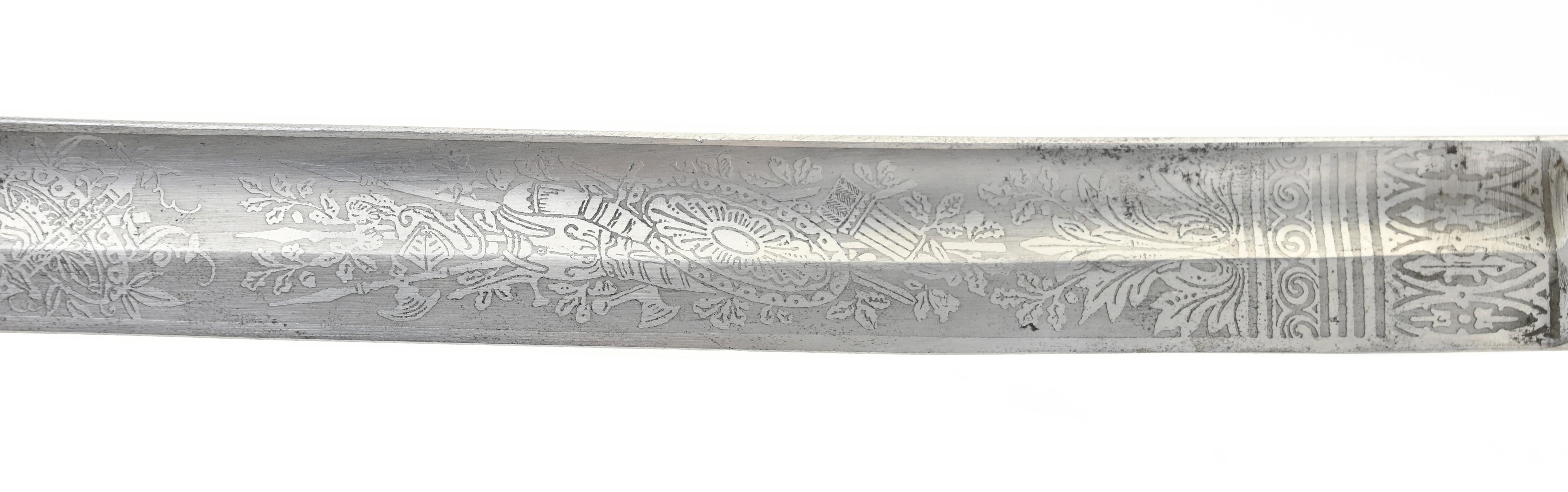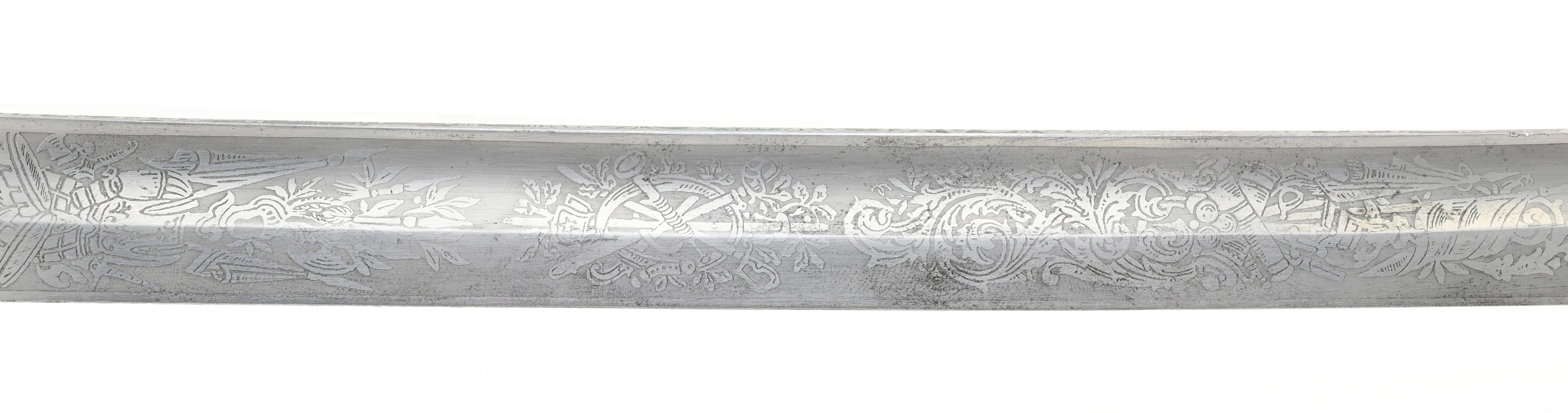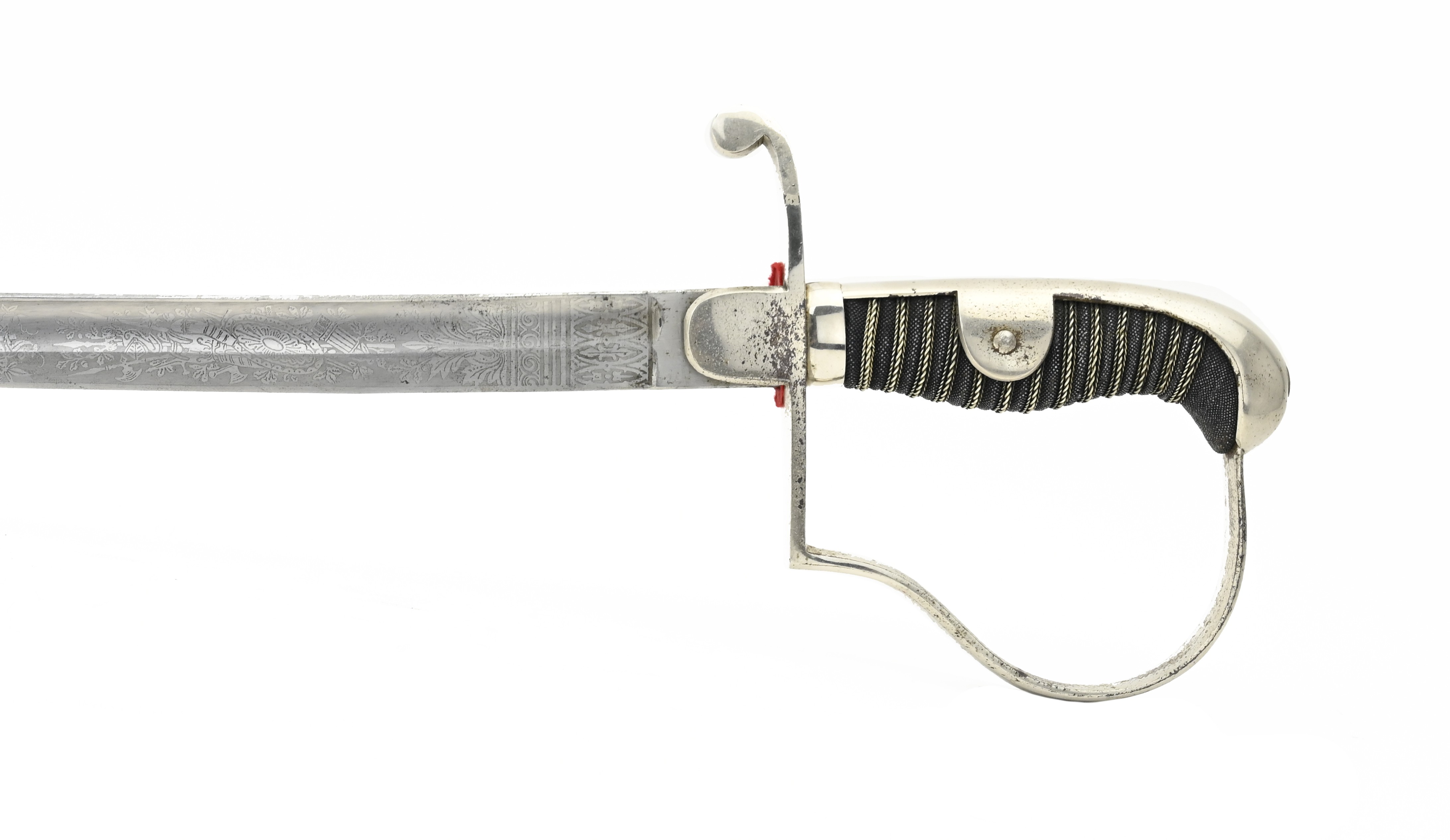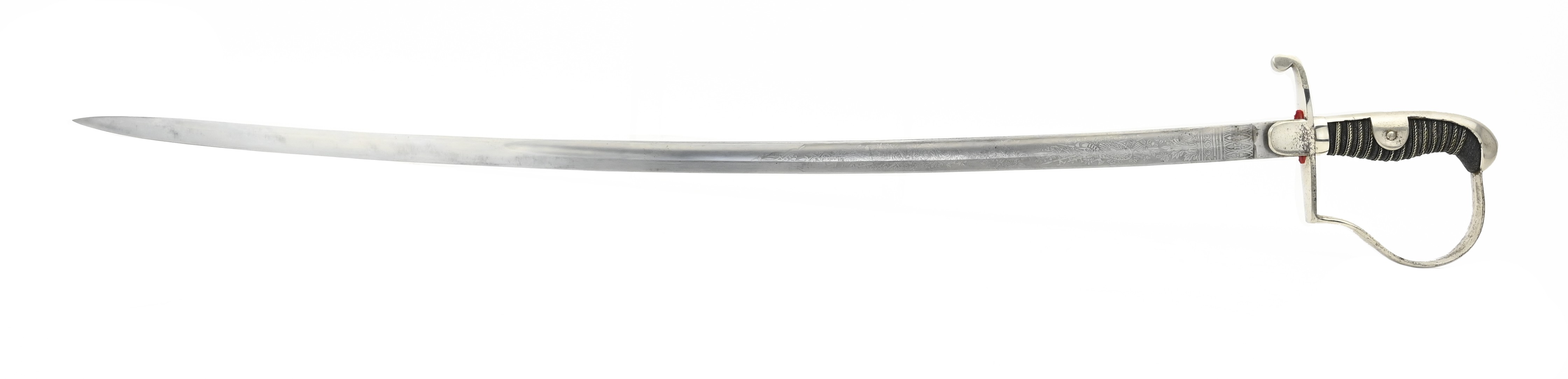 German Pre-WWII NCO Dress sword. Ricasso is “Wh & C.” marked. Blade is approximately 32” and is etched with several panoply of arms. Scabbard is good with some minor dents. Wire wrap is excellent and ray skin grip is very good plus. Very good overall condition.