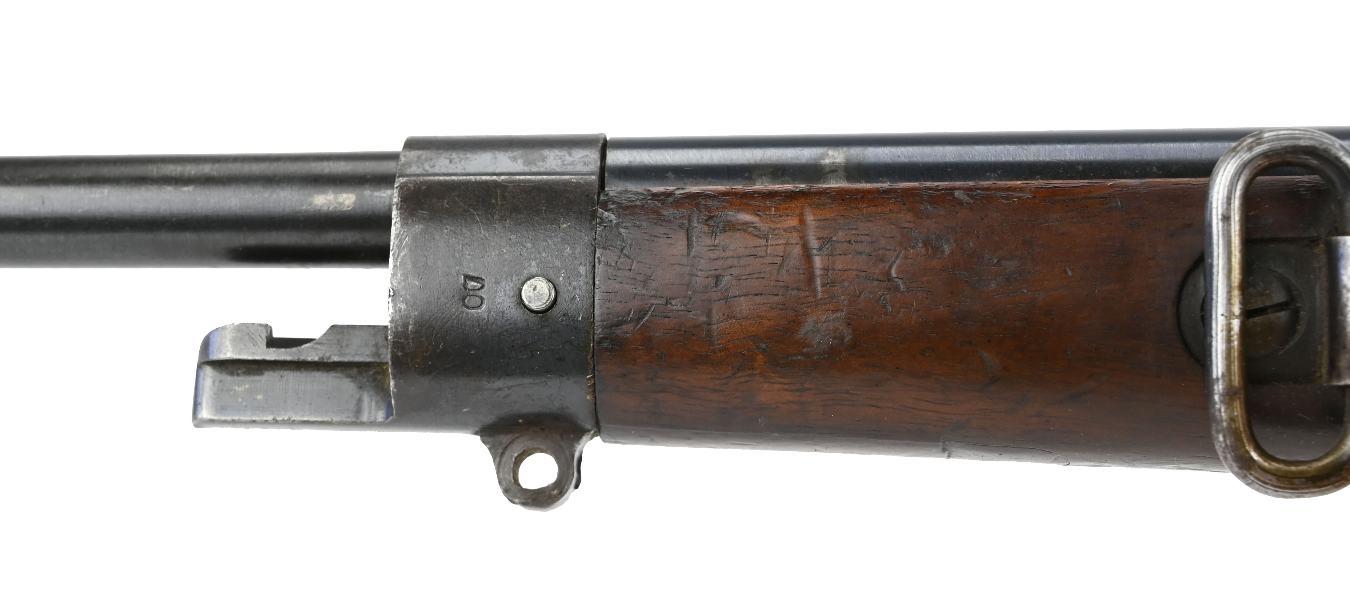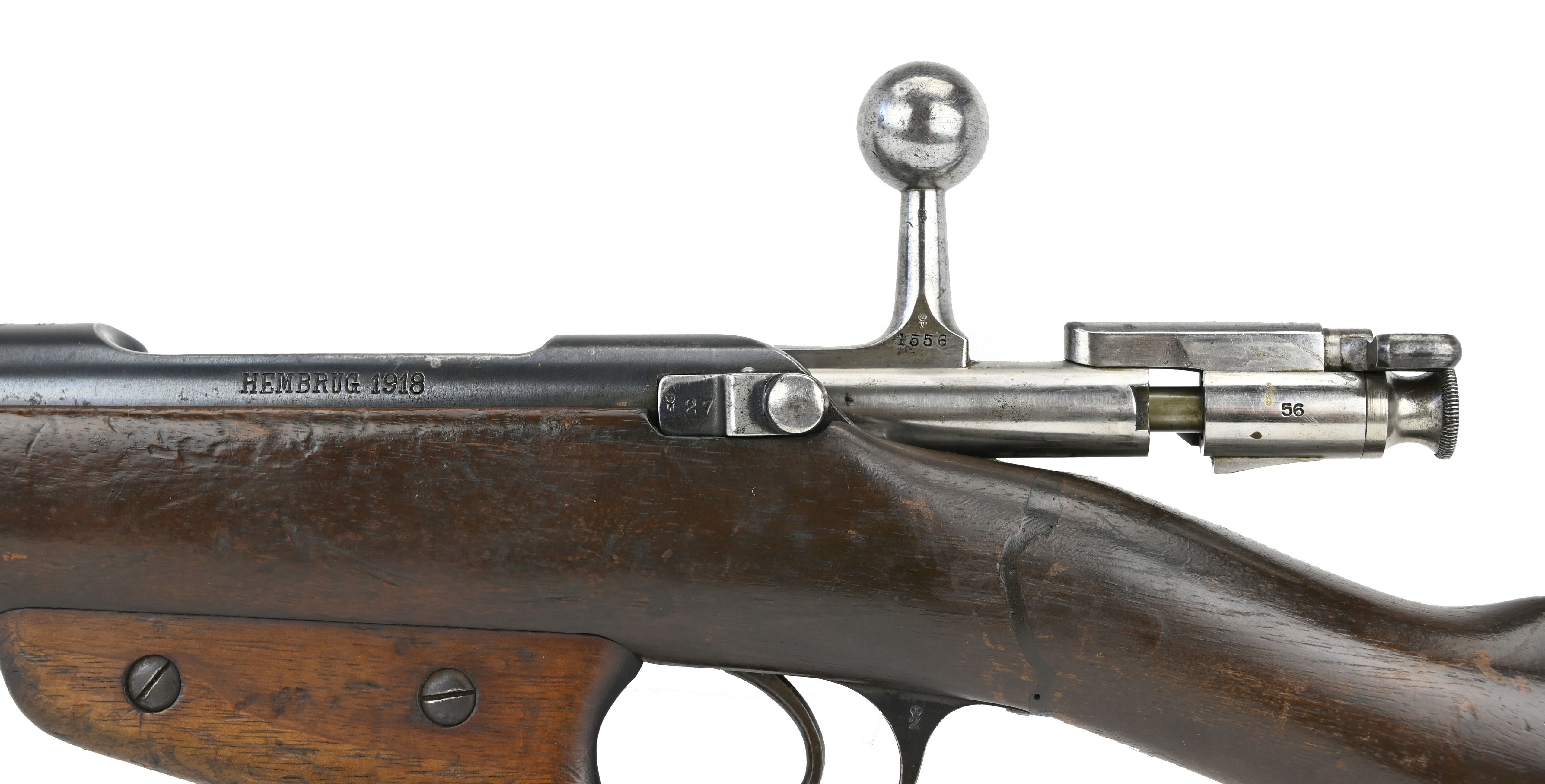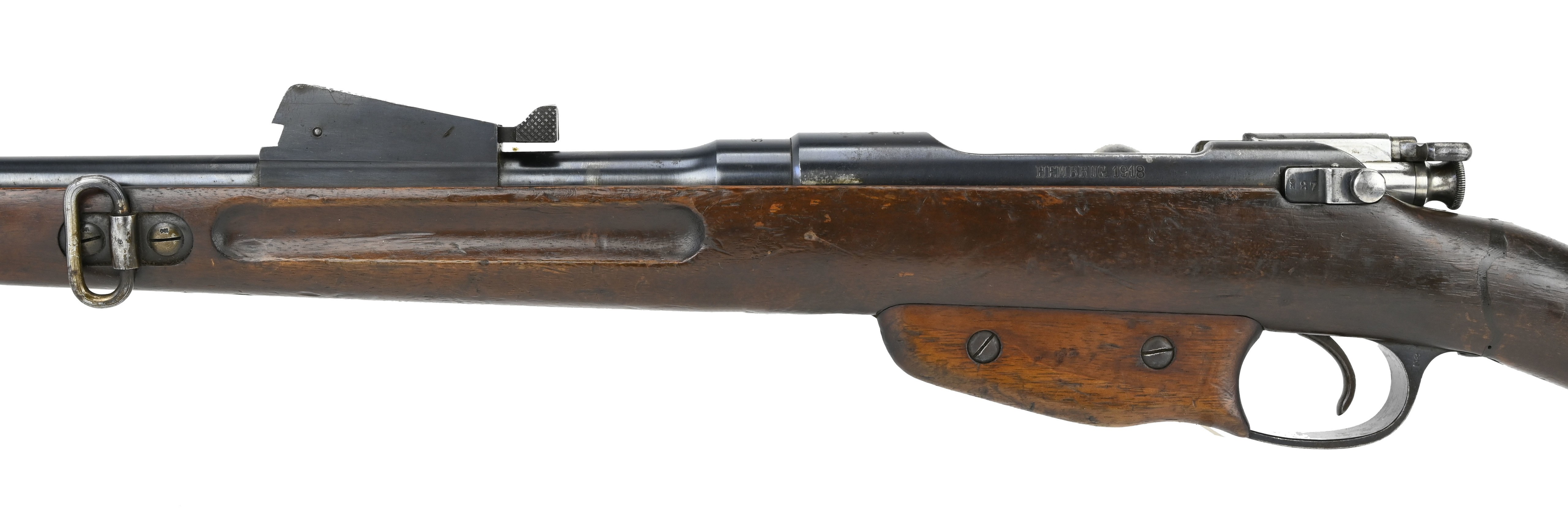 Hembrug 1895 6.5X53R caliber carbine. Dutch Mauser made at the Hembrug Arsenal in 1918. Bolt is now non matching. Bore has strong rifling, and is dark in the grooves. Stock has two repairs; one at the wrist, the other at the toe. Carbine needs upper handguard wood. Good overall condition.
