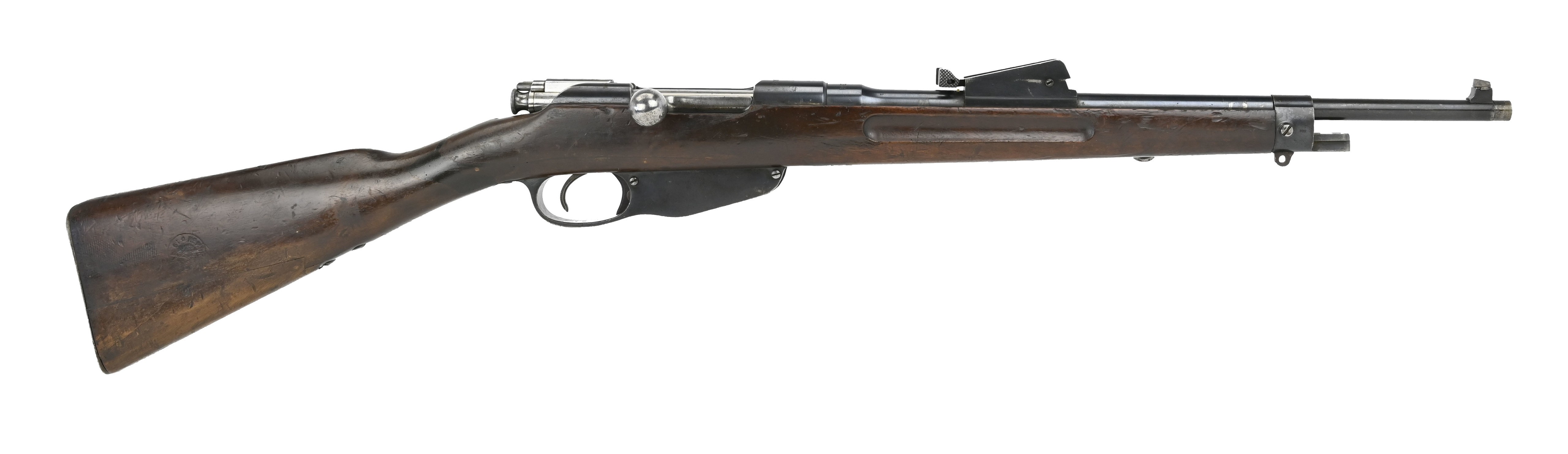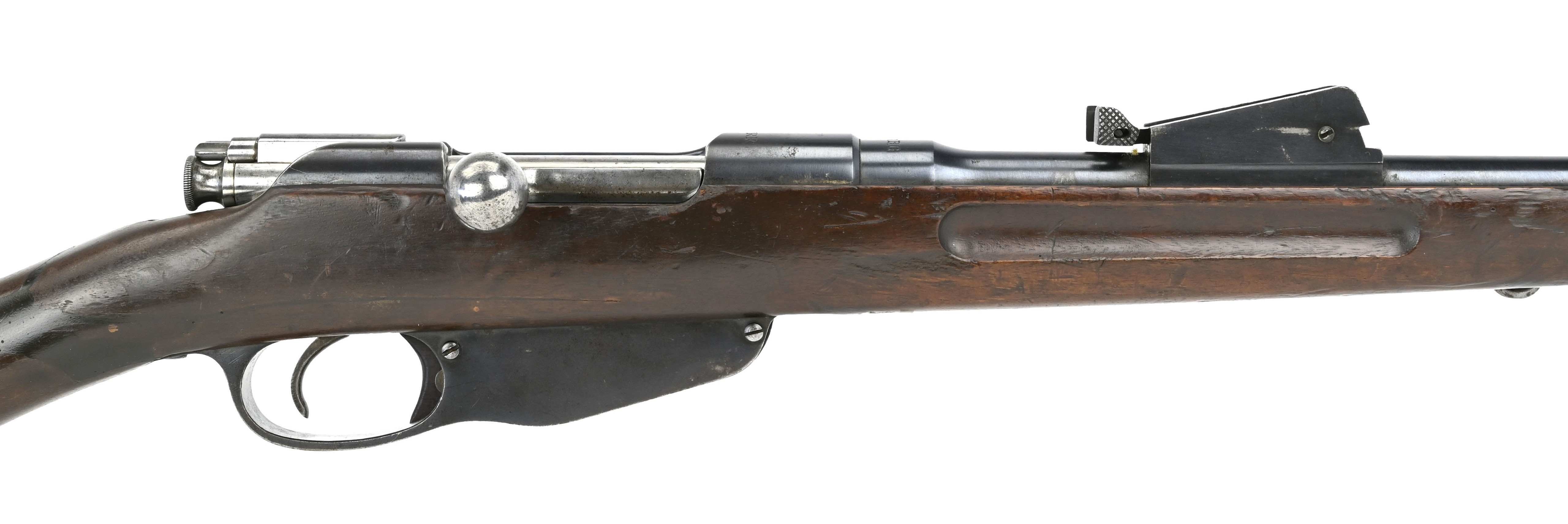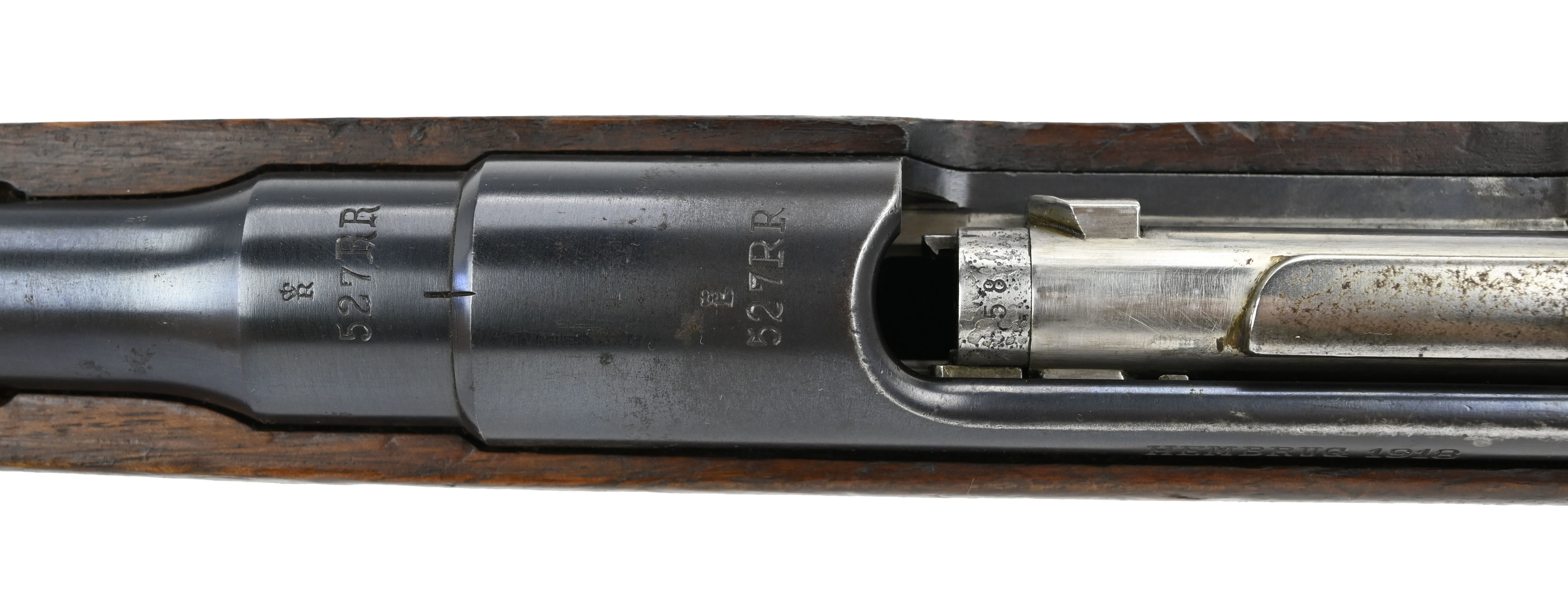 Hembrug 1895 6.5X53R caliber carbine. Dutch Mauser made at the Hembrug Arsenal in 1918. Bolt is now non matching. Bore has strong rifling, and is dark in the grooves. Stock has two repairs; one at the wrist, the other at the toe. Carbine needs upper handguard wood. Good overall condition.