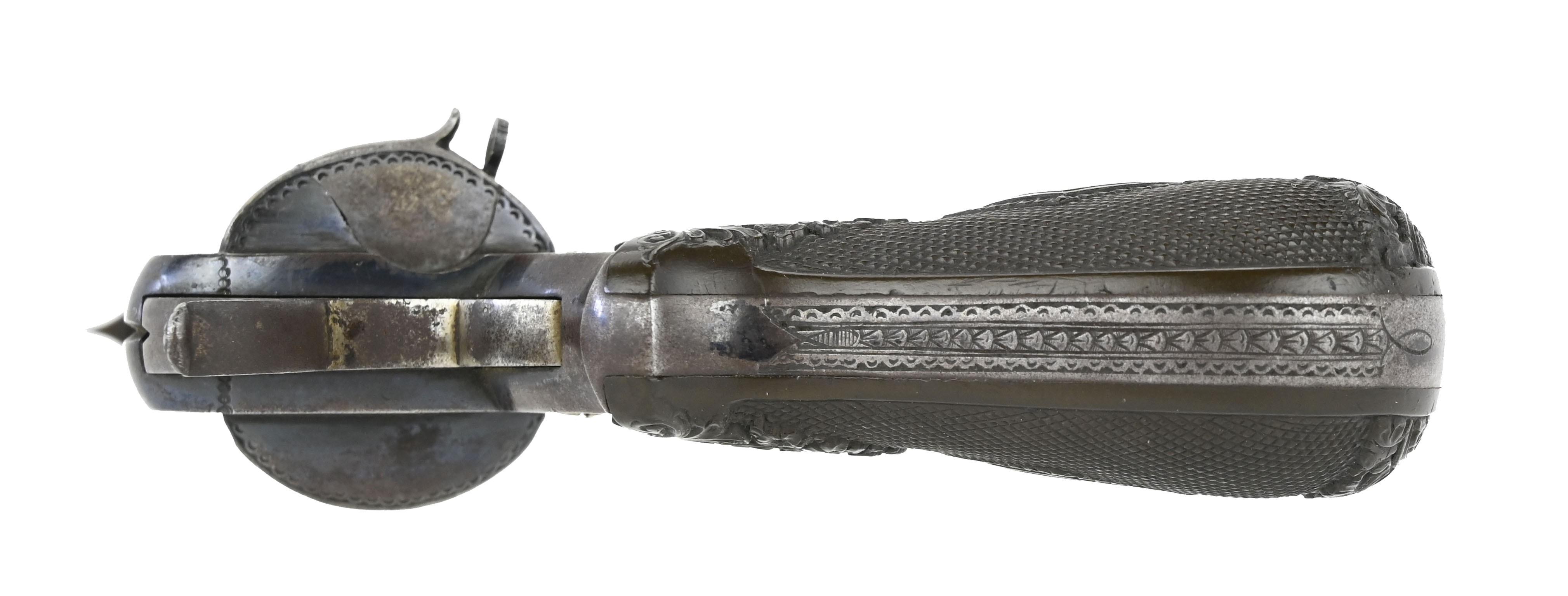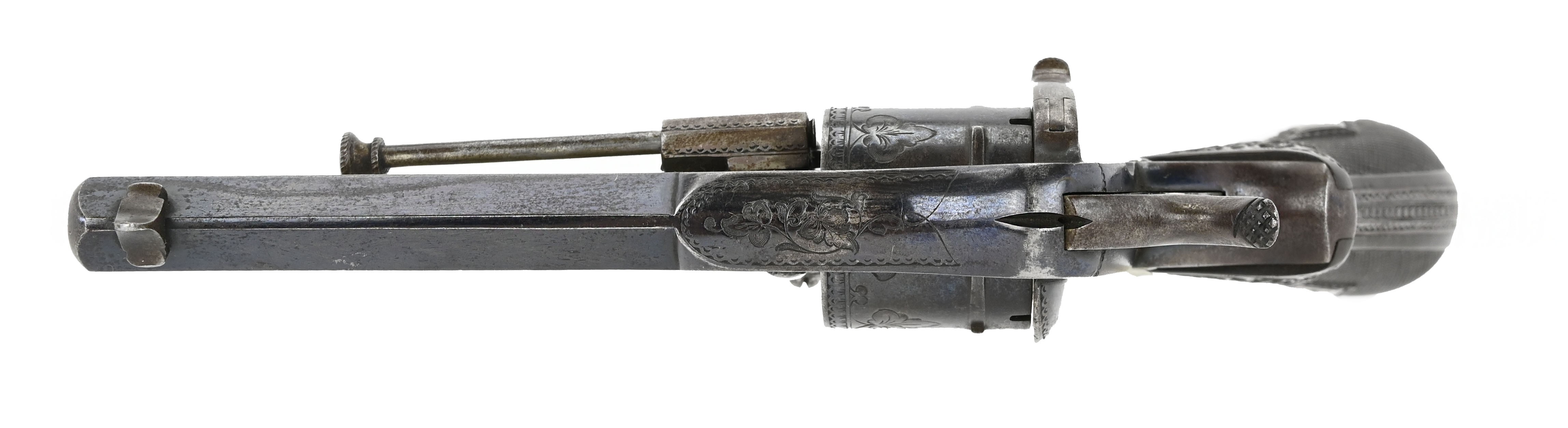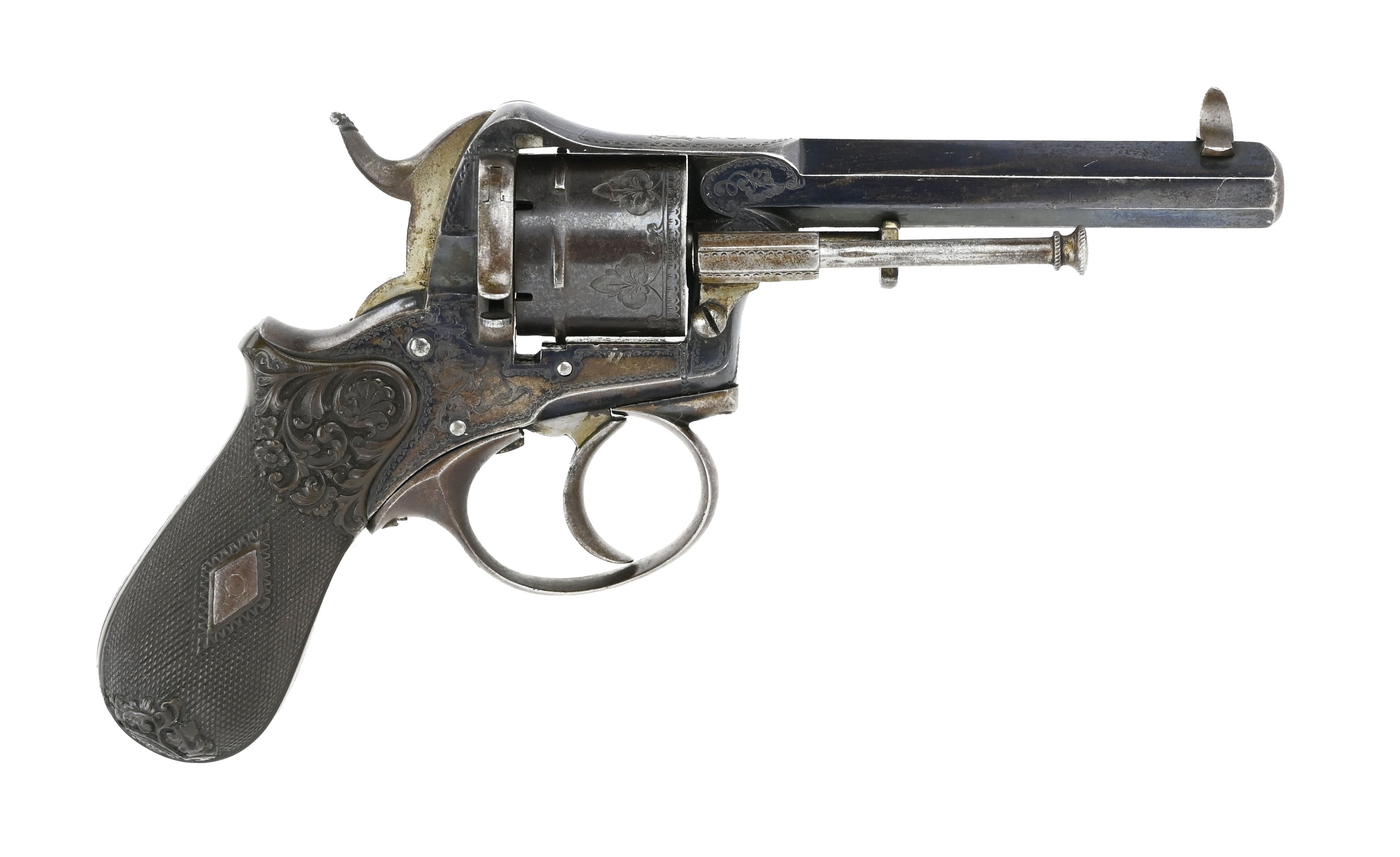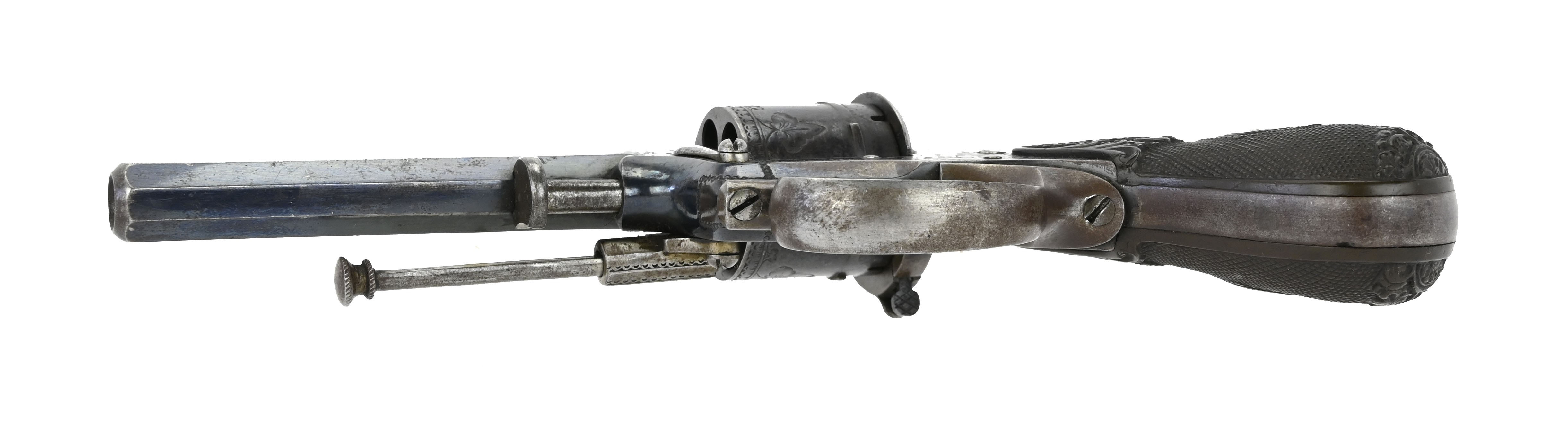 Belgian LeFaucheux Style Pinfire 7mm caliber revolver. Revolver is nicely engraved with a floral motif. Approximately 80% of its finish remains. Gutta Percha grips are very good, no chips or cracks. A handsome Pinfire revolver.