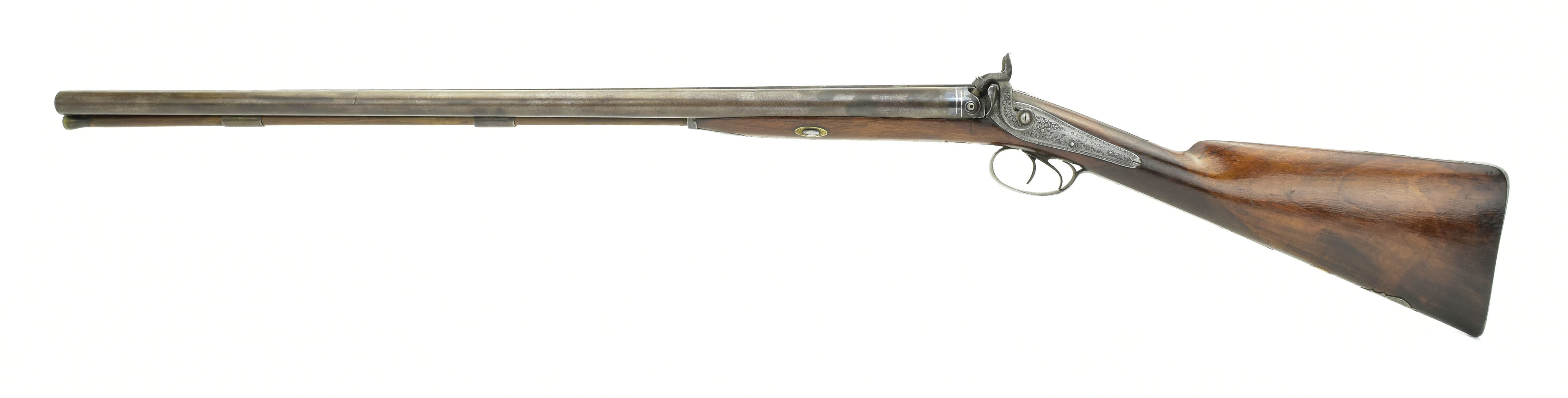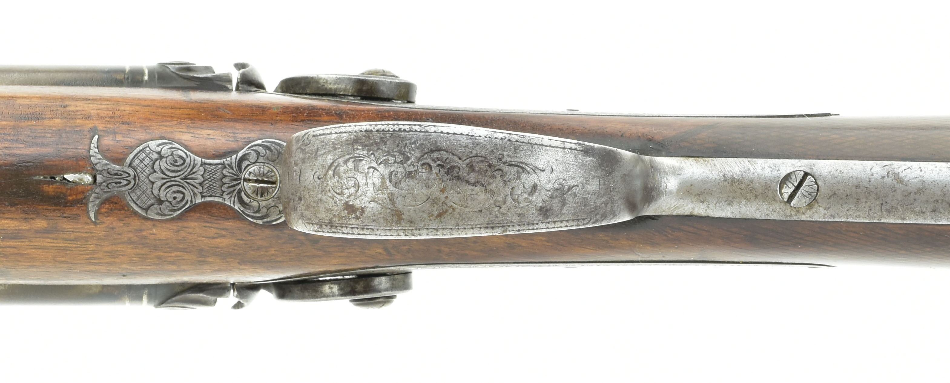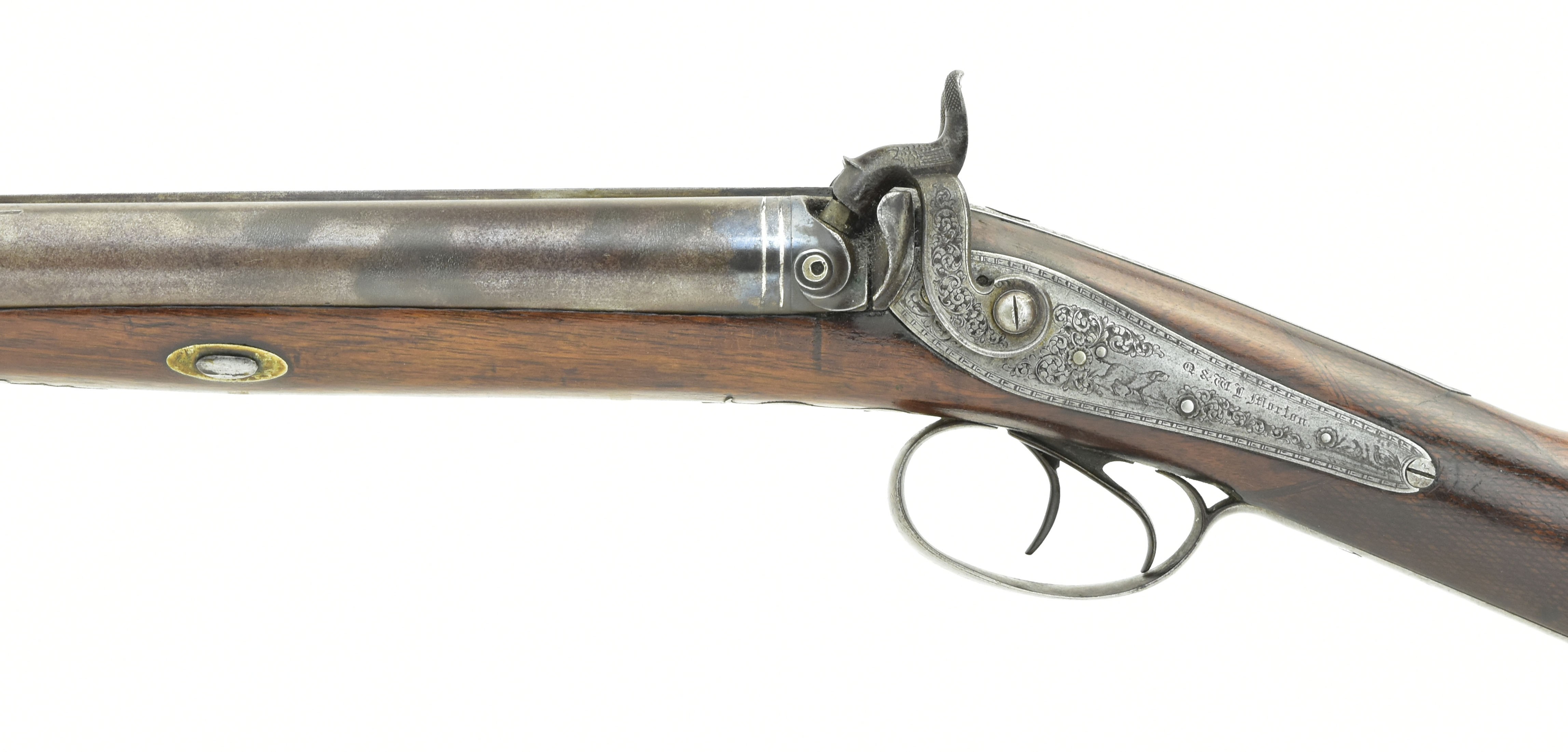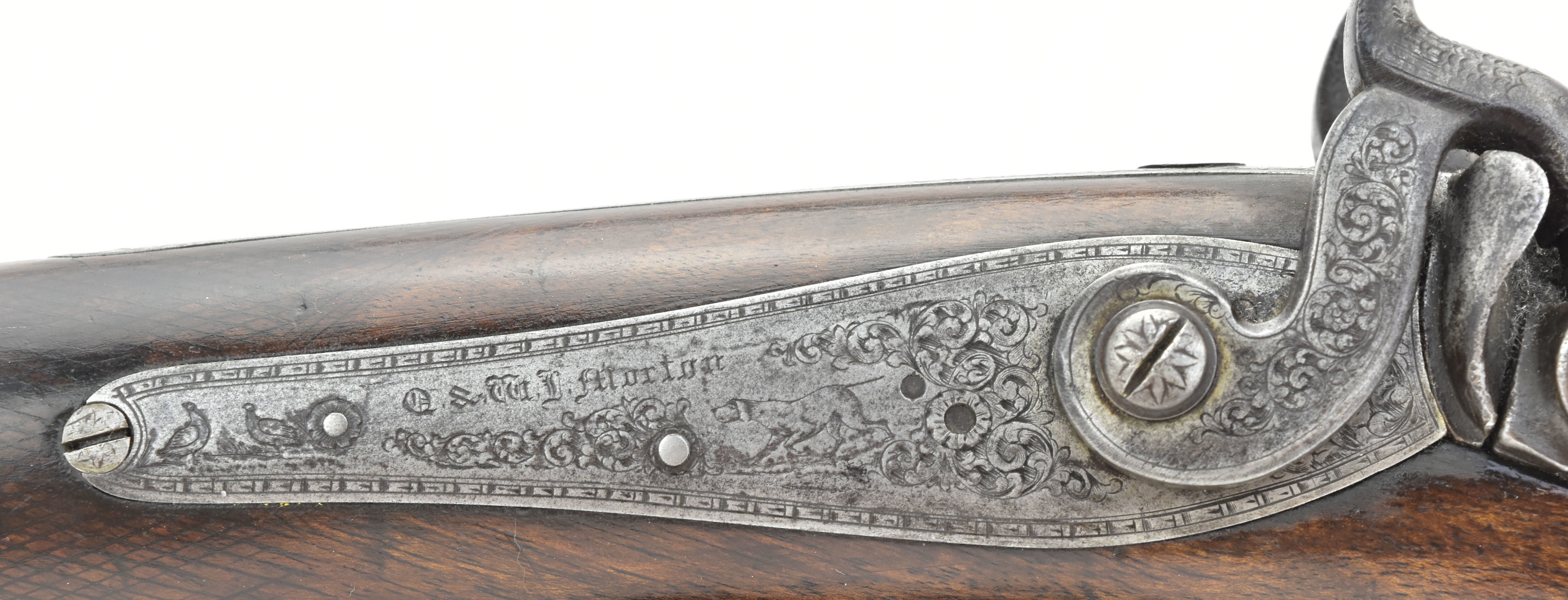 Q. & L. Morton Petersburg Virginia 16 Gauge shotgun. Scarce Southern marked side-by-side double. Q. & L. are listed in the Mercantile Directory on Sycamore in Peterburg in 1851-1852. Top of barrel rib is marked in script “Petersburg, VA”. The engraved lock has dogs on point with grouse and other game birds surrounding by high quality scroll and floral engraving. Other metal parts are engraved ensuite. There is a percussion cap trap on the underside of the butt stock. Bore is 16 Gauge barrel length is 29½” and overall length is 45”. Action works perfectly. This is a Birmingham proofed English shotgun made for the American market. This was common practice with American dueling pistols in the Philadelphia area and other East coast cities where the barrels bear the dealers name but not the English markers name but do bear the English proofs. The stock has an old refinish. This is a Southern shotgun sold by a known dealer in Petersburg, VA.