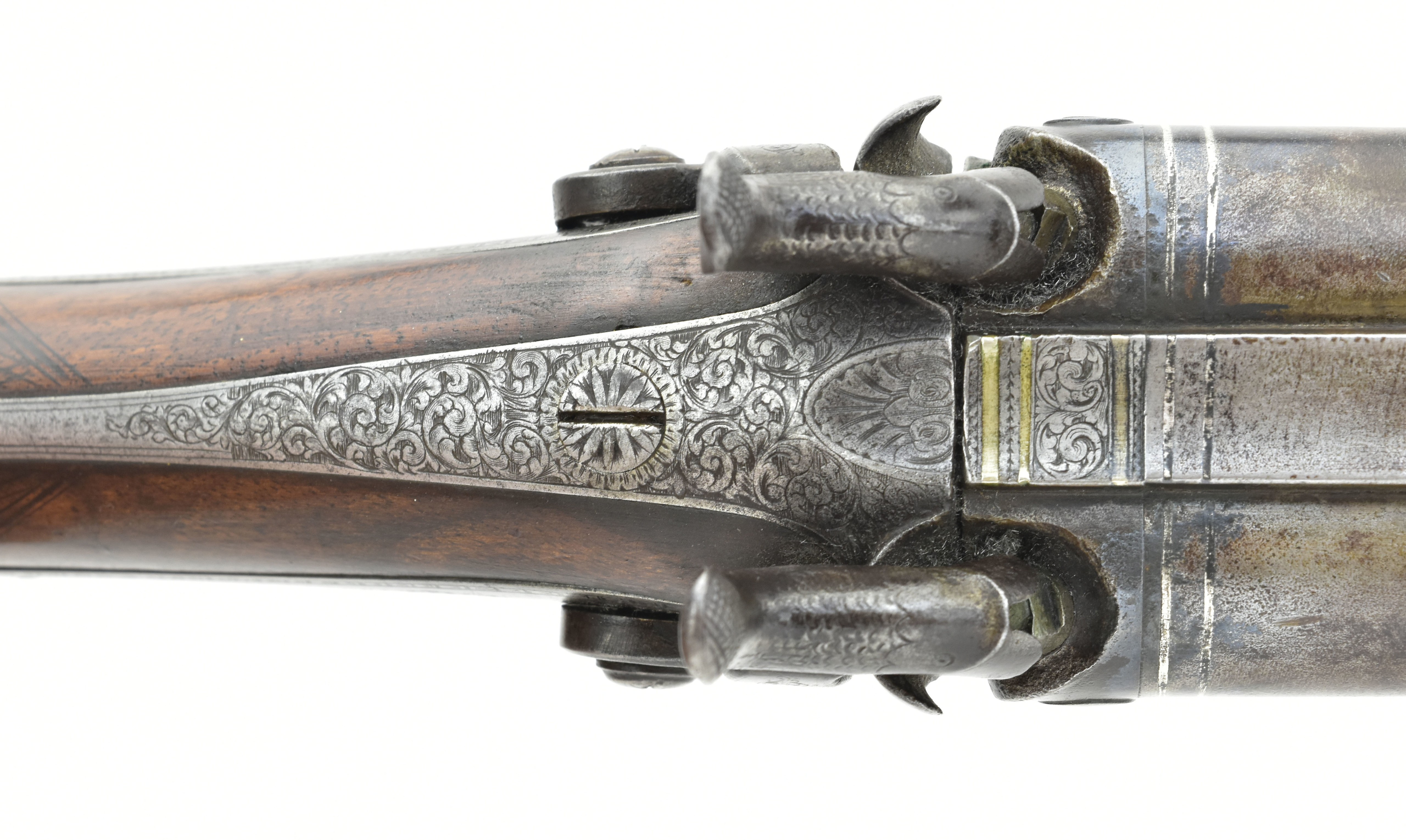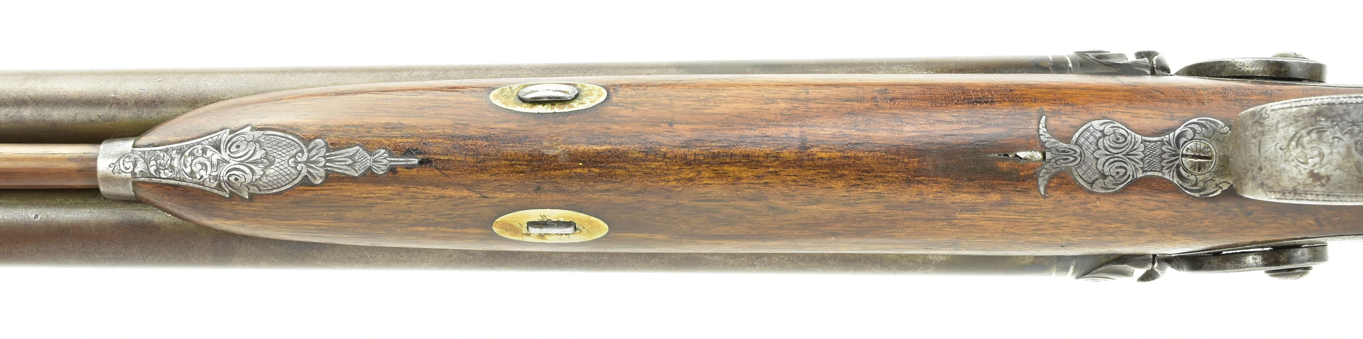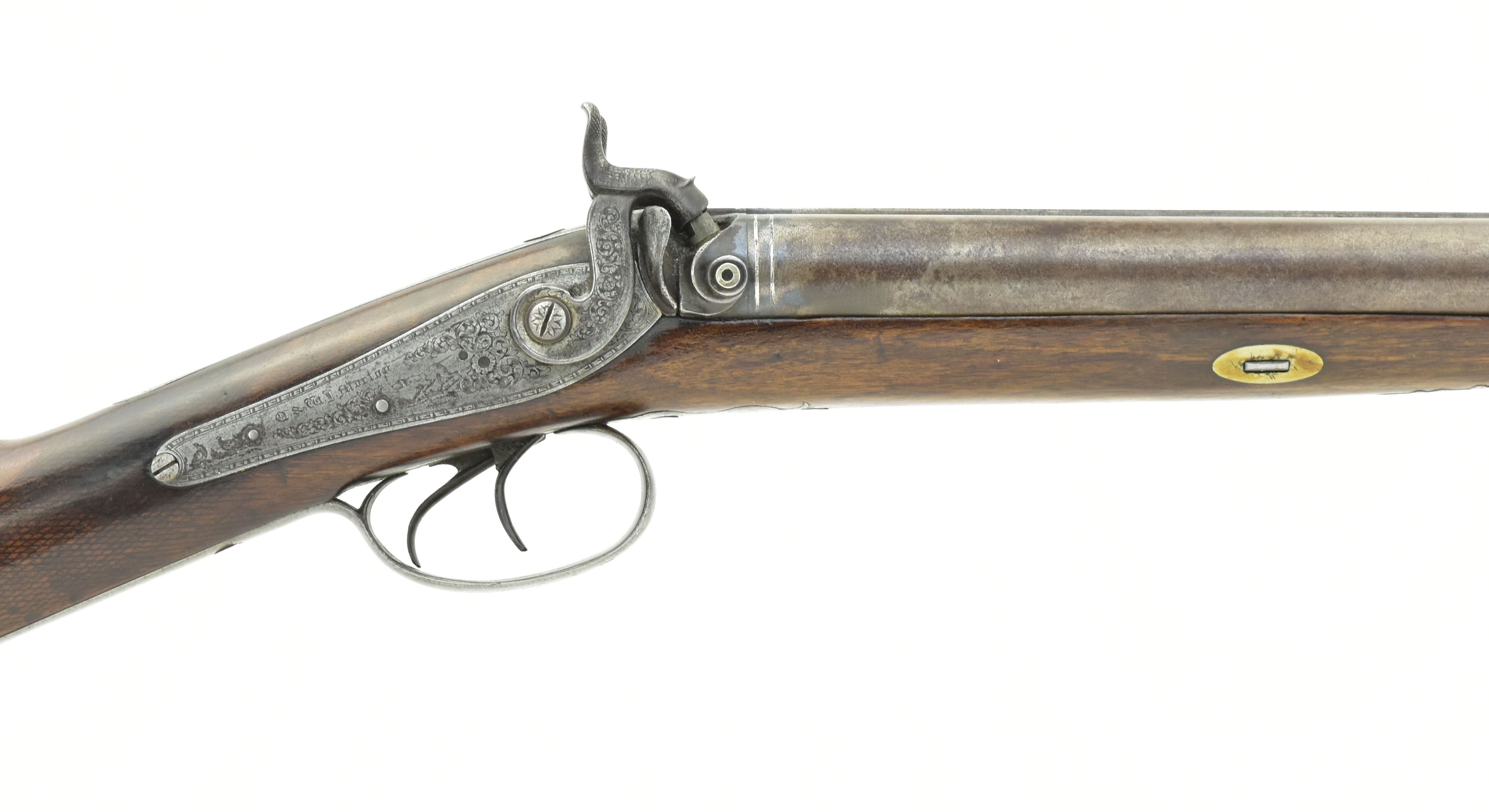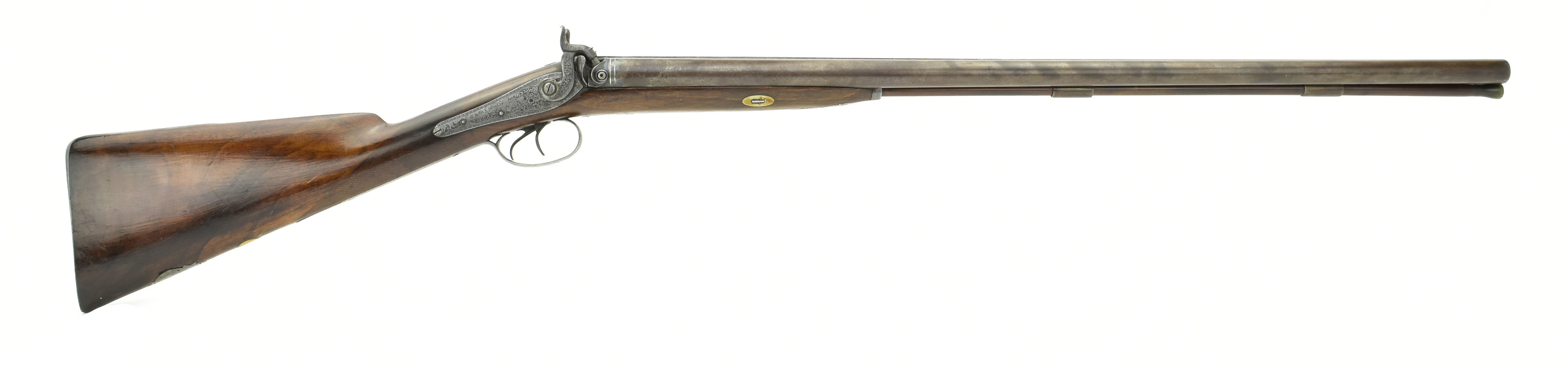 Q. & L. Morton Petersburg Virginia 16 Gauge shotgun. Scarce Southern marked side-by-side double. Q. & L. are listed in the Mercantile Directory on Sycamore in Peterburg in 1851-1852. Top of barrel rib is marked in script “Petersburg, VA”. The engraved lock has dogs on point with grouse and other game birds surrounding by high quality scroll and floral engraving. Other metal parts are engraved ensuite. There is a percussion cap trap on the underside of the butt stock. Bore is 16 Gauge barrel length is 29½” and overall length is 45”. Action works perfectly. This is a Birmingham proofed English shotgun made for the American market. This was common practice with American dueling pistols in the Philadelphia area and other East coast cities where the barrels bear the dealers name but not the English markers name but do bear the English proofs. The stock has an old refinish. This is a Southern shotgun sold by a known dealer in Petersburg, VA.