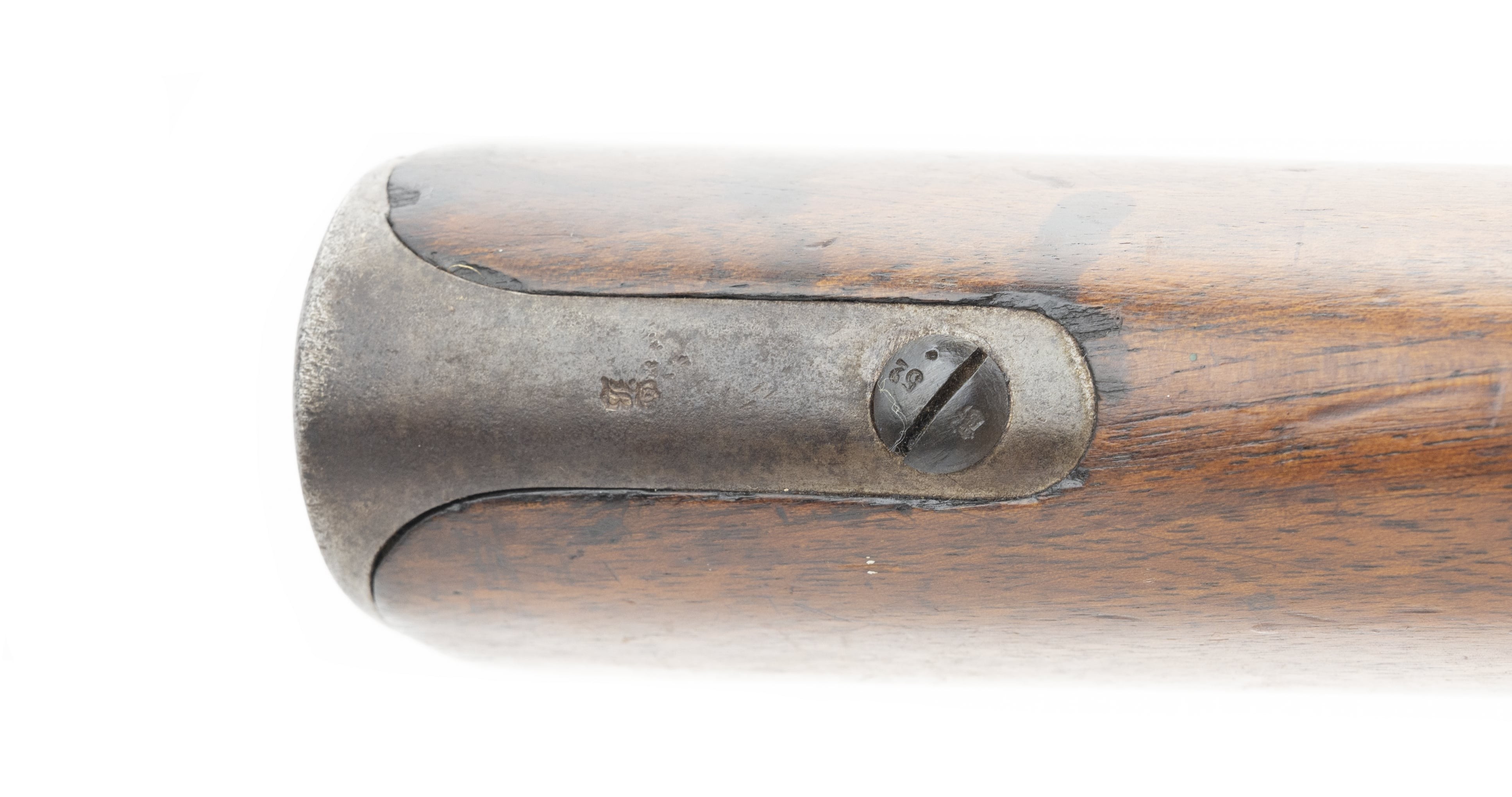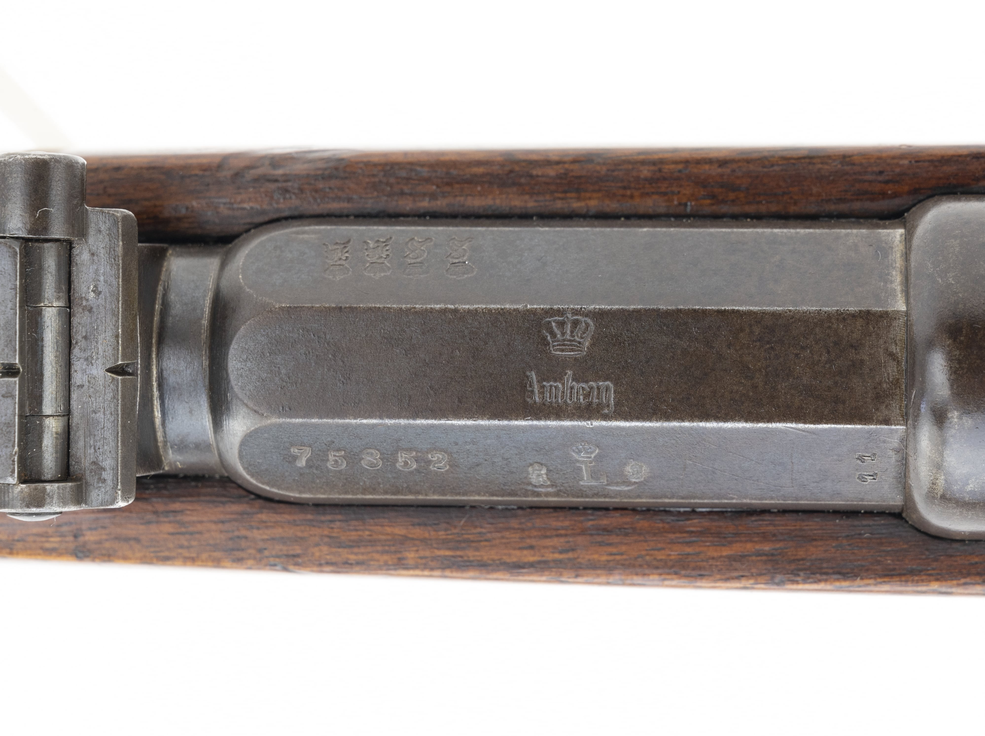 Imperial German Model 71/84 Mauser 11mm caliber rifle. Infantry rifle made by the Amberg arsenal in 1887. The 31½” Round barrel has an excellent bore. Metal has approximately 85% blue fading to brown. The stock is very good with scattered issue dings and dents. There are no cracks or chips and the various inspection stamps are all very visible. Action functions correctly. Now for the best part, everything is matching (75852) including: the screws, butt plate, bolt, bands, nose cap, trigger guard, etc. This is a very nice example of a matching model 71/84 Imperial German infantry rifle.