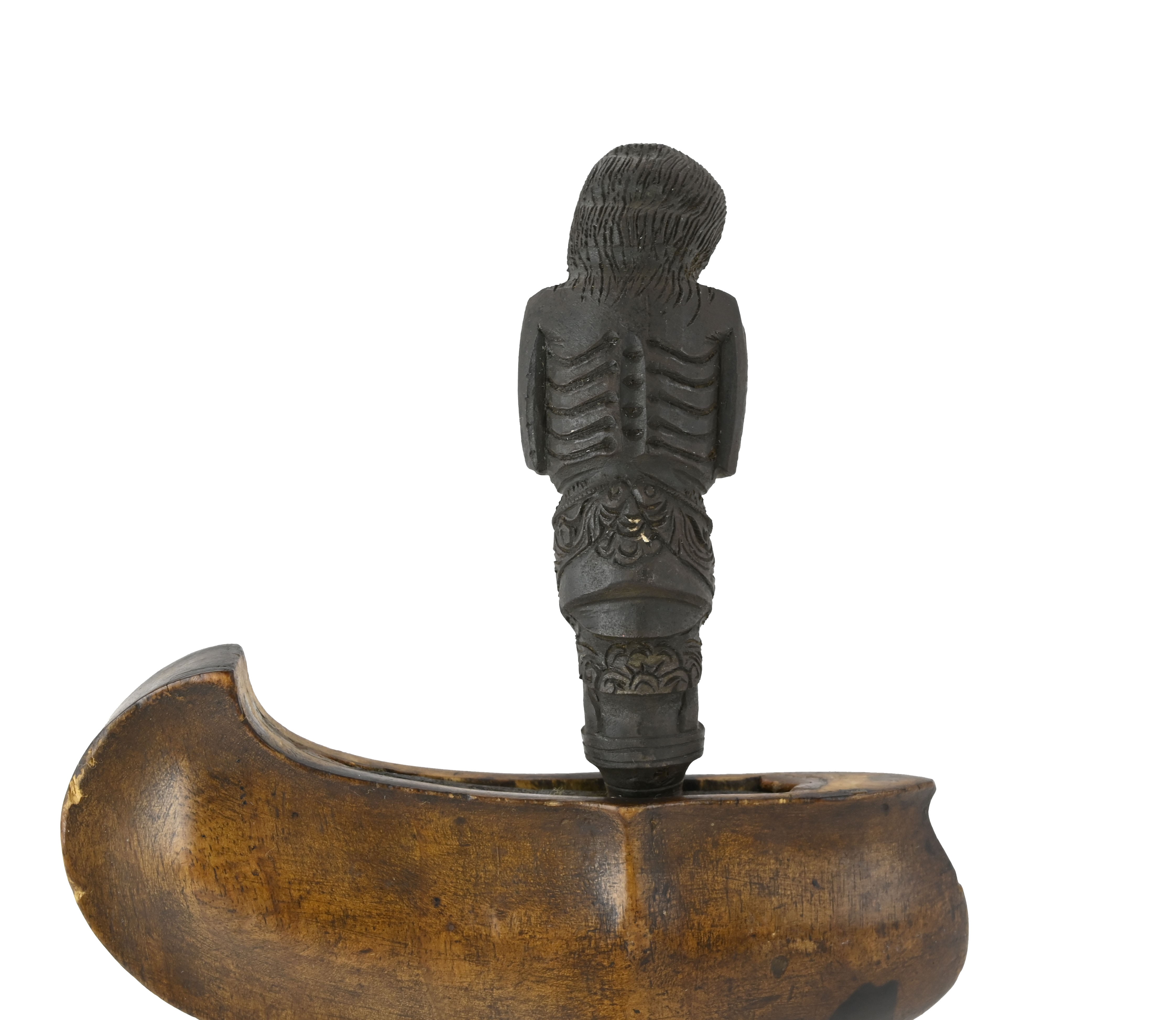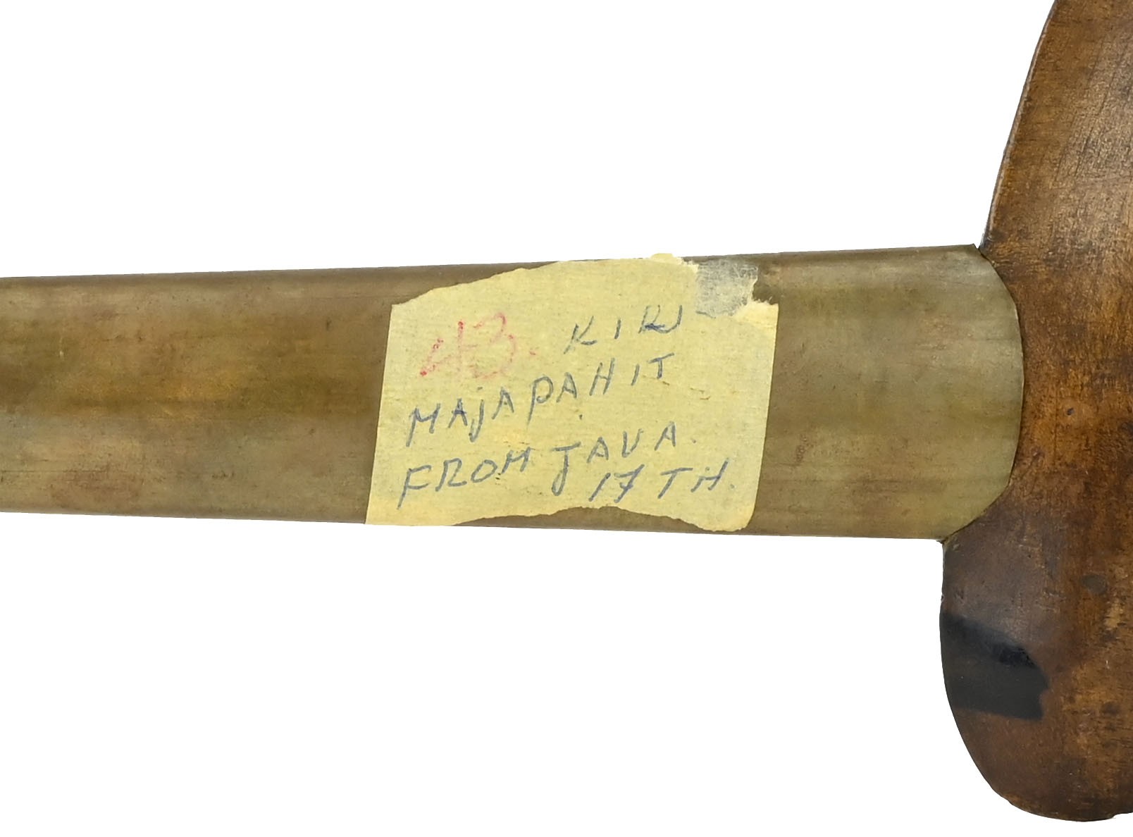 Rare Type Indonesian Kris. The watered blade is 13 ½” long and has an area 5” from the hilt where the blade parts as (see through rivulets) giving the impression of running water at the hilt. There is a chiseled “effigy” of a deity? There is an iron statue of a figure of a man with hands clasped together and the face gives the impression of prayer or deep thought. The sheath is more typical of the usual style seen on a kris (or keris). There is a taped note on the sheath (Kirs Majapahit from Java 17th). Over many years we have sold at least 300 kris, but never had one like this. It is a bit pricey but it is really different and very well made. Comments are welcome!