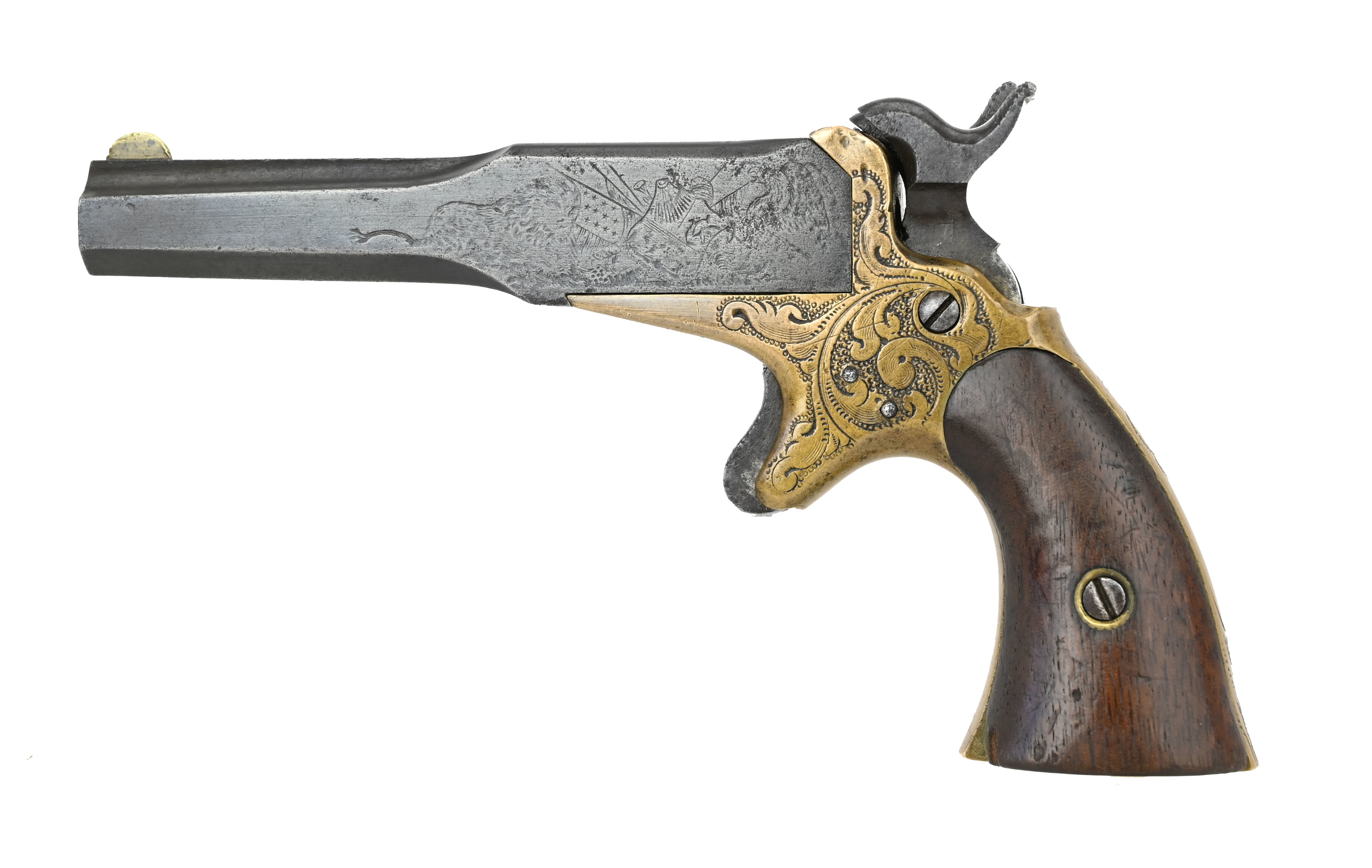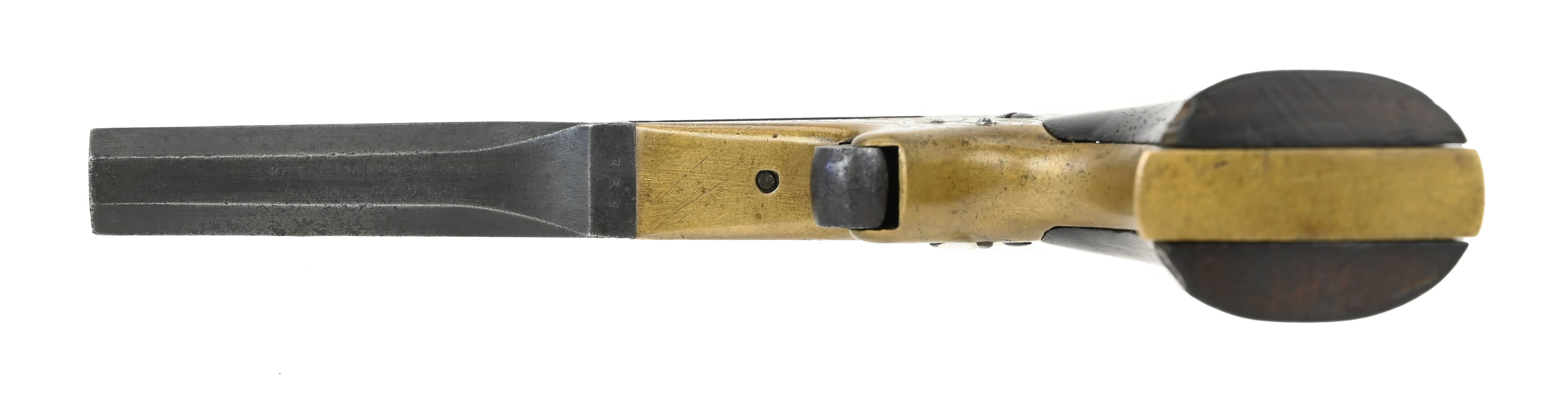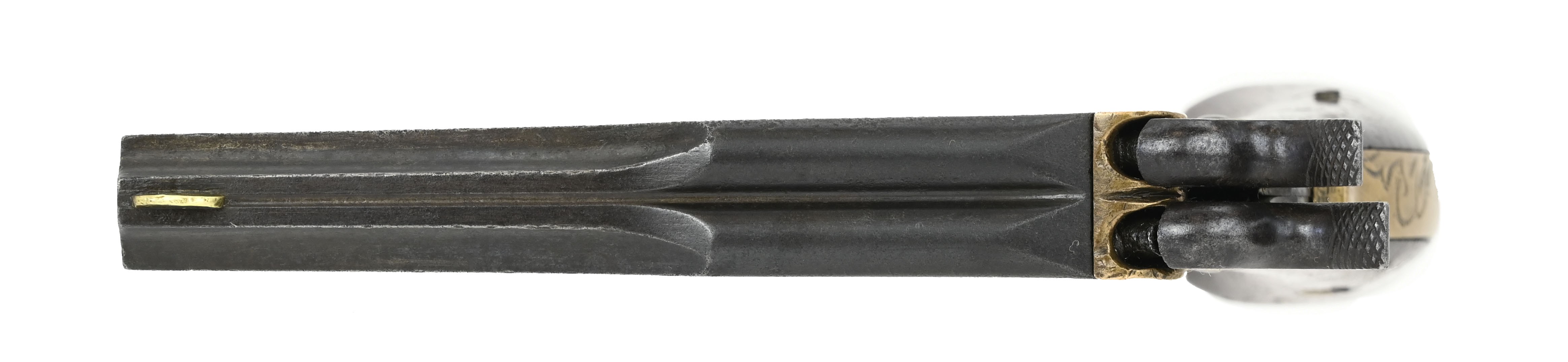 Lindsay Two Shot Pocket Pistol. This is a superposed load where the percussion loads were stacked on top of each other. The double hammers fired in proper sequence squeezing the trigger drops the hammer on the load most forward while squeezing again drops the other hammer on the rear load. Brass frame is scroll engraved. The .41 caliber barrel right side of barrel is marked Lindsay’s Young America, Manufactured by J.P. Lindsays Man’F’D Co. New York. Left side of barrel has a wild animal (lion?), star studded flags and an eagle?. The right side of the barrel has easily visible lettering. The left side with the scene is worn. Rare pistol of derringer size.