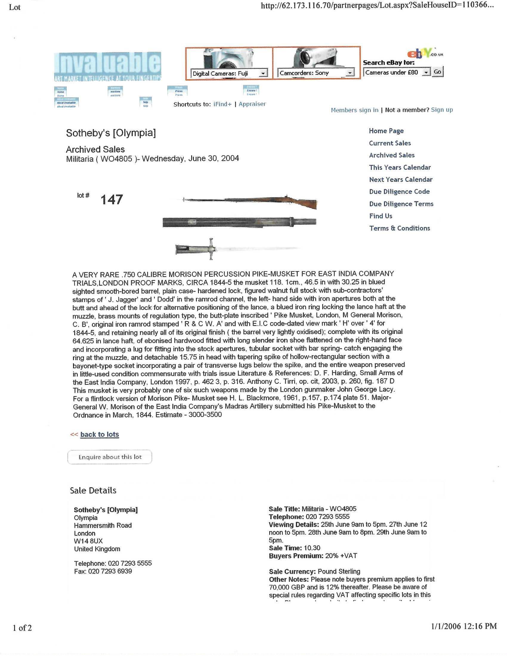 Unusual English percussion musket with attached rest. The top of the barrel is marked “Rest Musket No 2” and the lock is marked “M. GenL W. Morison. C.B.”. While we have been unable to find information on this Rest-musket, Blackmore (British Military Firearms 1650-1850) documents that Gen. Morison proposed a flintlock pike-musket to the East India Company in March 1844 (p. 157). The pictured (p. 174, plate 51) appears to stow the pike in a similar manner to the Rest-musket. The overall length is 55”. The 39” round .75 caliber smoothbore barrel has a fine bore. The barrel retains approximately 90% original brown. It has fixed rear and front sights. There is also a bayonet lug forward of the front sight and 1½” from the muzzle. The nose cap has a protruding spring bayonet catch, probably for an 1839 type bayonet. The lock and hammer have a smooth gray/brown patina. They each have edge lines. The brass trigger guard, pipes (two), and butt plate are fine. Two swivels and the ramrod are present. The stock is very good with a checkered wrist, scattered use/storage dents and dings, no chips or cracks. The attached rest is approximately .07” in diameter. It stows along the left side of the stock. The stock is grooved at the lower left flat and the upper butt area to accommodate it. It is secured by a spring clip just forward of the butt plate. The barrel has London proof marks. The action functions correctly. The barrel is key-fastened. This is a very interesting, very well-made musket with Gen. Morison’s “good idea” of an attached rest that was not adopted. We have never seen or heard of another. It you’re into unusual British musket, this one is for you!