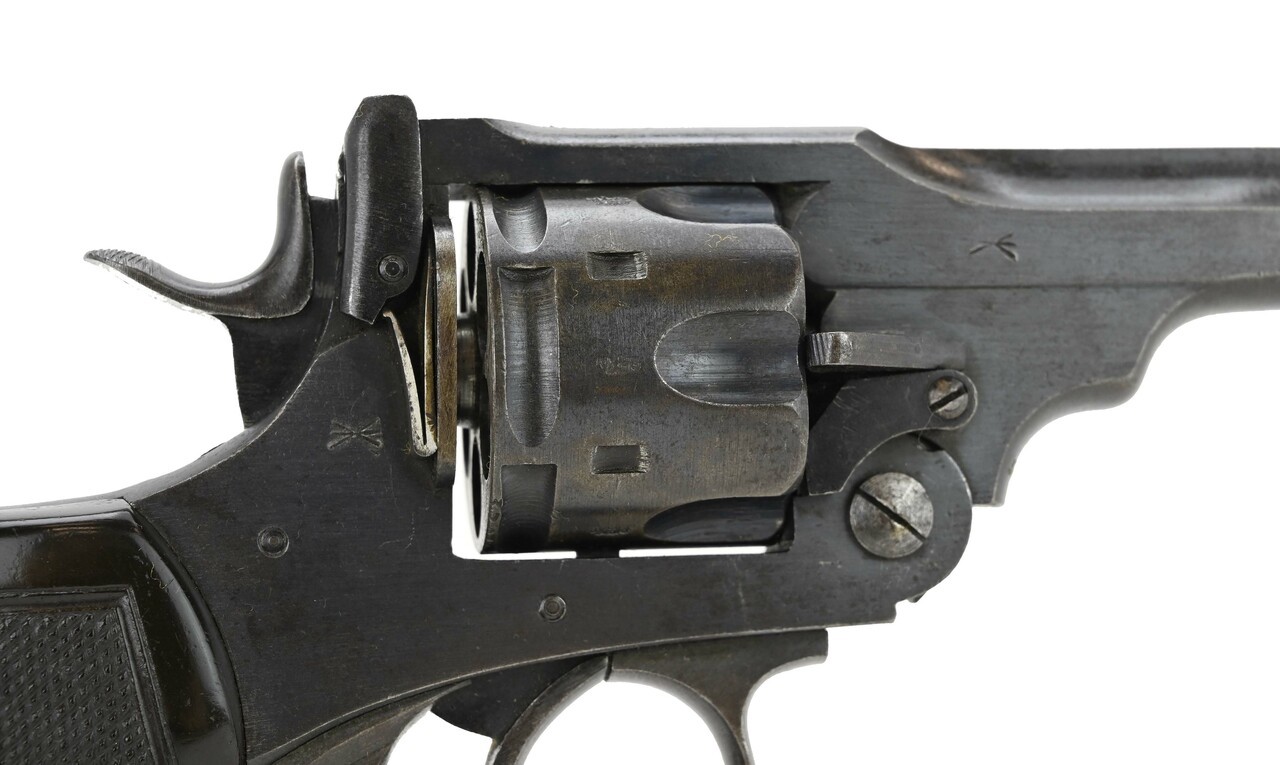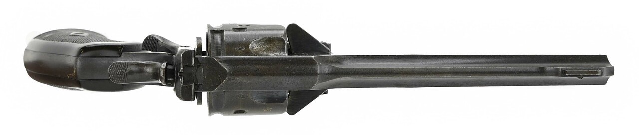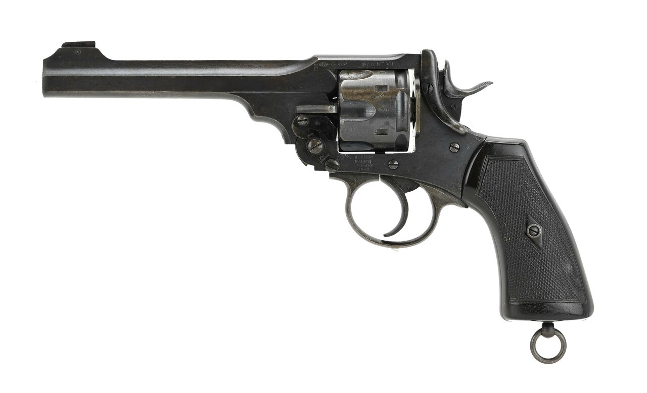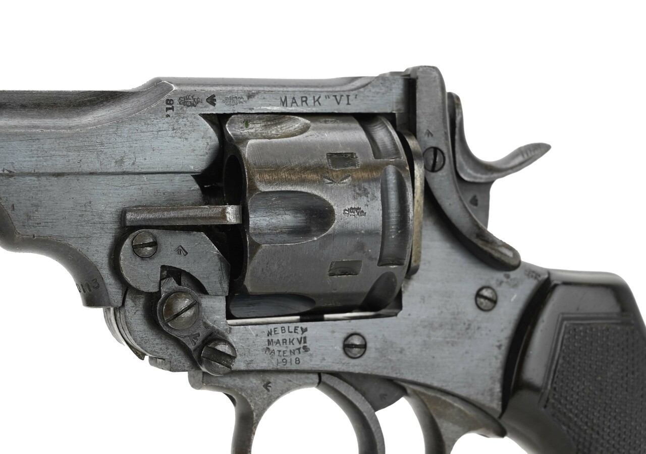 Webley Mark VI .45 ACP caliber revolver. Near excellent Mark VI. Barrel length is 6 inches. Bore is perfect and mirror bright. Revolver has approximately 90-93% original blue. Action works perfectly. Grips are excellent, no chips or cracks. Note: This is a .455 caliber altered when imported to the USA as were many others. The rear face of the cylinder was milled off to allow the rechambering to .45 ACP using half moon clips. Great WWI revolver that you can collect or shoot!