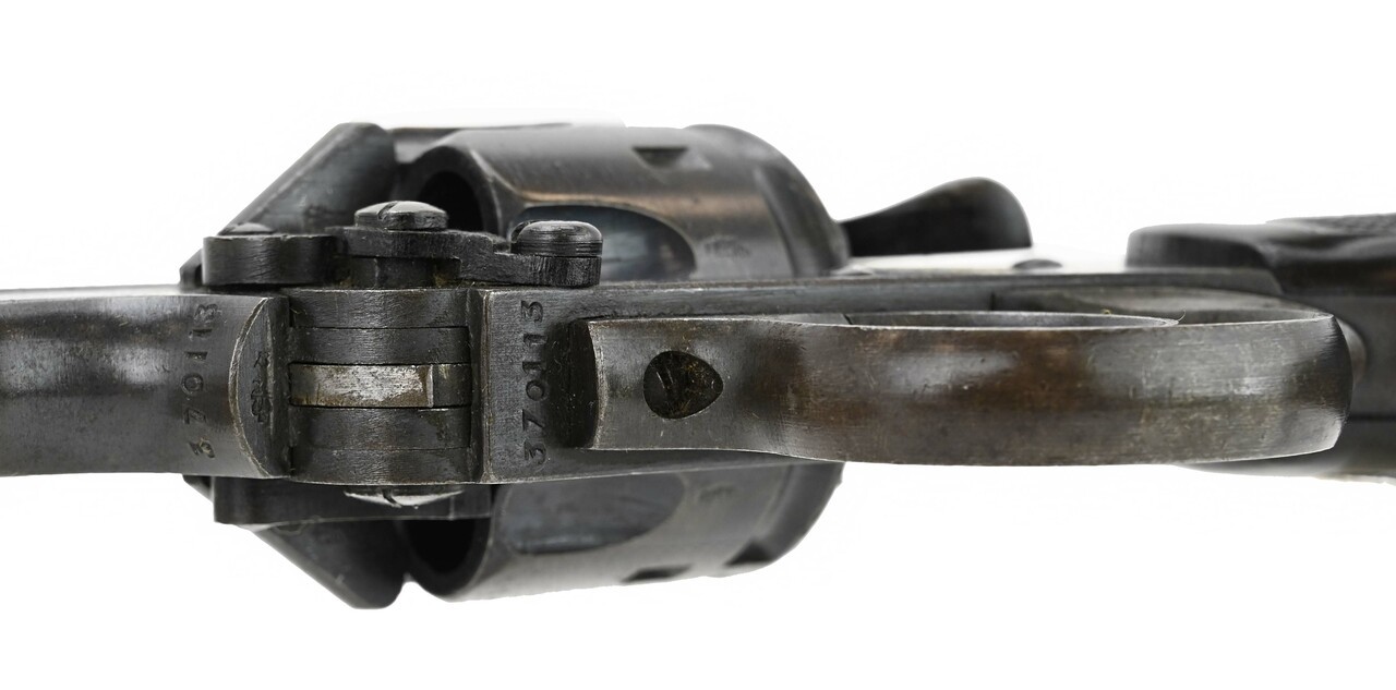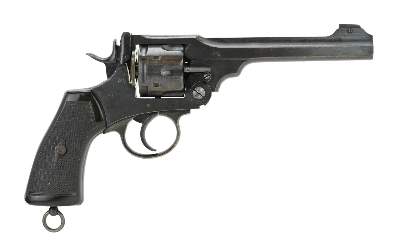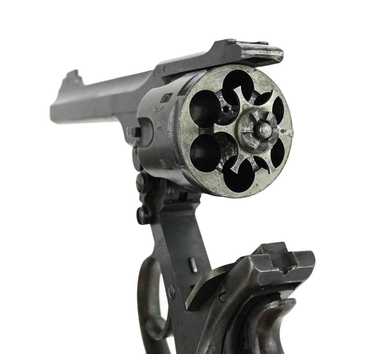 Webley Mark VI .45 ACP caliber revolver. Near excellent Mark VI. Barrel length is 6 inches. Bore is perfect and mirror bright. Revolver has approximately 90-93% original blue. Action works perfectly. Grips are excellent, no chips or cracks. Note: This is a .455 caliber altered when imported to the USA as were many others. The rear face of the cylinder was milled off to allow the rechambering to .45 ACP using half moon clips. Great WWI revolver that you can collect or shoot!