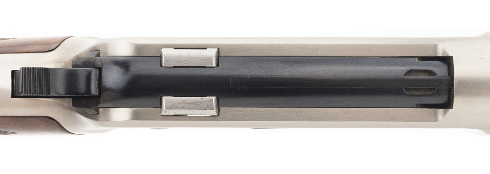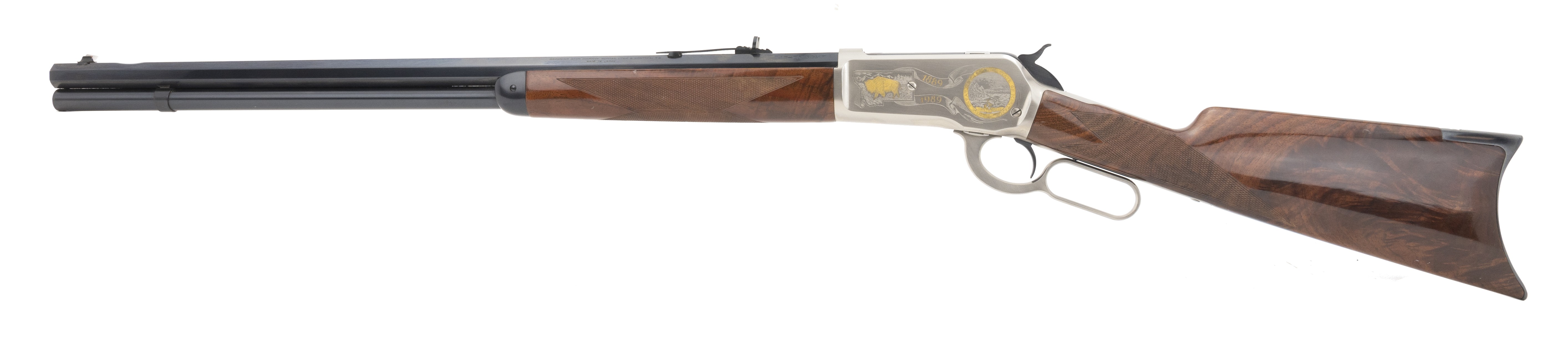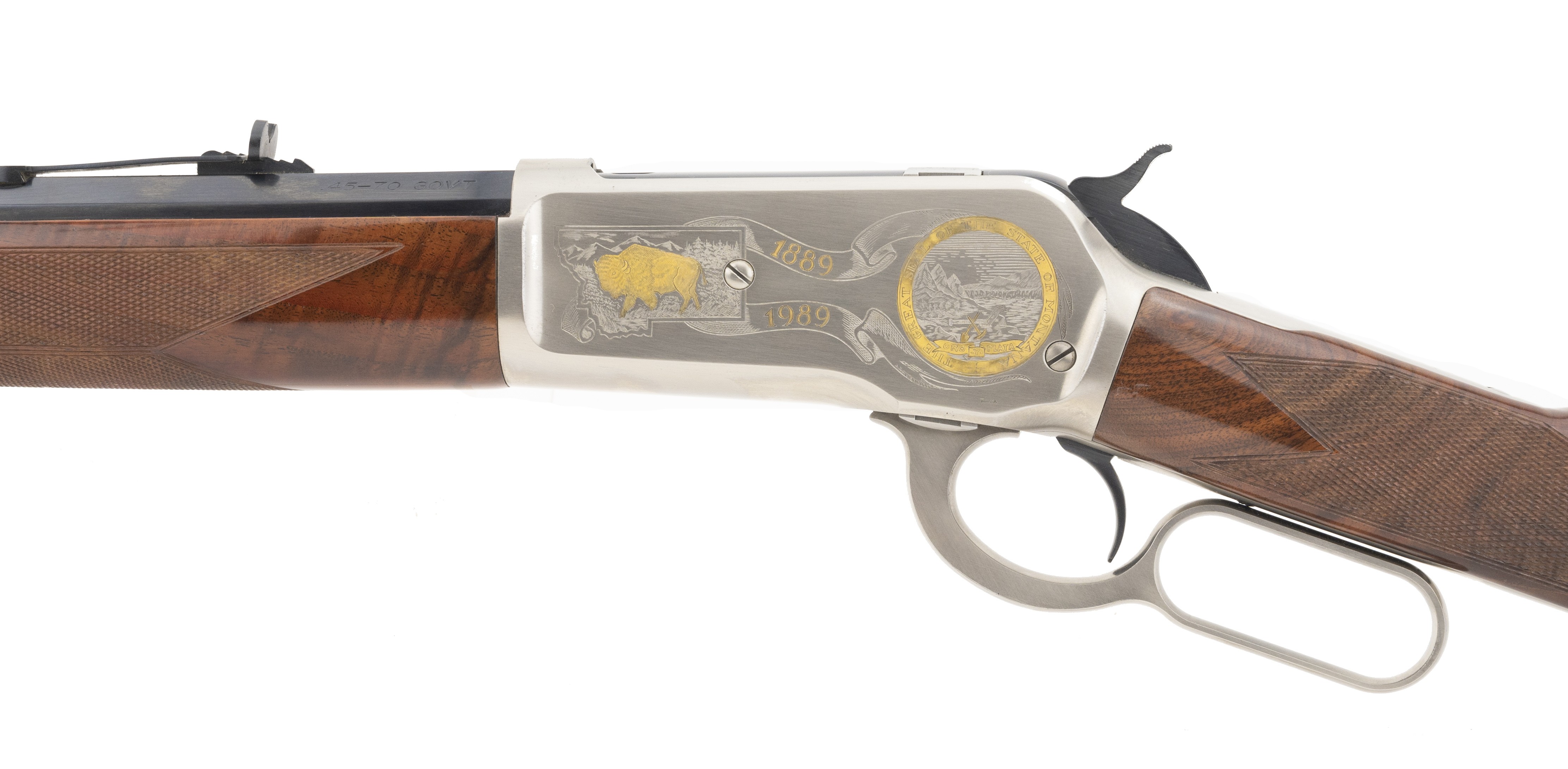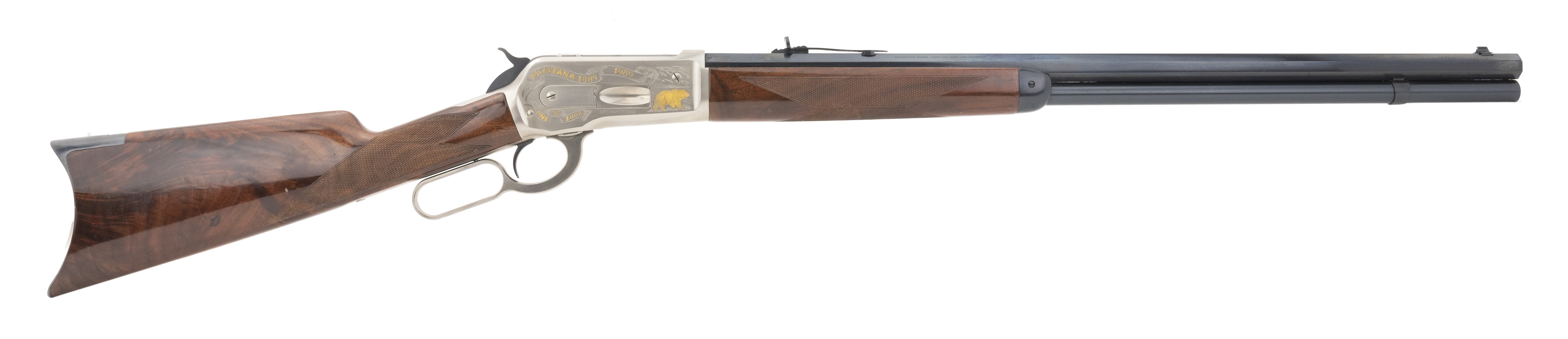 Limited edition deluxe Montana 1886 rifle with nicely figured walnut stocks, and satin nickel receiver with gold inlays. Has some minor nicks in the stock, otherwise near excellent overall condition. A fine looking 1886 rifle!