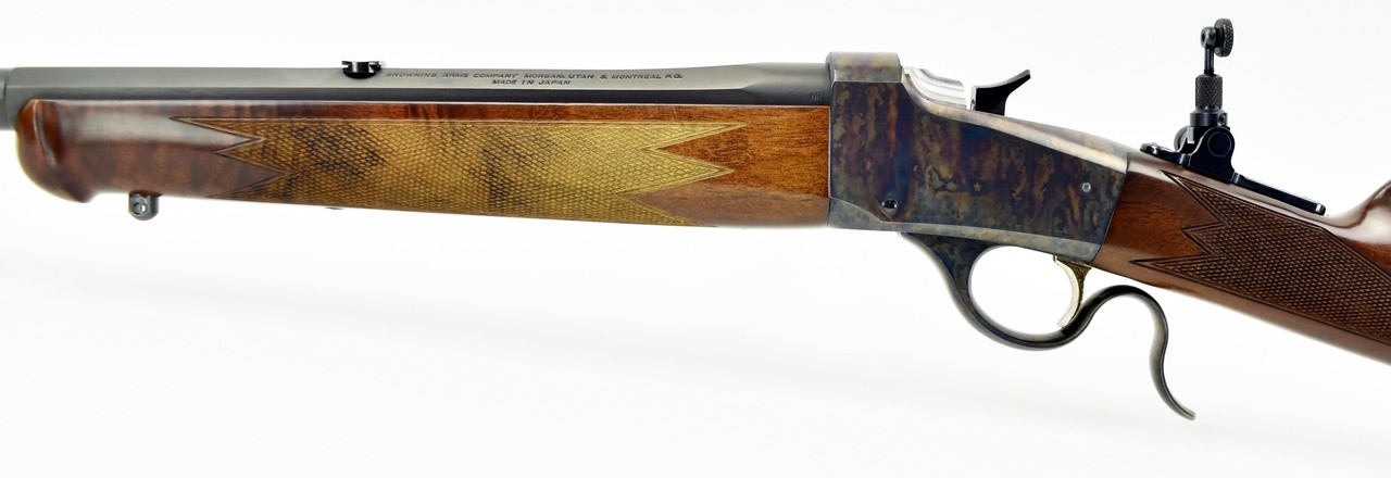 Browning 1885 .45 Colt caliber carbine. Deluxe low wall carbine with 24” half round, half Octagon barrel, case colored receiver and checkered walnut stock. Has Tang peep sight and crescent Buttplate. Unusual .45 Colt caliber in excellent condition.