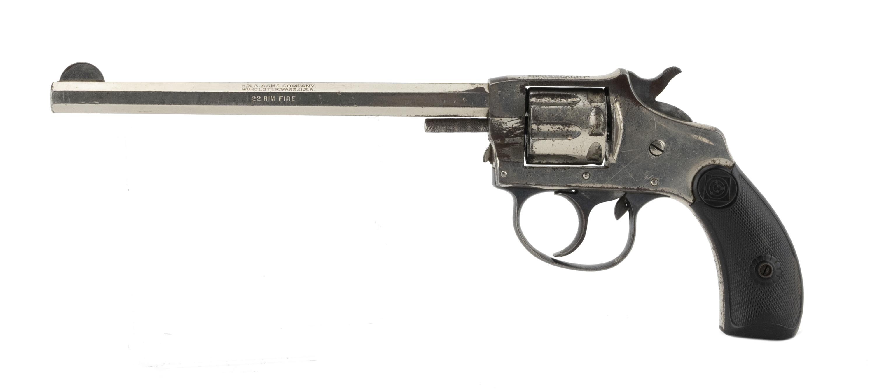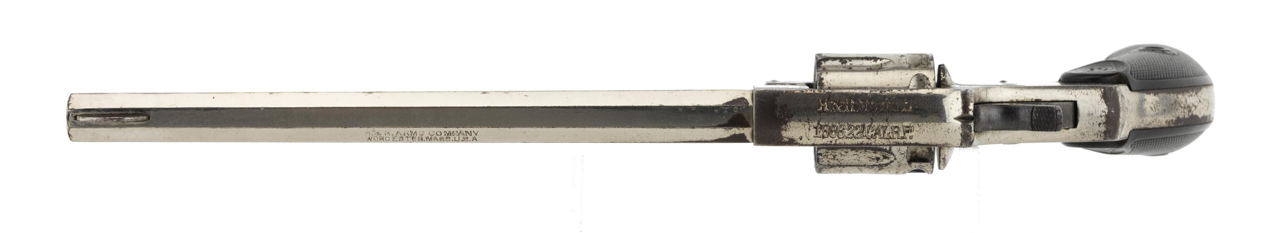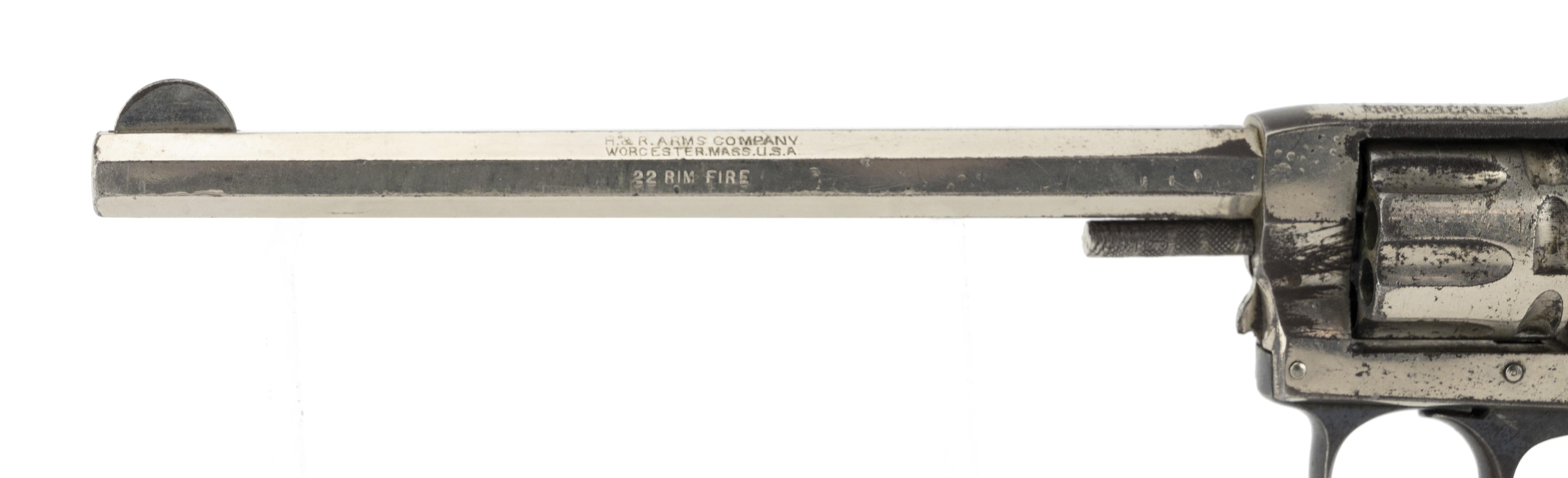 Solid frame double action revolver with nickel finish. Has a 6" octagon barrel with good rifling and frosting in the grooves. The barrel is marked "H&R Arms Company/Worcester, Mass. USA" over "22 Rim Fire" on the left flat. The top strap is marked "H&R Model/1906 22 Cal R.F." It has approximately 90% nickel. The H&R grips are fine with no chips or cracks. The action functions correctly with the interesting feature of the single action trigger pull indexing the cylinder prior to dropping the hammer. An interesting early 20th century gun.