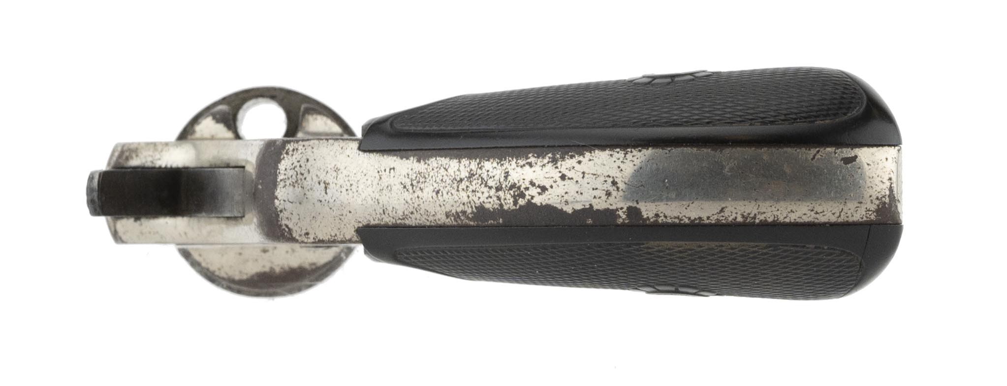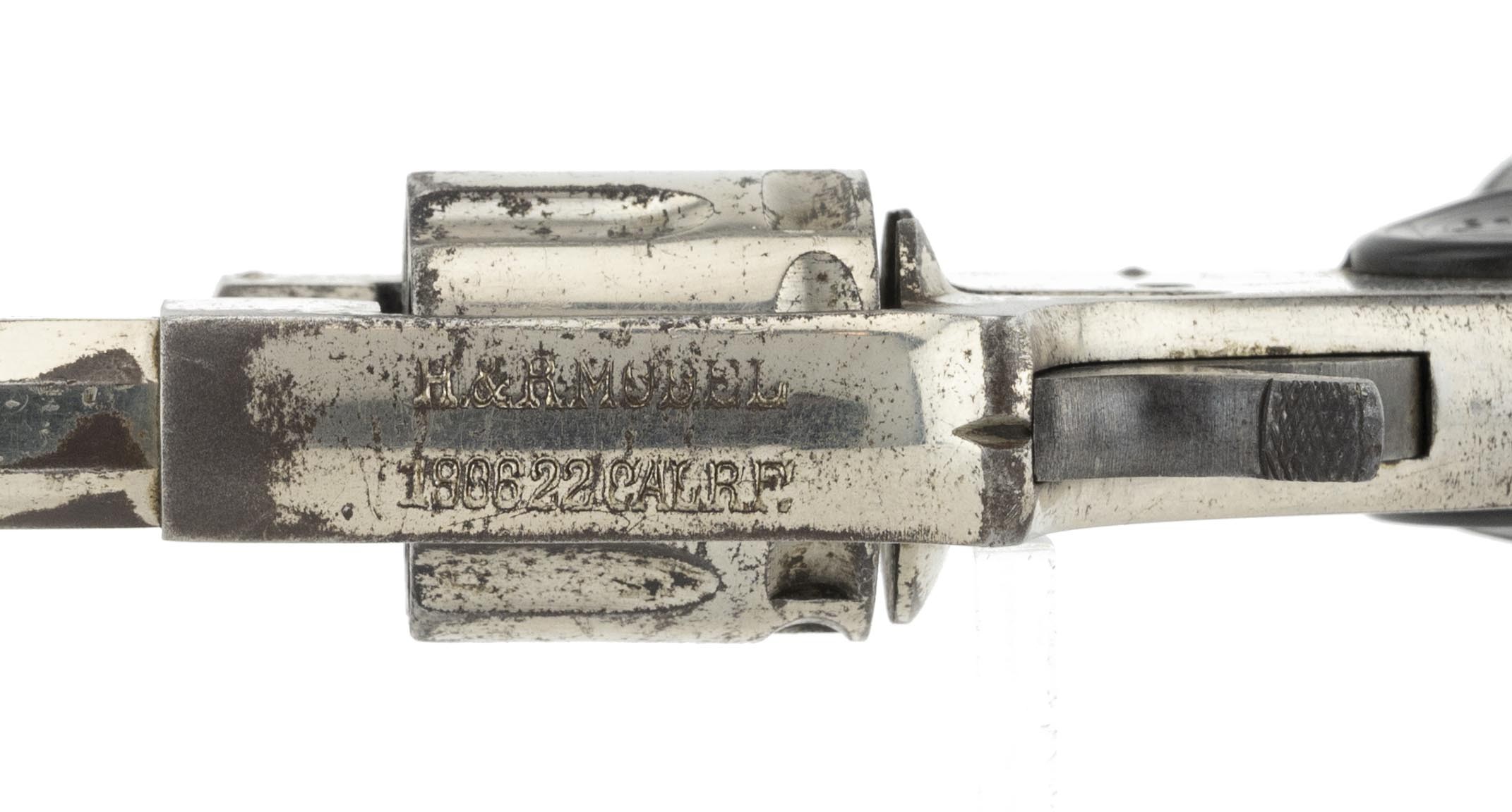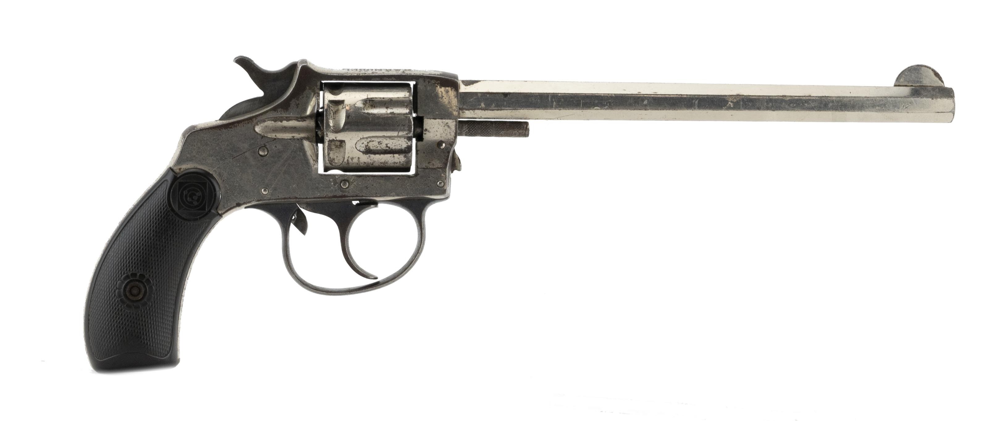 Solid frame double action revolver with nickel finish. Has a 6" octagon barrel with good rifling and frosting in the grooves. The barrel is marked "H&R Arms Company/Worcester, Mass. USA" over "22 Rim Fire" on the left flat. The top strap is marked "H&R Model/1906 22 Cal R.F." It has approximately 90% nickel. The H&R grips are fine with no chips or cracks. The action functions correctly with the interesting feature of the single action trigger pull indexing the cylinder prior to dropping the hammer. An interesting early 20th century gun.