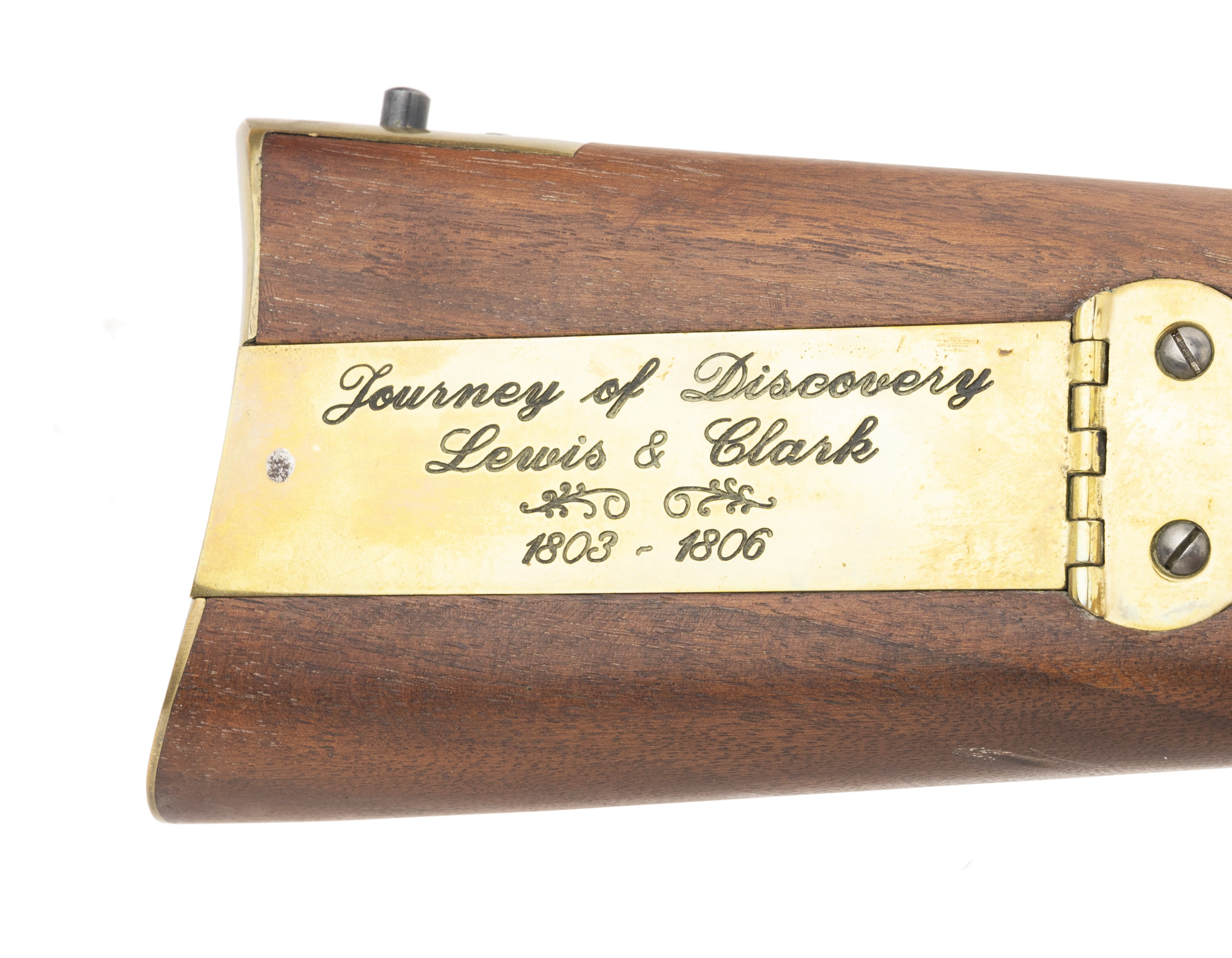 Navy Arms U.S. Model 1803 commemorative flintlock U.S. Model 1803 rifle. The patchbox is marked "Journey of Discovery/Lewis & Clark/1803 - 1806". Near excellent condition. No box.