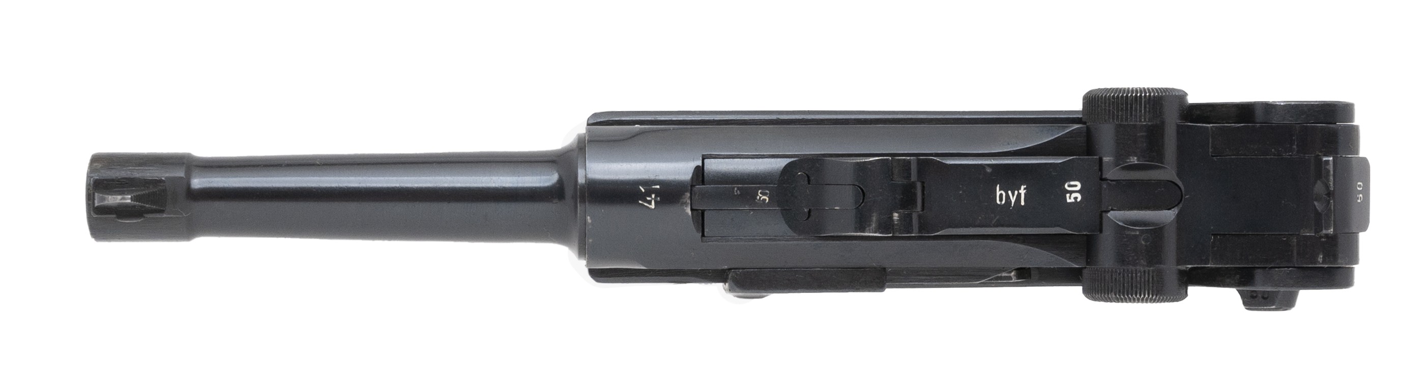 German Luger BYF 41 Code. Caliber 9mm luger. Made by Mauser in 1941. This is a “so called Russian Capture” pistol that came over in the1960’s These are caricaturized by rebluing over heavily polished metal and may have markings that don’t seem to have any reason to be there, such as the letter "X" on the left side of the frame just forward of the sideplate. The bore is perfect and the barrel has no serial number but does have a crown over “N” ,normally found on earlier period Lugers. Aside from the barrel, the rest of the pistol serial numbers match. The pistol has approximately 93 to 95% of the reblued. The action works perfectly. The magazine is an FXO / P.O8 extruded magazine. The grips are sharp and fit very well . Reasonably priced and an attractive looking WW II Luger.