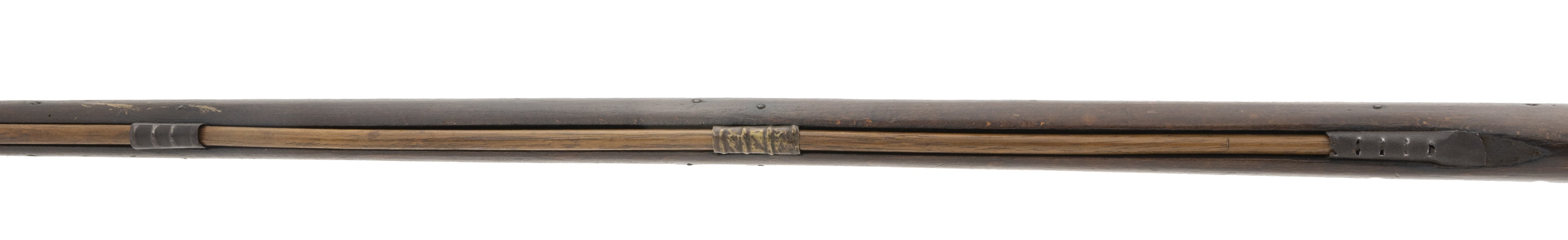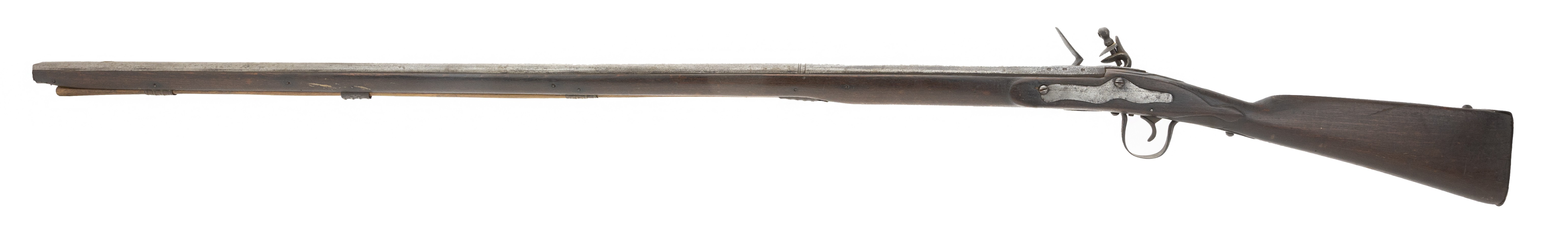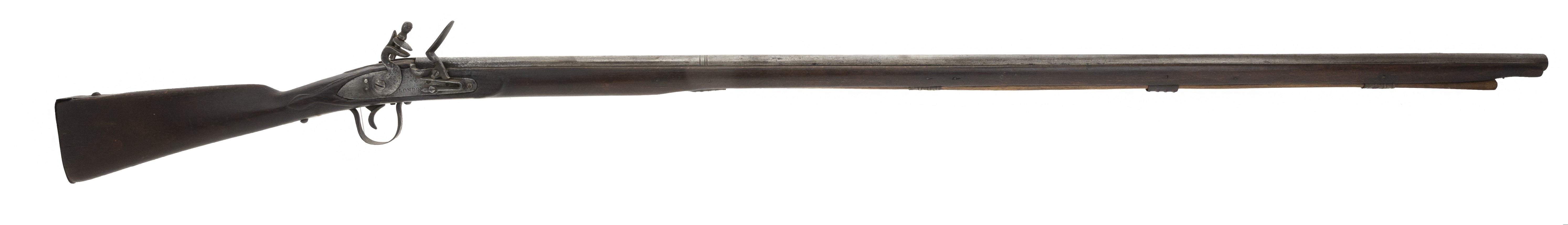 Made circa 1875. 70 caliber with a 50 in barrel. This gun has a light gray patina on the metal. Wood is reasonably sharp, This is a flintlock lock and marked “LONDON” This gun has all the normal features of a trade musket with the oversized trigger guard, thin light weight furniture and barrel designed to shoot shot and ribbed ramrod pipes. This gun was made in flintlock despite being made approximately 1870s because the idea was to trade this type of musket to the natives giving them an ineffective firearm.