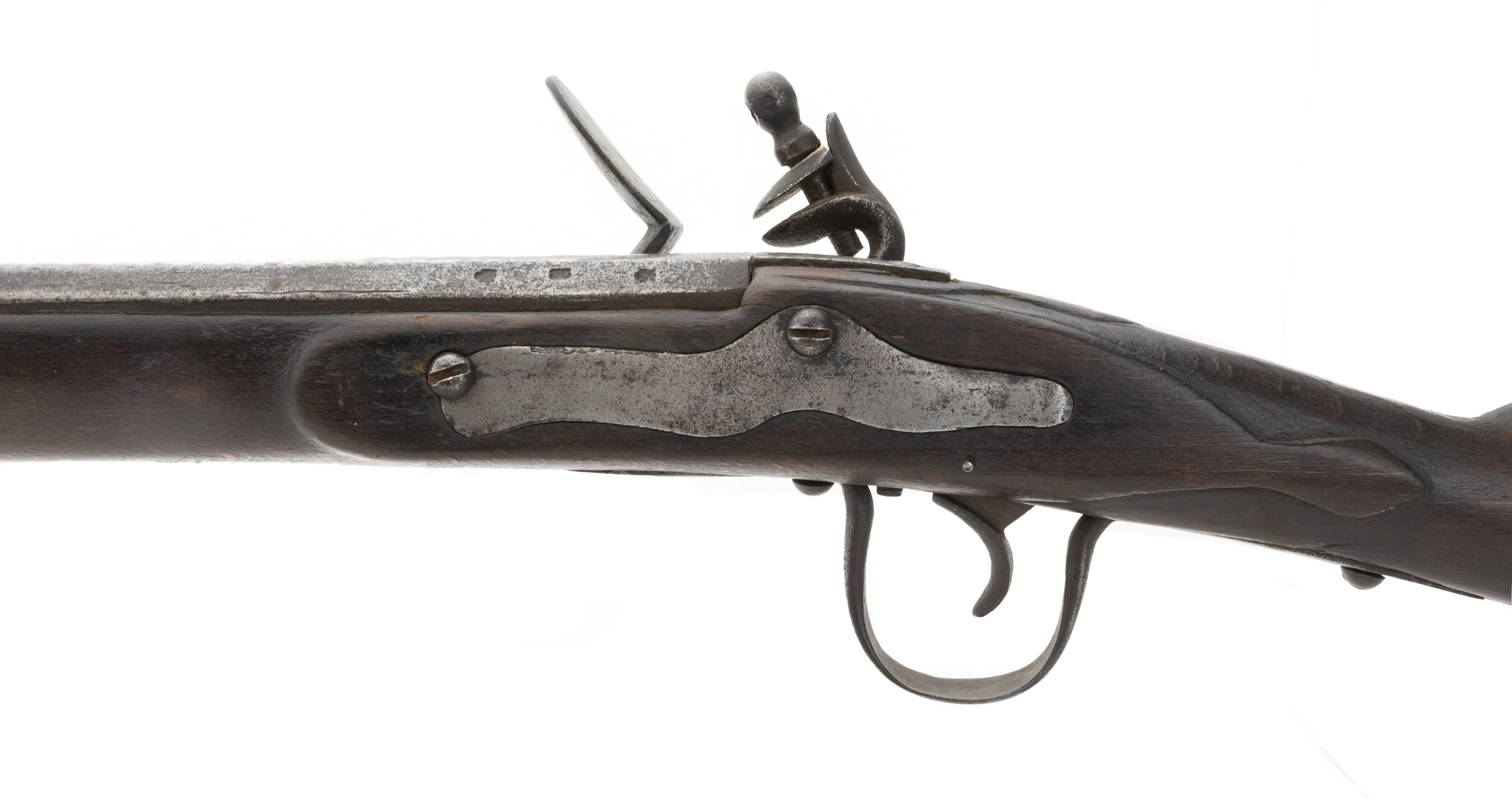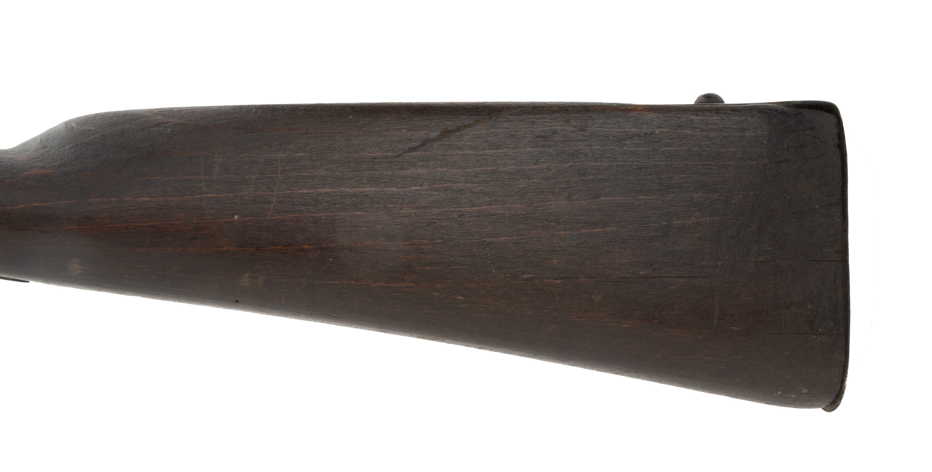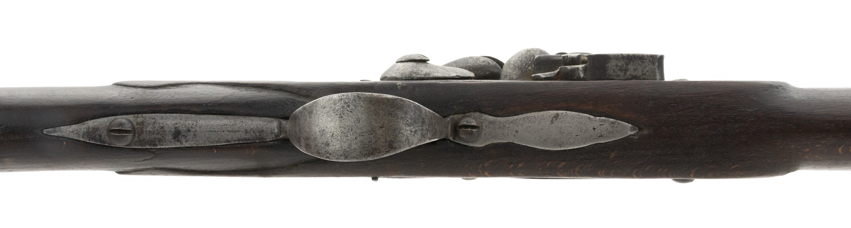Made circa 1875. 70 caliber with a 50 in barrel. This gun has a light gray patina on the metal. Wood is reasonably sharp, This is a flintlock lock and marked “LONDON” This gun has all the normal features of a trade musket with the oversized trigger guard, thin light weight furniture and barrel designed to shoot shot and ribbed ramrod pipes. This gun was made in flintlock despite being made approximately 1870s because the idea was to trade this type of musket to the natives giving them an ineffective firearm.