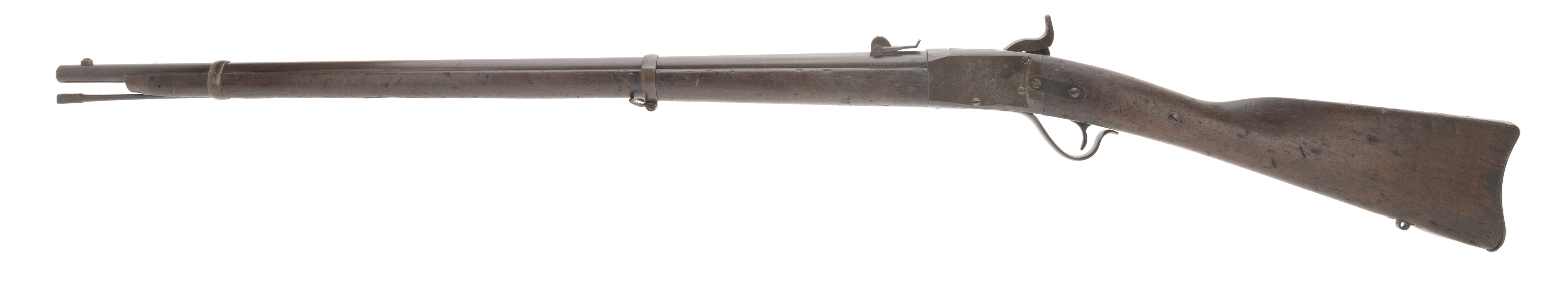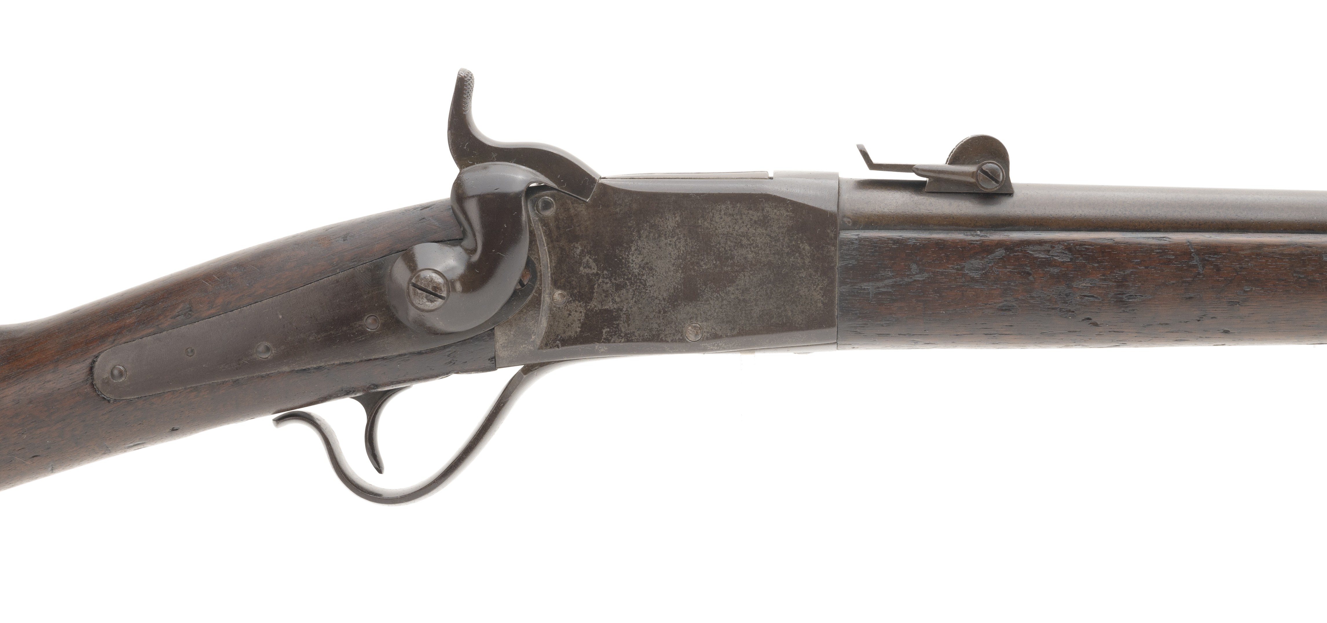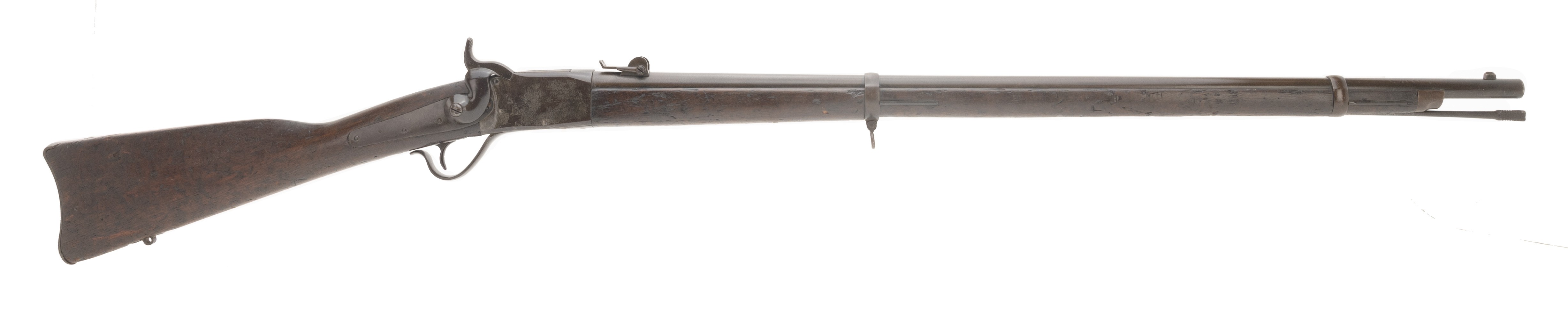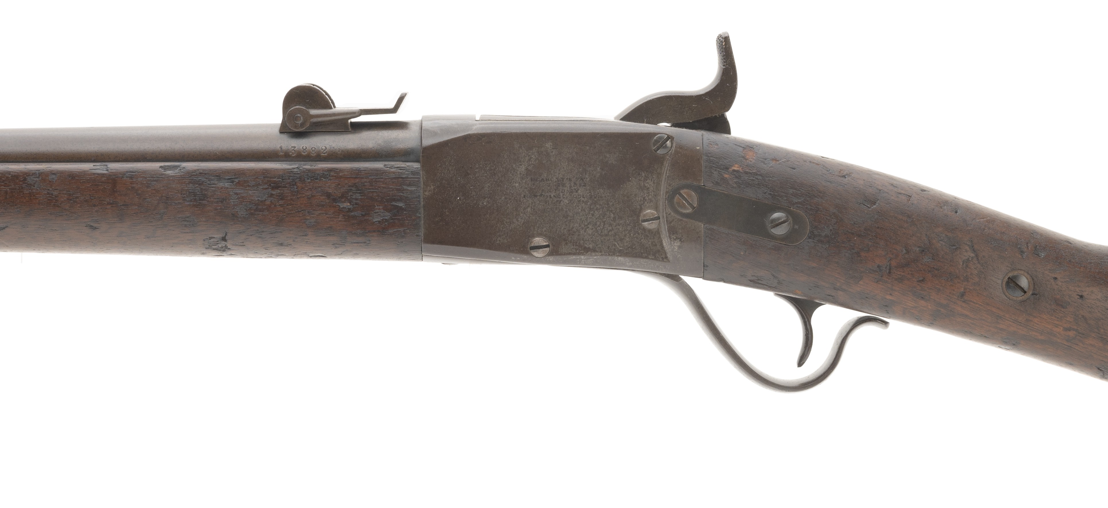 This Swiss 1867 military Peabody rifle was made by the Providence Tool Company, Providence, RI. The round approx. 32.75" round 41 Swiss rimfire caliber barrel has a fine bore with bright, strong rifling with just al little frosting in the grooves near the muzzle. The gun has an overall smooth brown patina. The barrel, forearm, and buttstock are numbered 13882. The action has the standard Peabody markings. The stocks are good with multiple issue dents and dings and some wood loss along the ramrod channel. The front swivel and the rear swivel fitting without the swivel are present. The correct cleaning rod is present. The action functions correctly. The Providence Tool Company sold about 15,000 to the Swiss in serial number range 5500 to 21000. The majority have remained in Europe. If you collect Swiss or European military rifles, this would be a good addition to your collection.