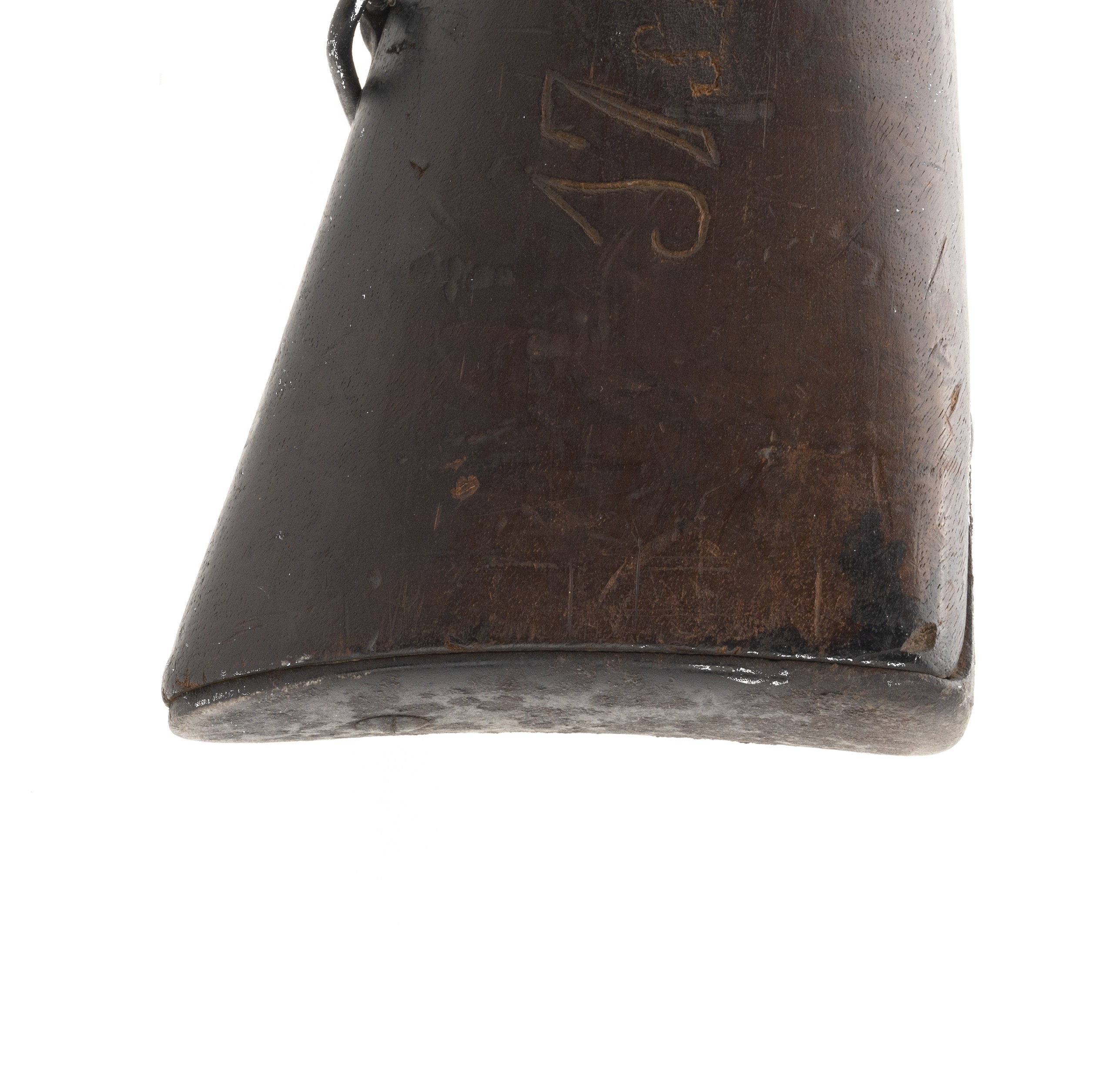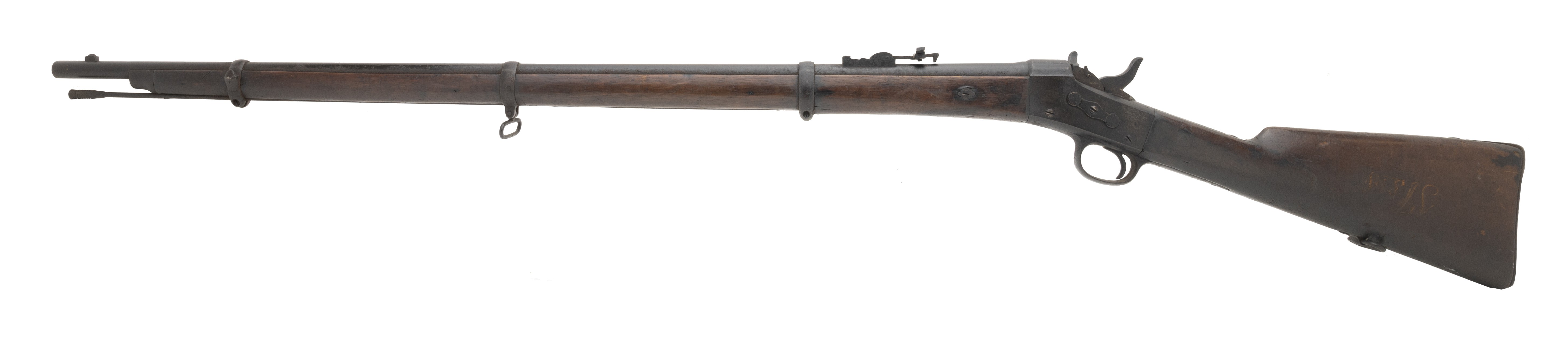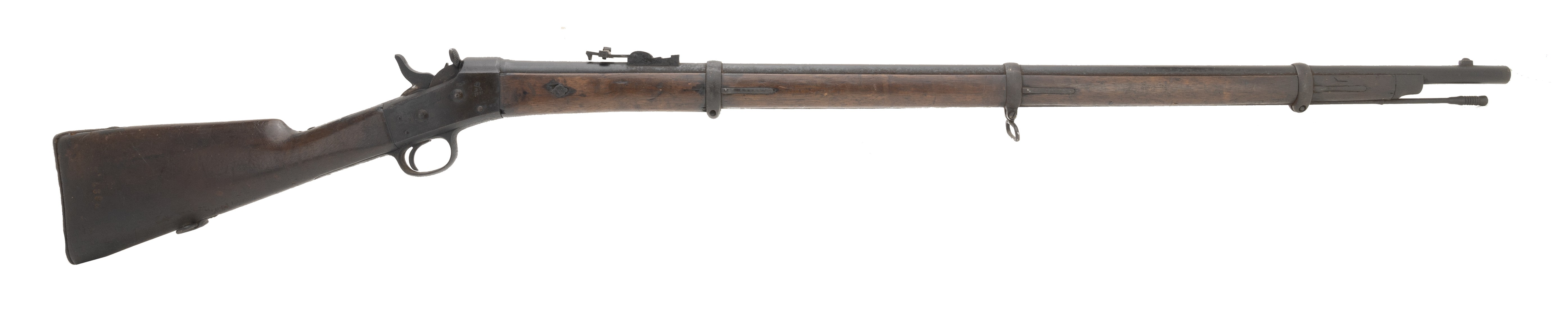 This Model 1871 Spanish rolling block infantry rifle has the Portuguese crown over AR.O. over 1881 on the left side of the receiver. The 37" round 11.15Z57R Spanish Remington (43 Spanish) round barre has a poor bore. All the metal is dark with light roughness. The butt stock is good with what may be a unit marking cut into the left side and No. 4384 on the right at the butt and forward of that, a circle cartouche with a crown over OVIEDO over 1881. There is a 1 behind the trigger guard tang. It has the expected usage dents and dings and the butt plate has moderate pitting from poor storage. The forend is good with usage dents and dings but no cracks or chips. The sling swivels and ramrod are present. The action is tight but functions correctly. It appears this rifle was made in Spain and sold to Portugal. It would be perfect for a European military rifle collection.