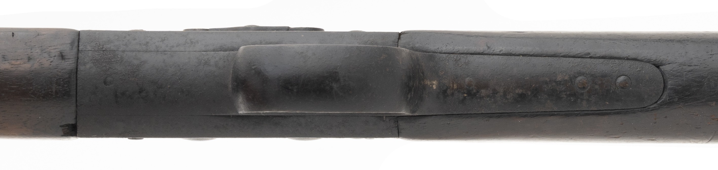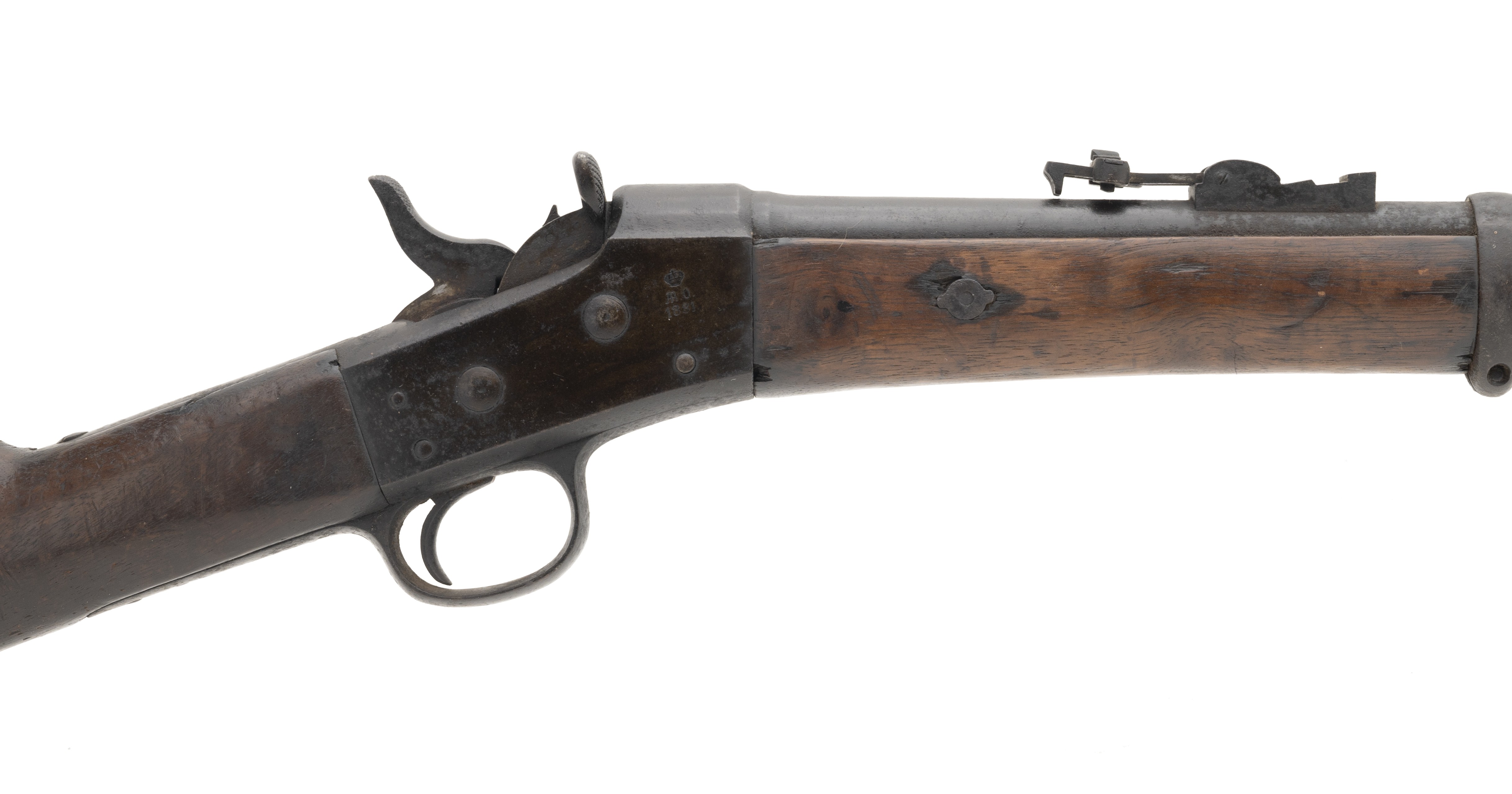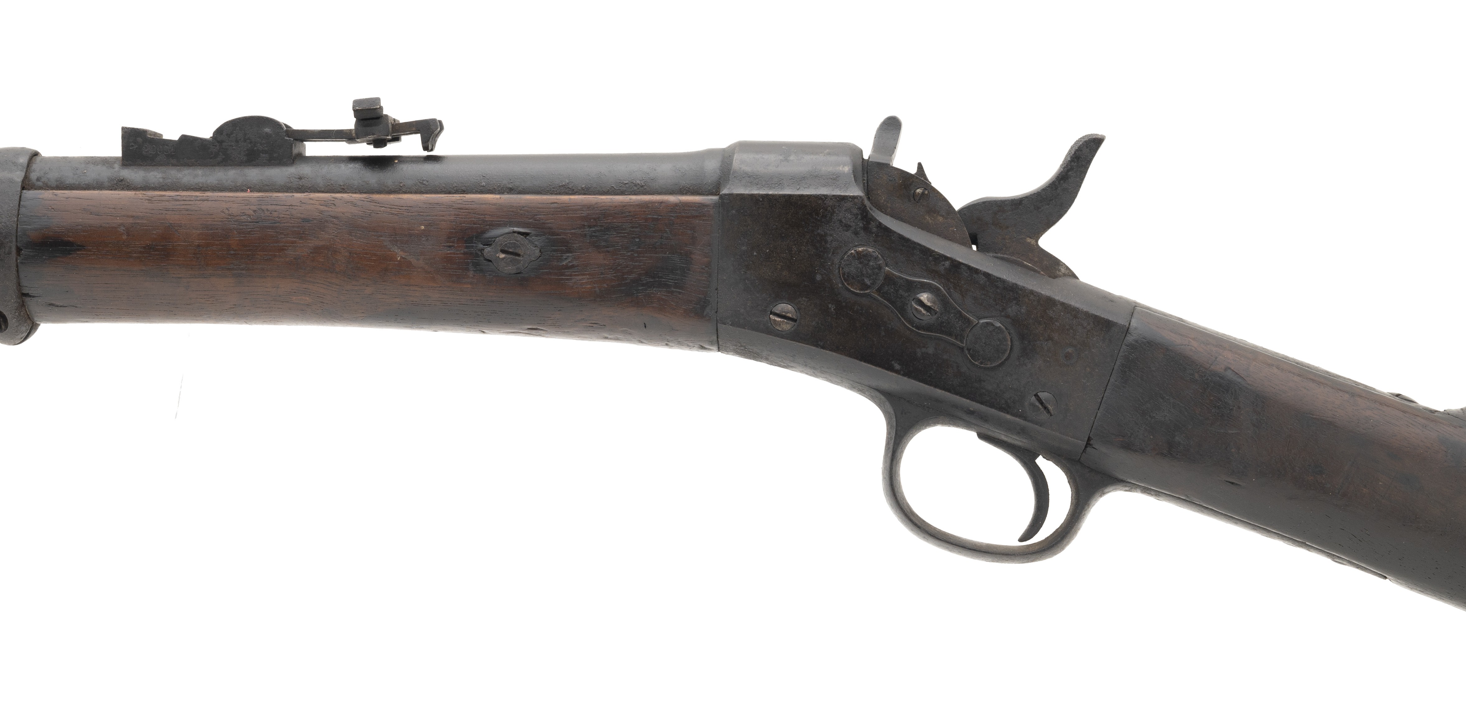 This Model 1871 Spanish rolling block infantry rifle has the Portuguese crown over AR.O. over 1881 on the left side of the receiver. The 37" round 11.15Z57R Spanish Remington (43 Spanish) round barre has a poor bore. All the metal is dark with light roughness. The butt stock is good with what may be a unit marking cut into the left side and No. 4384 on the right at the butt and forward of that, a circle cartouche with a crown over OVIEDO over 1881. There is a 1 behind the trigger guard tang. It has the expected usage dents and dings and the butt plate has moderate pitting from poor storage. The forend is good with usage dents and dings but no cracks or chips. The sling swivels and ramrod are present. The action is tight but functions correctly. It appears this rifle was made in Spain and sold to Portugal. It would be perfect for a European military rifle collection.