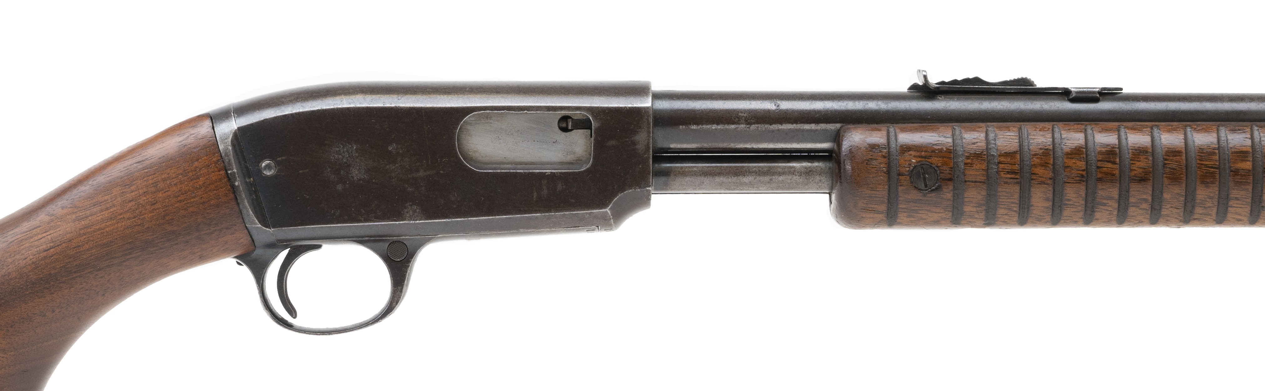 Tube fed pump action made in 1955. Metal has a thinning blue turning to patina. Bore is excellent. Bottom of receiver has some dings. Fair overall condition.