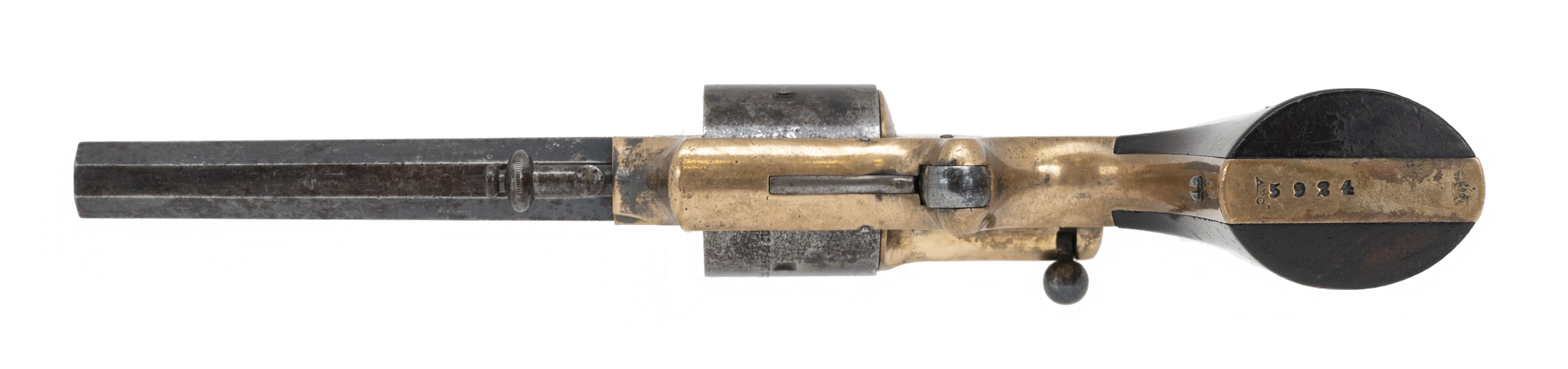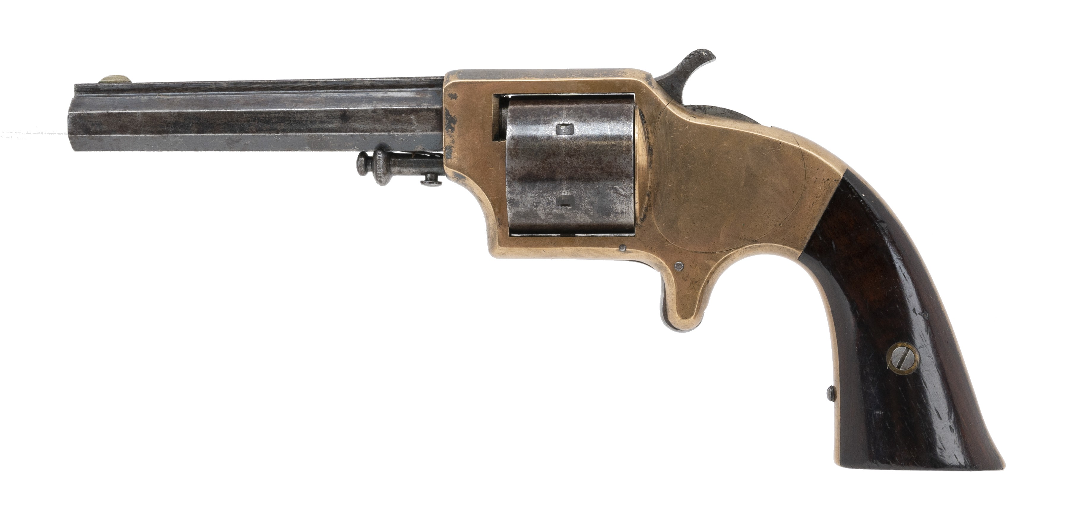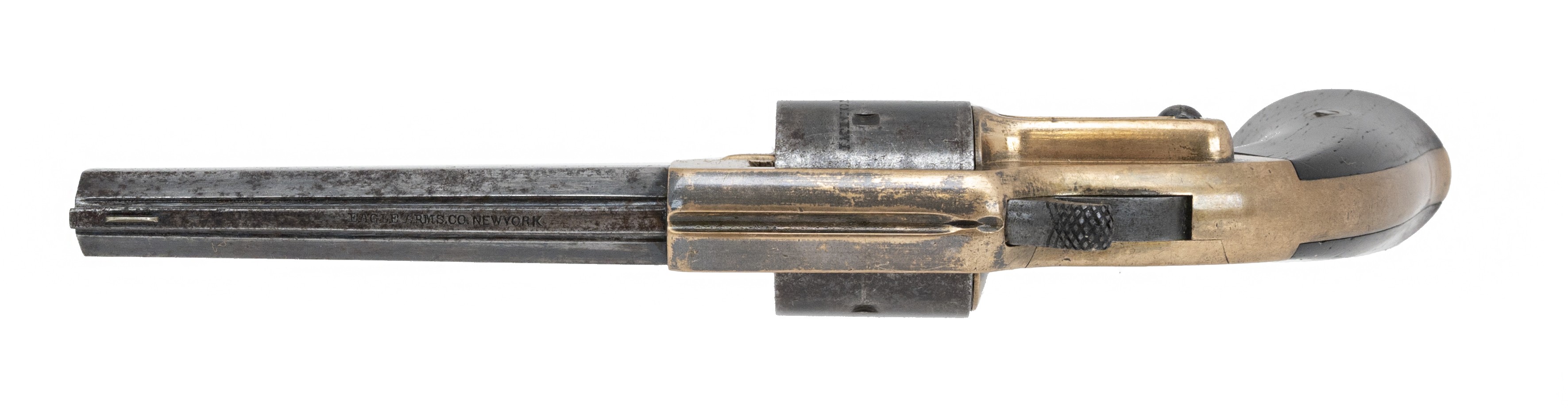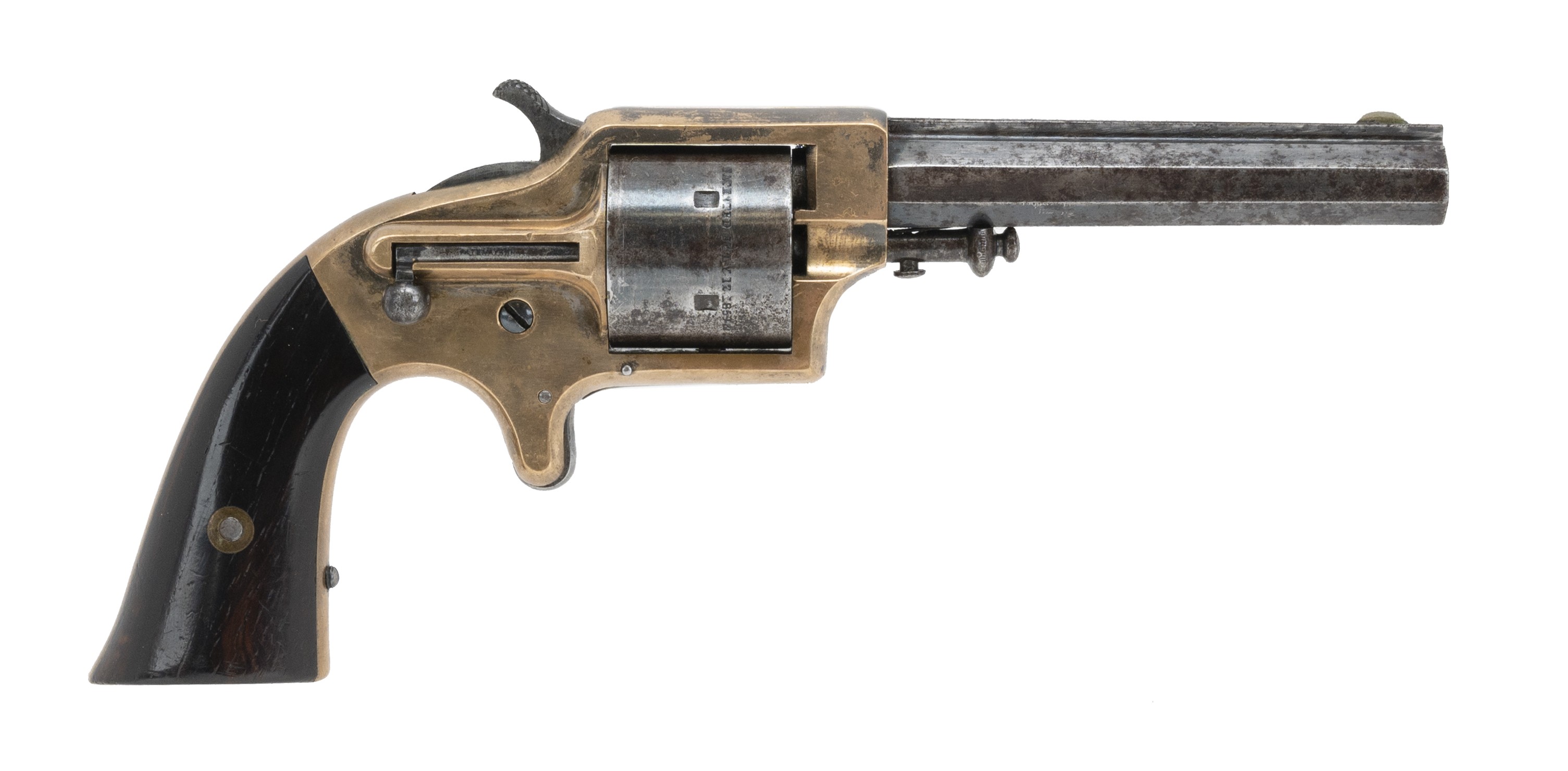 This Eagle Arms Co. front loading, cup-primed 30 caliber revolver was manufactured circa mid-1860s by the Eagle Arms Co. , New York. It was marketed by the Plant Manufacturing Co. and is often identified as a Plant Pocket model. Most were five shot with the exception of the six shot Eagle Arms Co. 3.5" octagon ribbed barrel guns like this one. The top of the barrel on this revolver is marked EAGLE ARMS CO. NEW YORK. The bore is fine with bright, strong rifling. The brass frame is very good with a couple areas of original silver plating. The barrel and cylinder have a smooth brown patina. The rosewood grips are fine with much original finish. The bottom of the grip strap has APC stamped in small letters just forward of the serial number. The action works correctly and the cylinder indexes properly. This is a very interesting revolver that, due to its unique ammunition, only lasted a few years.