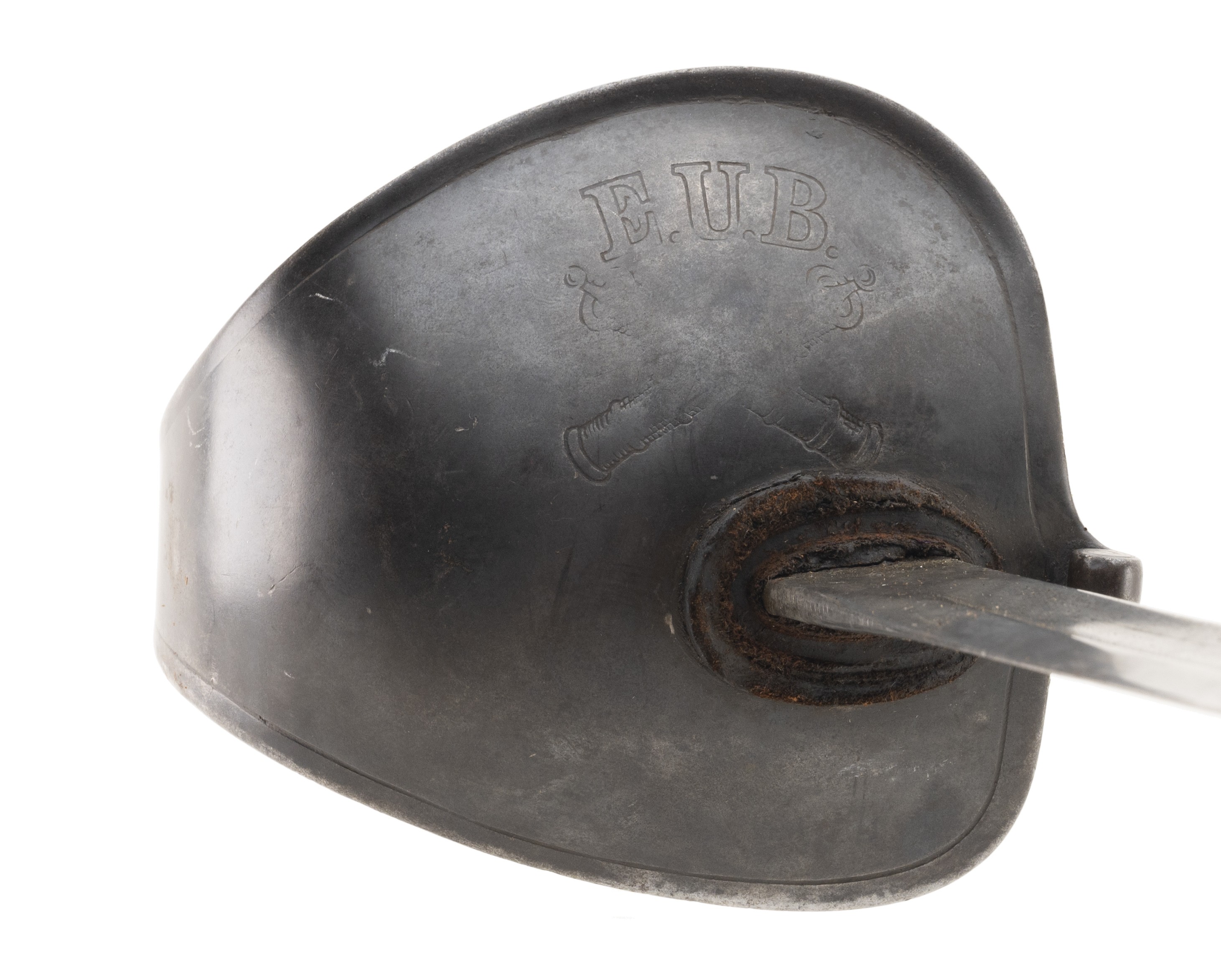 Knuckle guard is marked E.U.B over cross cannons. Blade is 31". Ricasso is marked "Alex Coppel Solingen". Scabbard has an unusual Arabic marking by throat. Good overall condition.