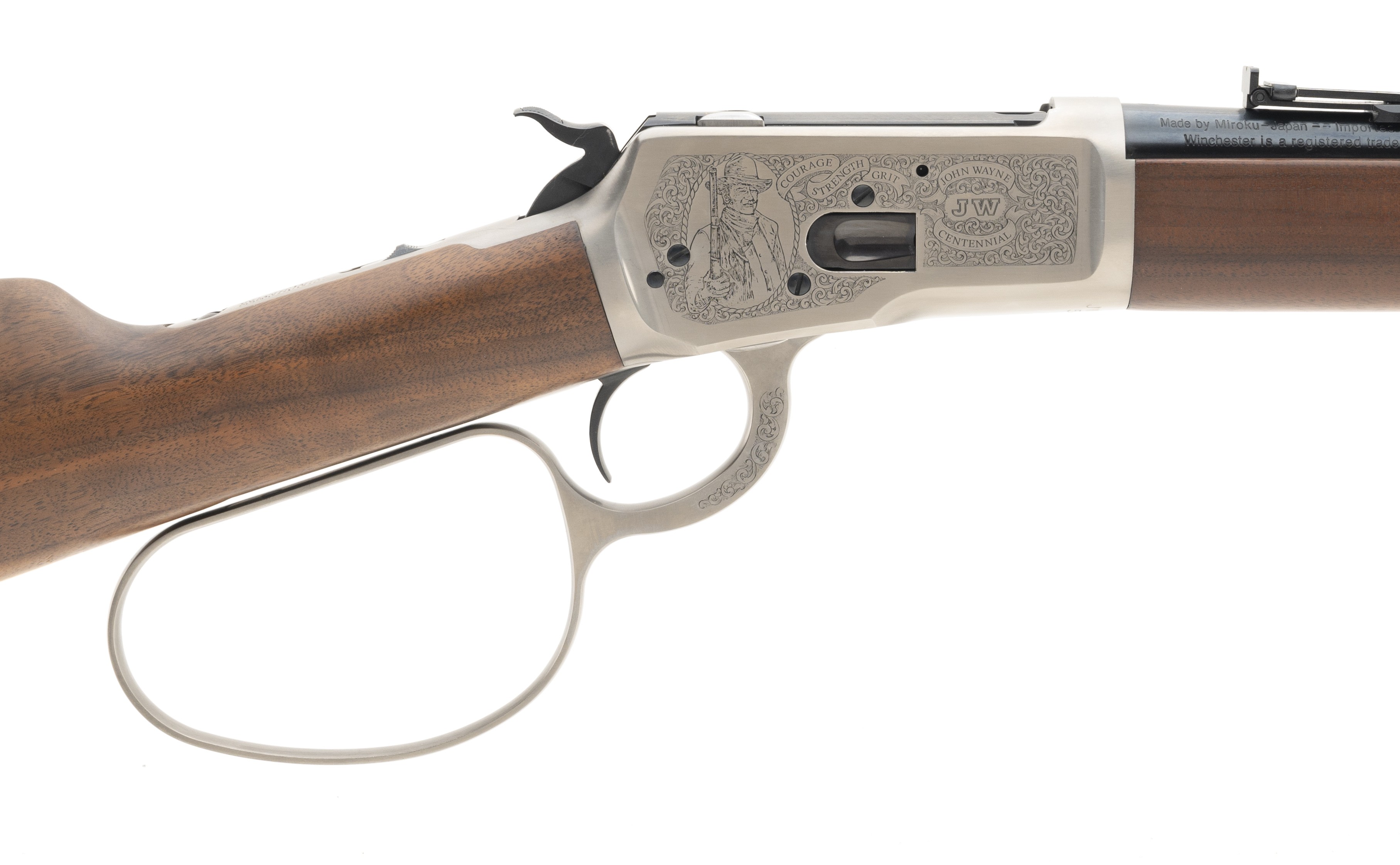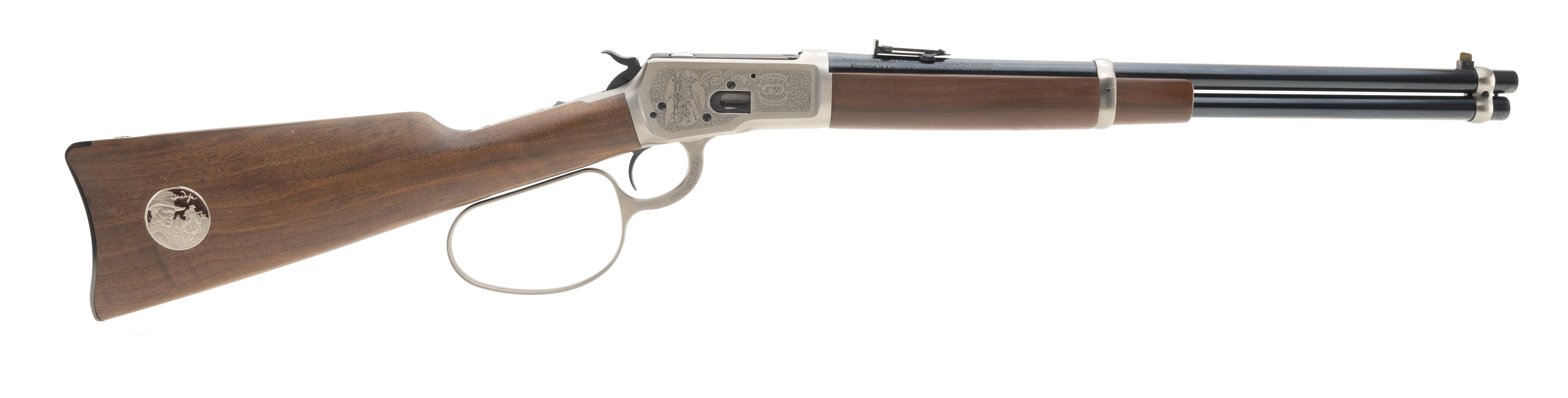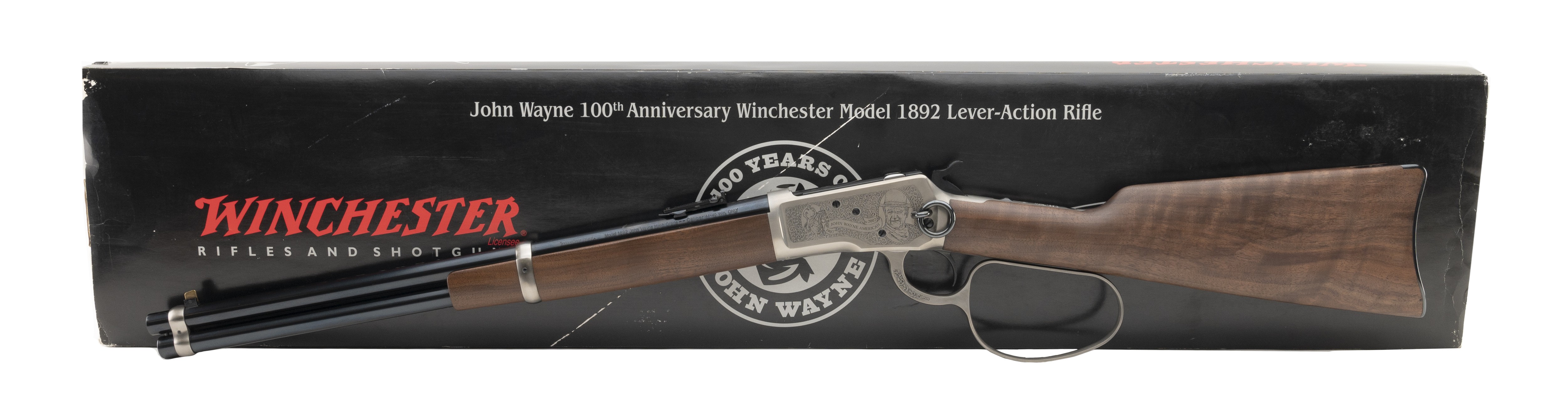 John Wayne 100th Anniversary commemorative carbine with large loop, engraved receiver and commemorative coin in stock. Excellent condition with box.