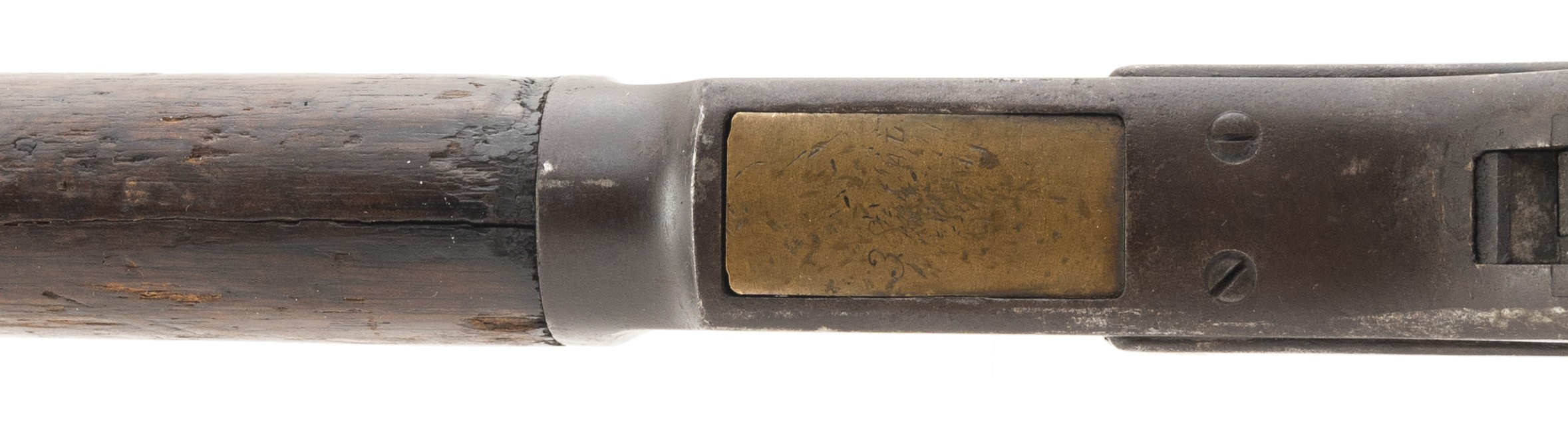 Made in 1898. 38-40 caliber with a 24” barrel. Barrel has a mixture of original blue and brown patina with spot of pitting. Frame is mostly a brown patina. Wood is good. Left hand side of forearms has a piece missing. Bore is dark with pitting. Action works smooth.