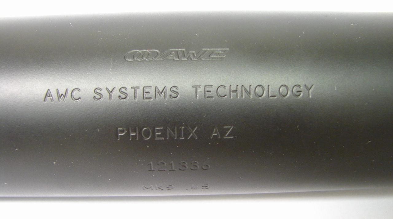 AWC Systems Tech. MK9 .45 ACP caliber suppressor. The AWC MK9 suppressor is intended for use on a MAC 10. This ultra, high-efficient light weight unit is a true example of âstate of the artâ design and engineering allowing for extreme full auto fire in a maintenance free package. New. Class III item. NFA rules do apply. Price may change without notice.