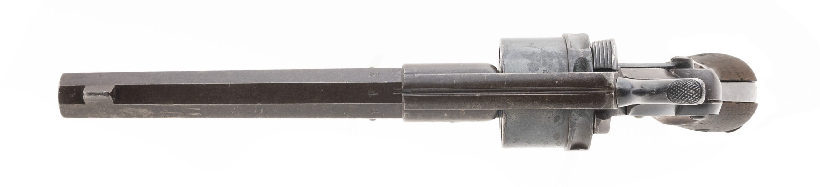 The Dutch Model 1873 (Old Model) solid frame double action revolver is based on the Chamelot Delvigne design. The overall length is approx. 12'. The 6.3" octagon 9.4mm caliber barrel has a fine bright bore with strong rifling and light erosion. The gate-loaded cylinder holds six rounds. All metal has a smooth blue brown patina. The barrel has a blade front sight and notched receiver top rear sight. The barrel has a crown over B on the left and right flats and a crown over F on the top flat. The right side of the receiver is marked P. STEVENS over MAASTRICHT with 1889 over 3V 238 (unit marking) below. The grips are good with some shrinkage, light use wear, and no cracks or chips. The action functions correctly. These large revolvers were used by the Dutch military through WWII.