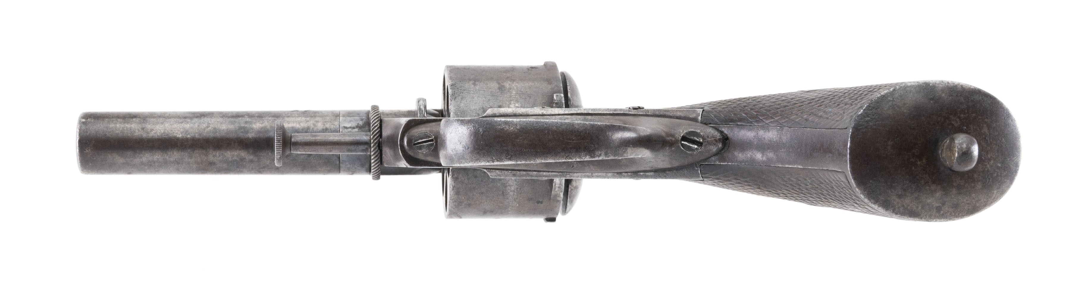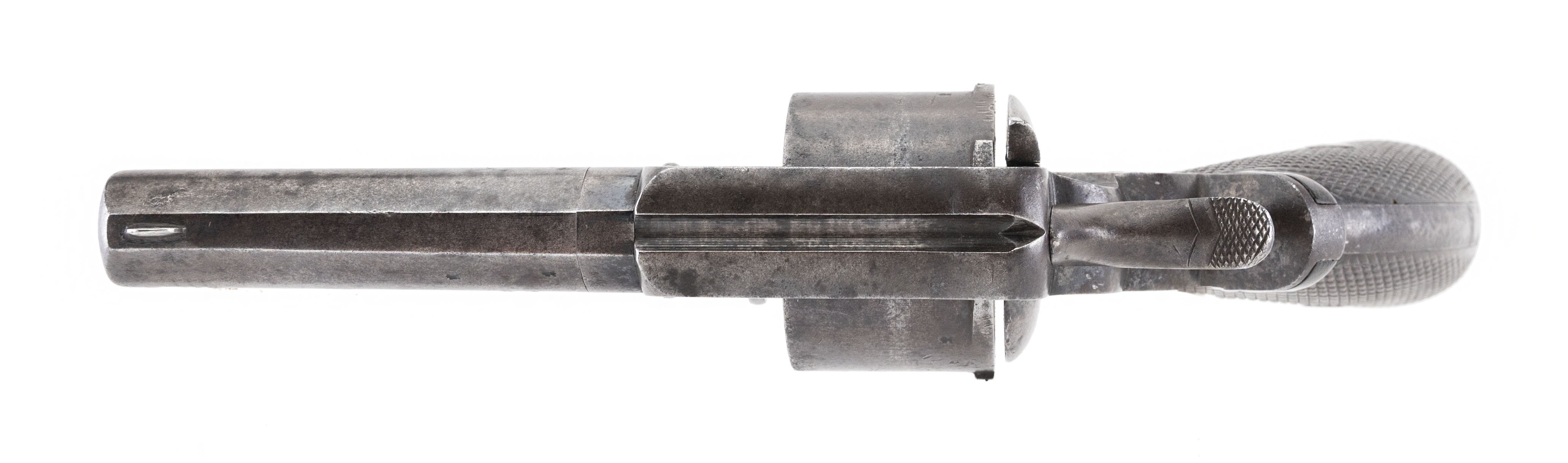 Barrel is 4". Rear of cylinder is numbered 89. Webley's Patent marking is faint of left side of frame. Metal has a mostly brown with gray patina. Bore has strong rifling with pitting. Grips are very good, no chips or cracks. Action works properly. An uncommon low serial number RIC revolver.