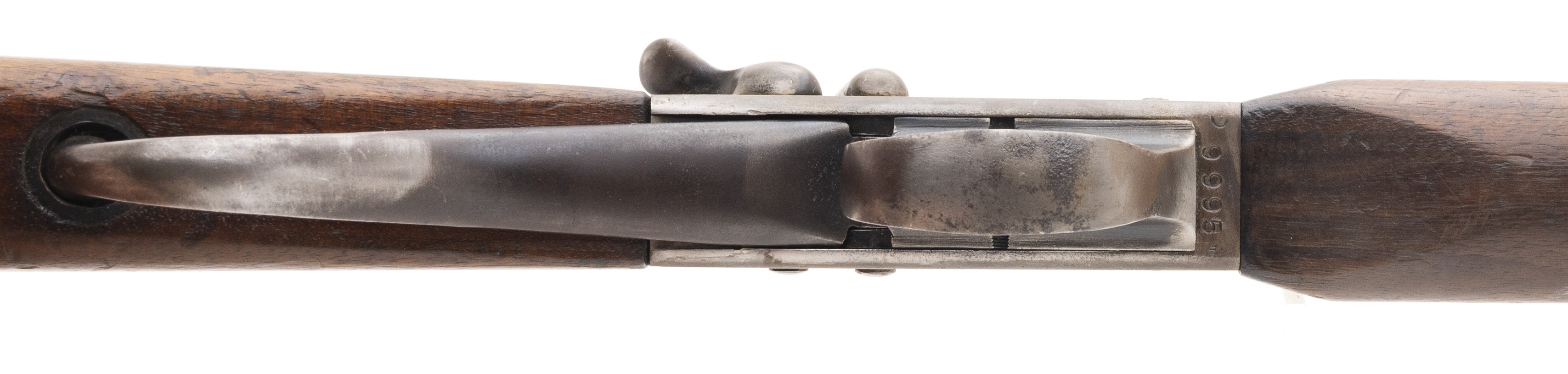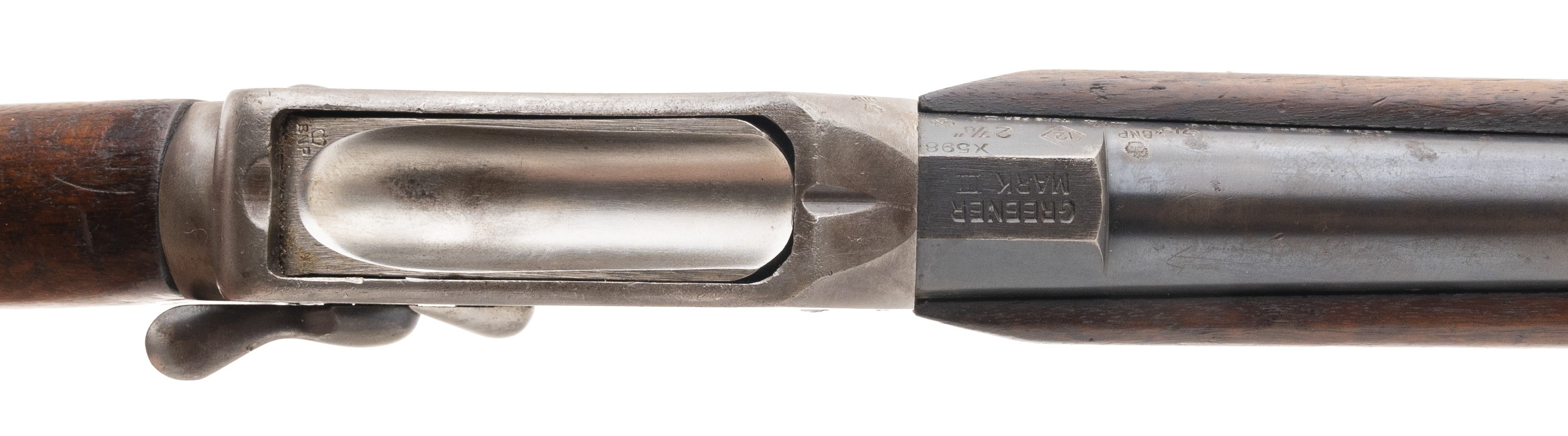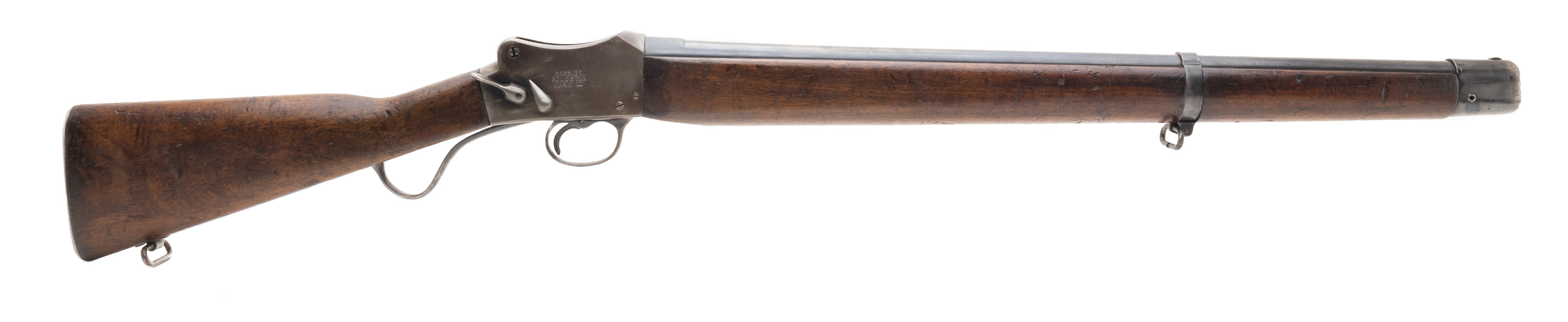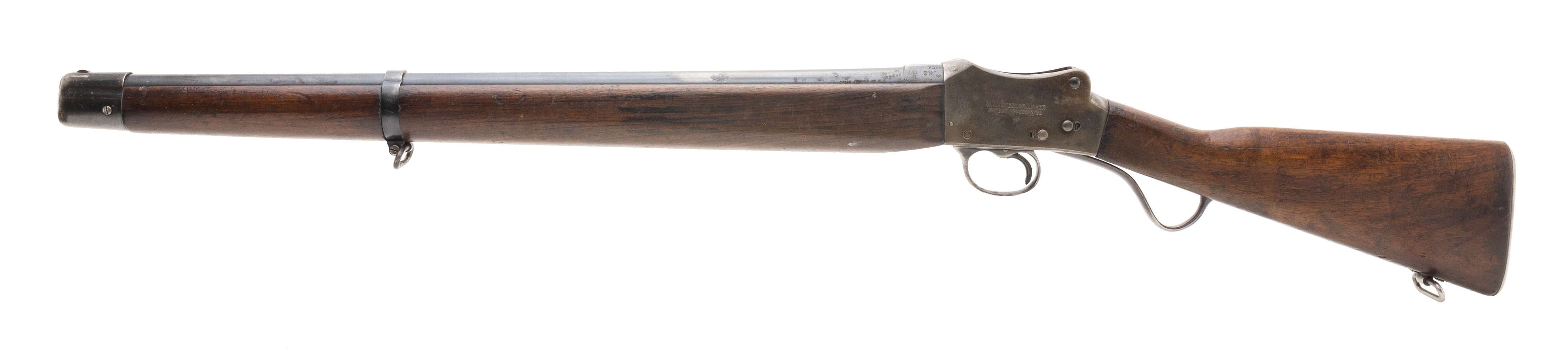 Interesting Martini-Henry designed by Greener to accept a unique 12 gauge cartridge. These rifles were issued in Egypt to local police. Right side of receiver is marked "Greener Police Gun Mark III". Upper barrel band is marked "P71". Bore is excellent. Good overall condition. Comes with a box of 1955 dated ammunition. (Extremely hard to find!) Ammunition is marked "Cartridges for Greener Police Gun Mark III Special Bore Loaded with Buckshot".