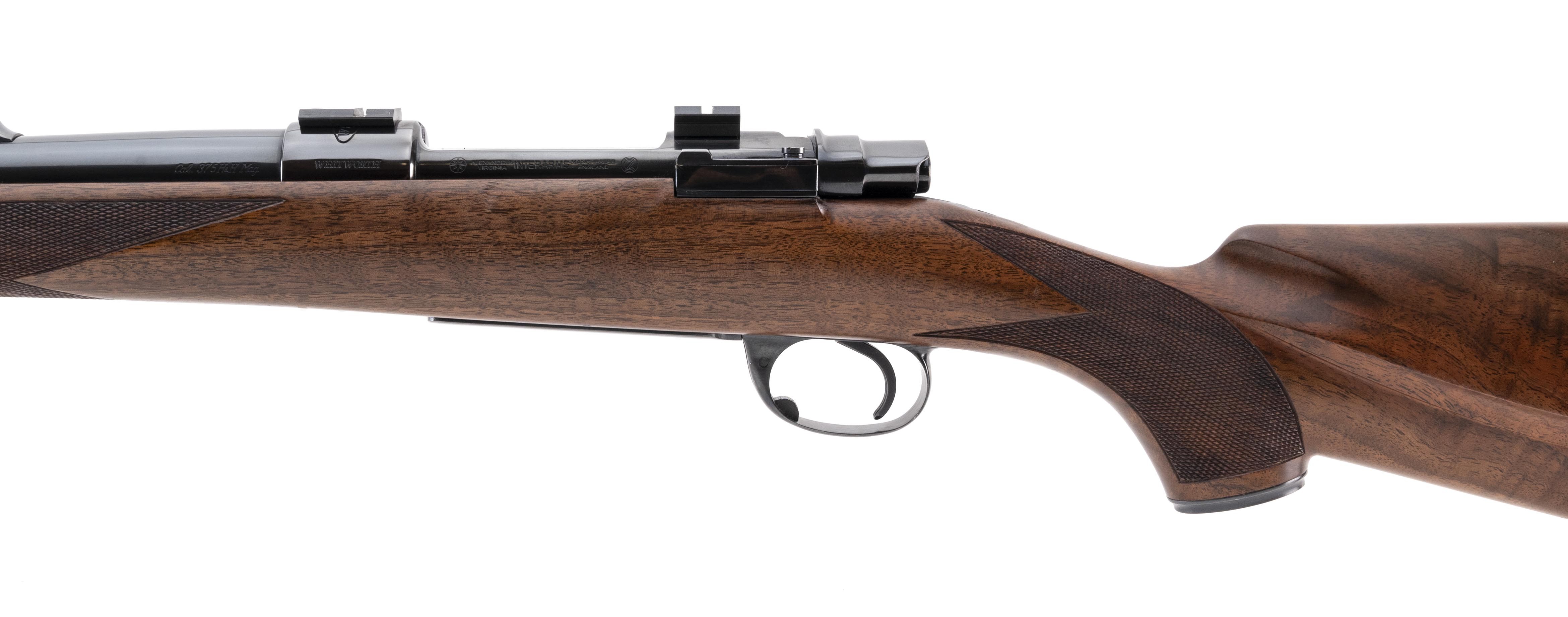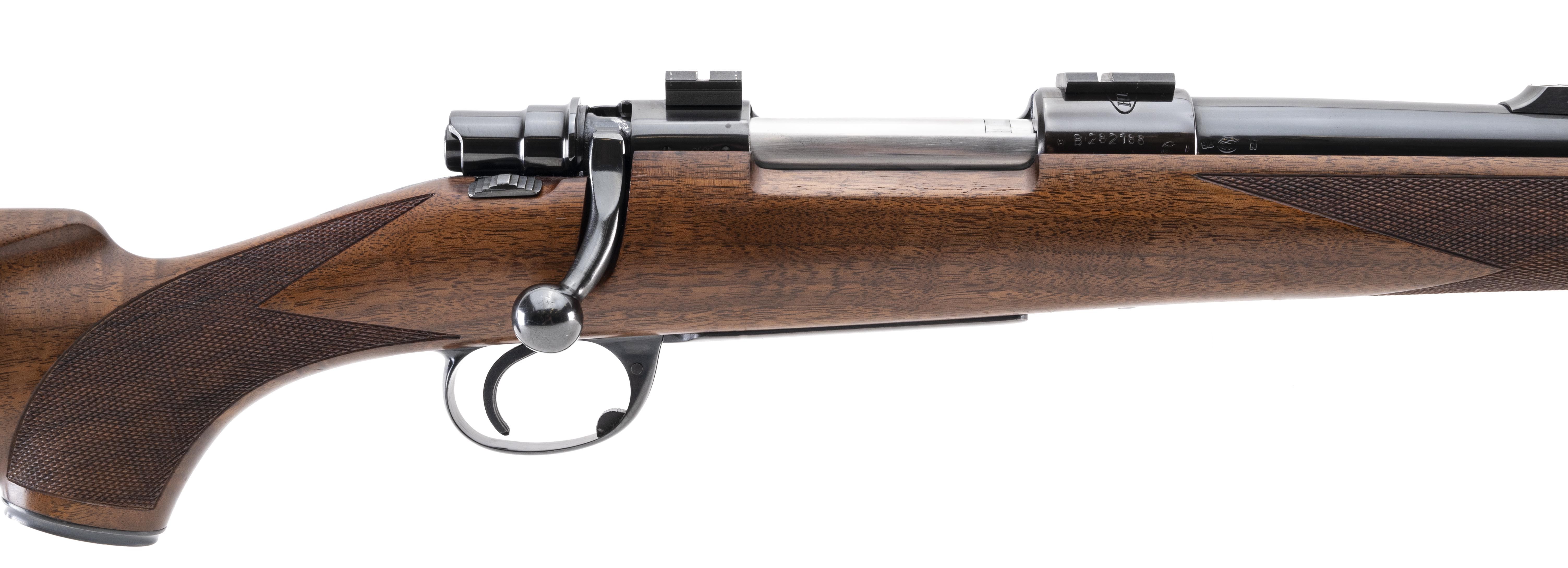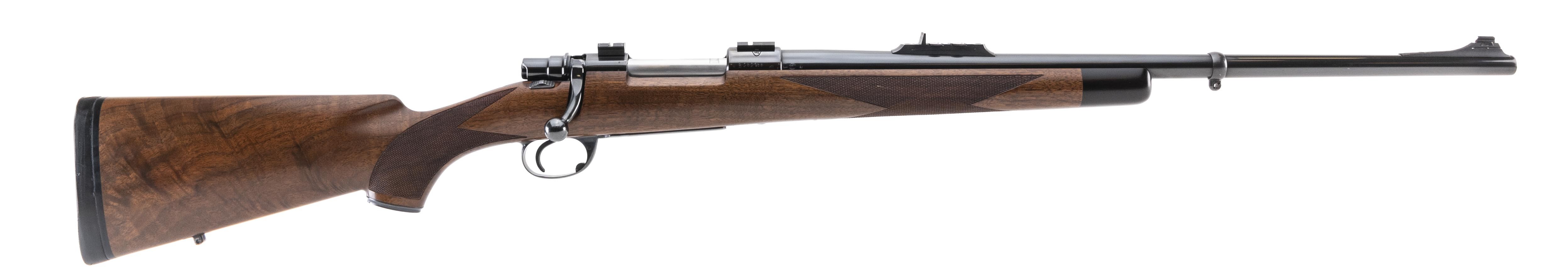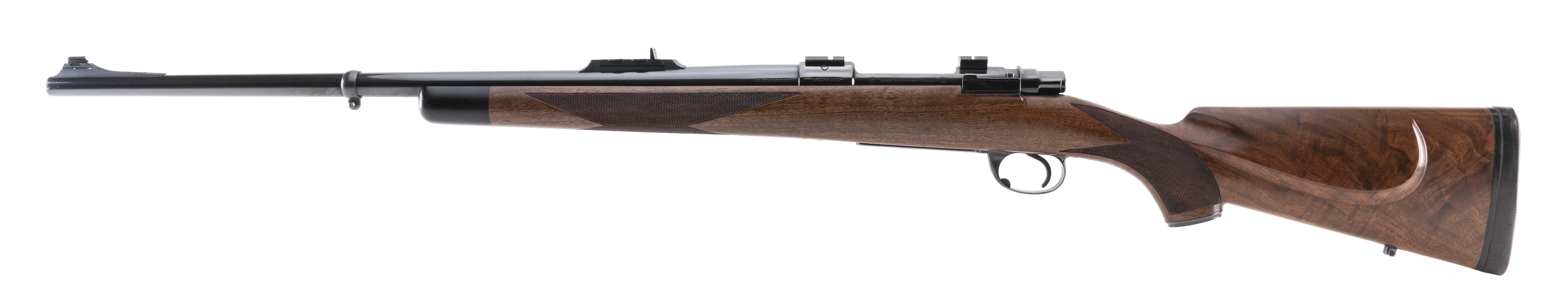 English made Deluxe Express rifle built on a Mauser action. Has a 3-leaf express sight, barrel band swivel mount and skeletonized pistol grip cap. The stock is of fancy figured walnut. A classic dangerous game rifle, in excellent condition.