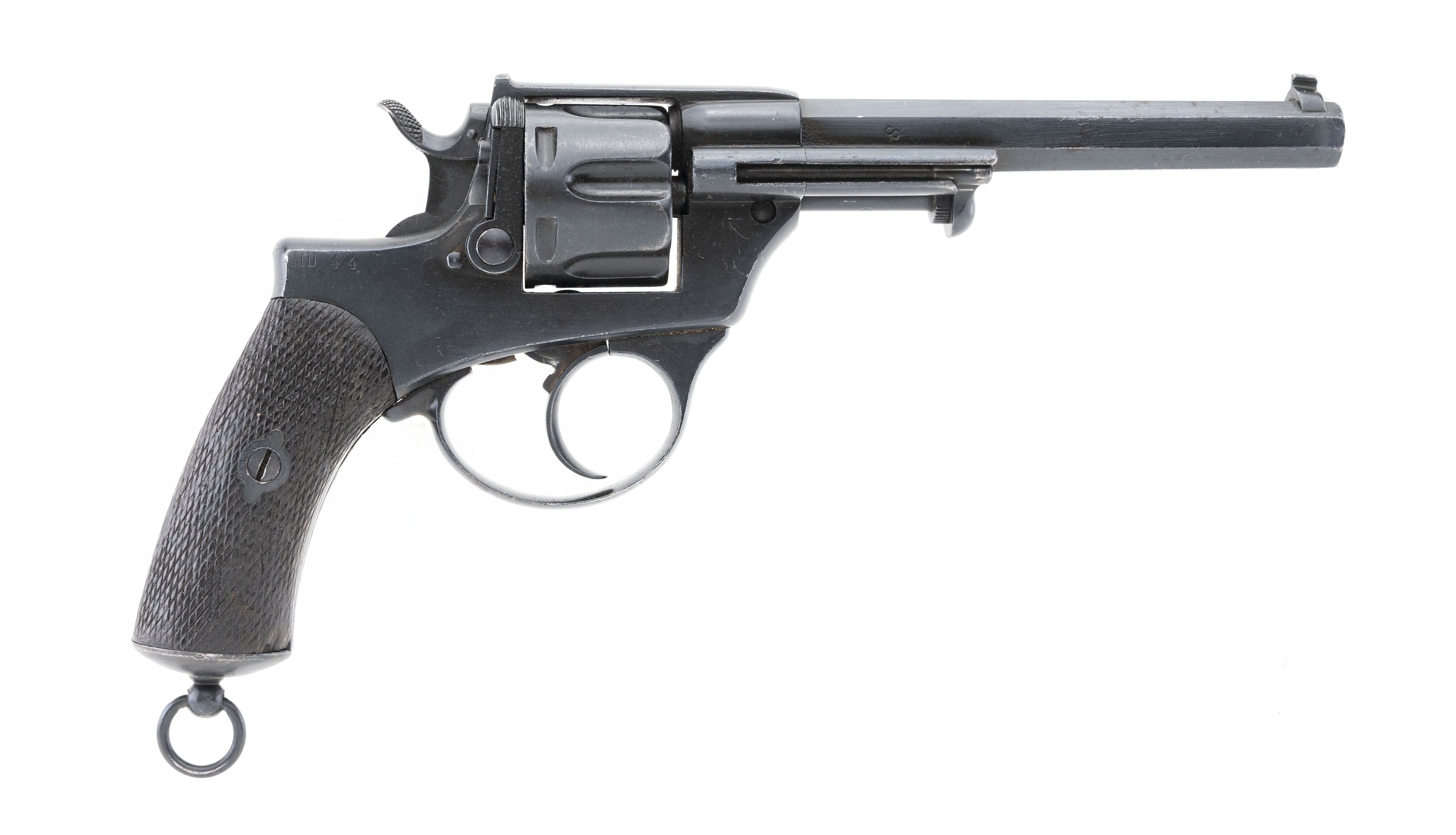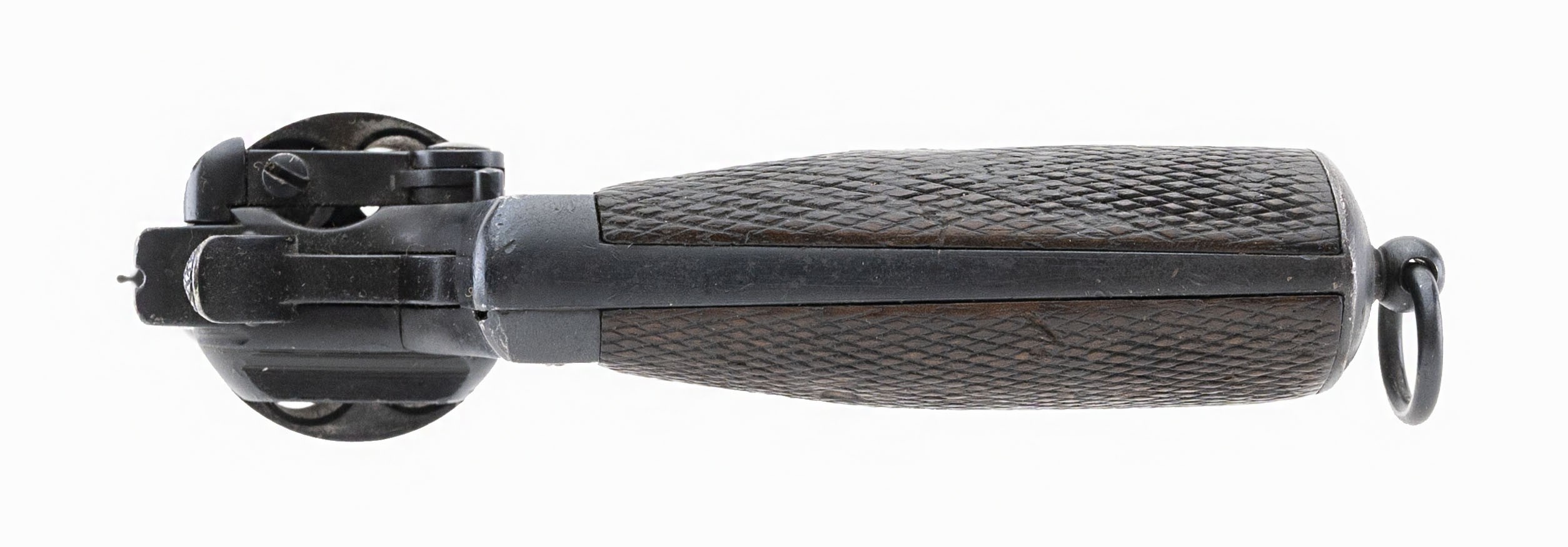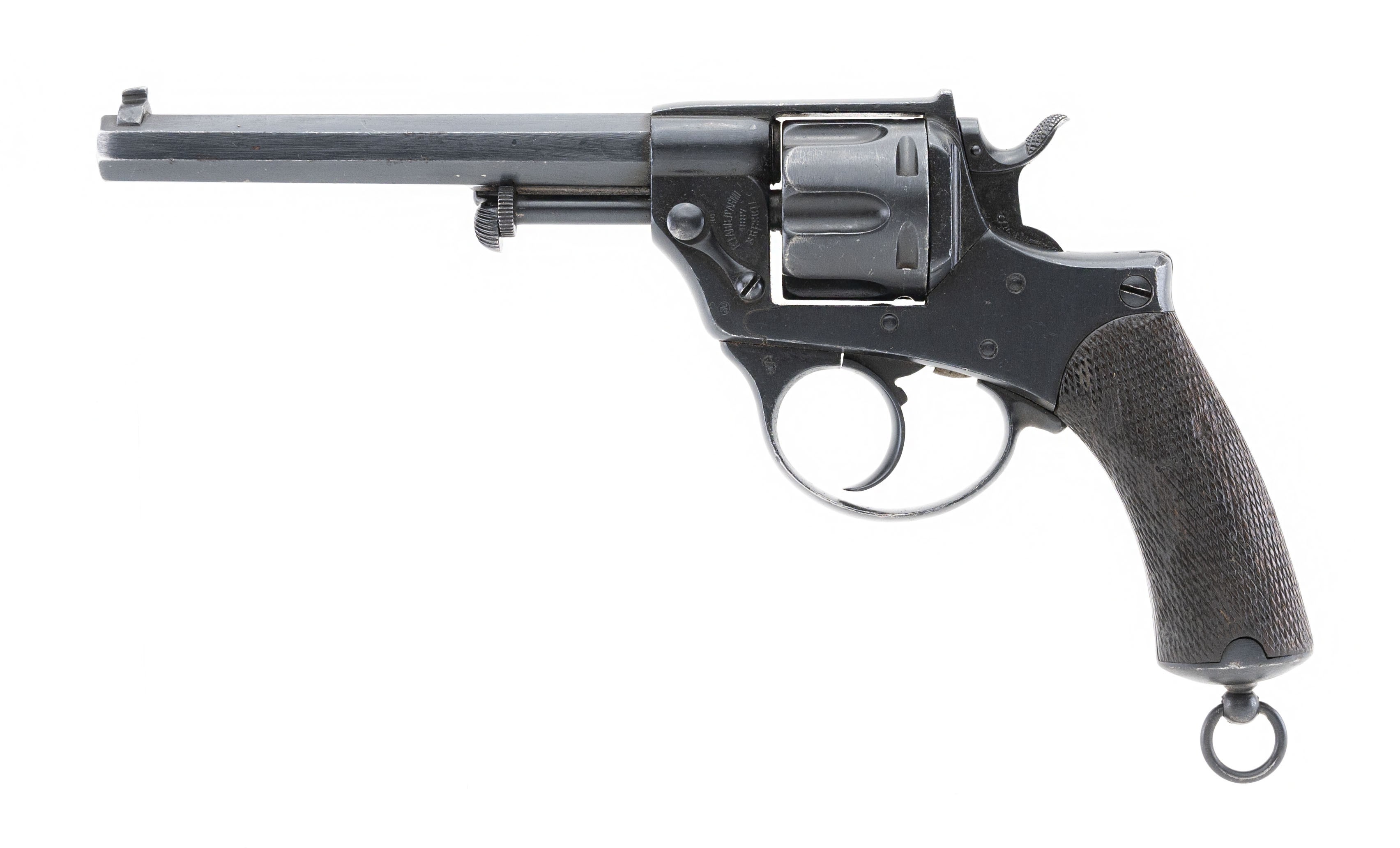 The Modello 1874 was the first handgun adopted by the Kingdom of Italy's armed forces. The overall length is approx. 11.5". The 6.3" octagon 10.35mm caliber barrel has an excellent bore with bright, strong rifling. It has a blade front sight with the block rear sight at the rear of the top strap. The left receiver is marked in an arc R'FABB.D'ARMI over BRESCIA (fabricated by the Brescia arsenal) in an opposing arc below with 1887 in the center. The right barrel flat is stamped with an S. The top rear of the right frame is stamped MU 44. This revolver retains approx. 95% of its original dull military blue finish. The checkered grips are very good with scattered light bruising. The lanyard ring and swivel are present. The action functions correctly. This fine Modello 1874 is fit for the finest Italian or European revolver collection.