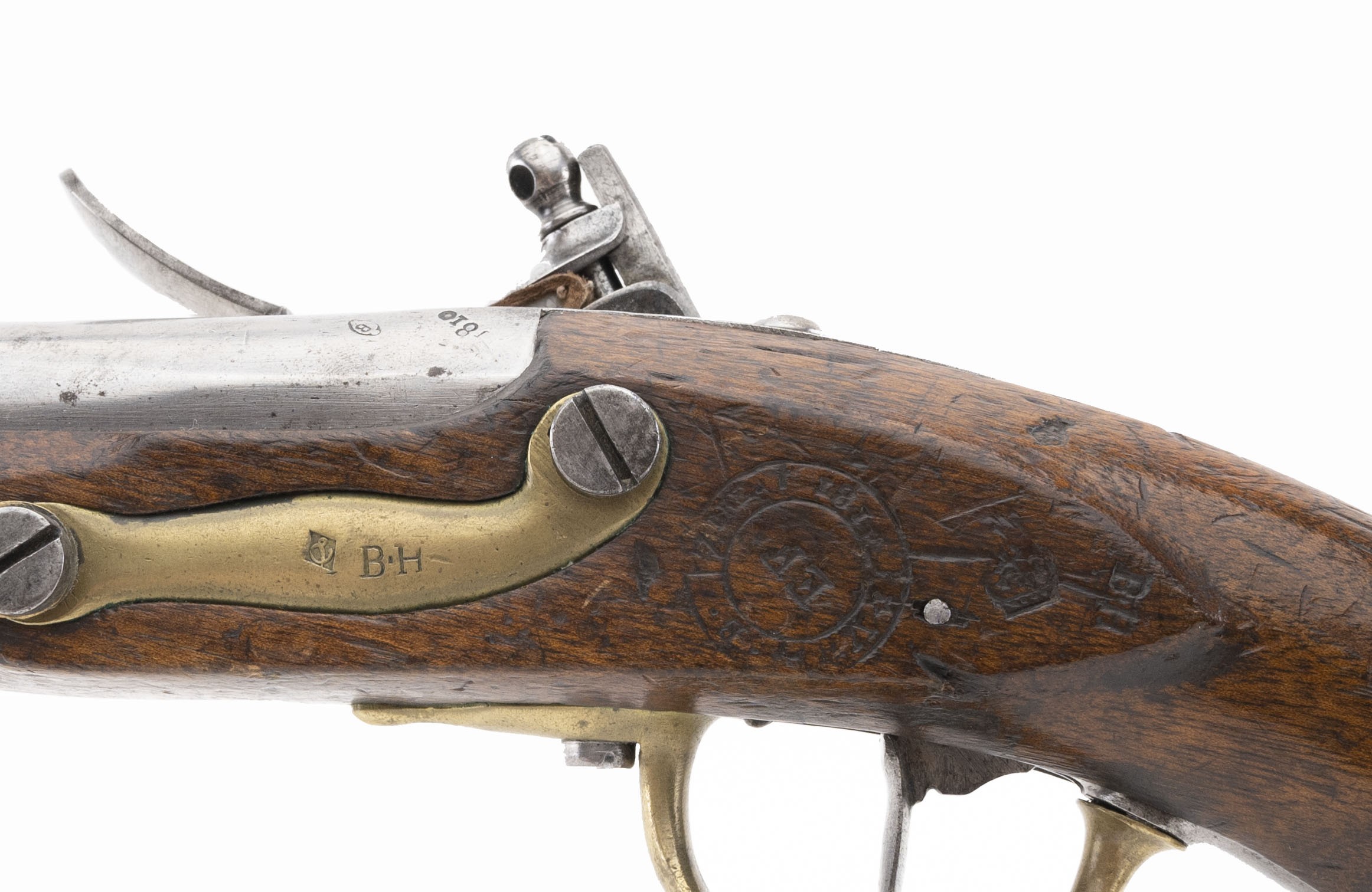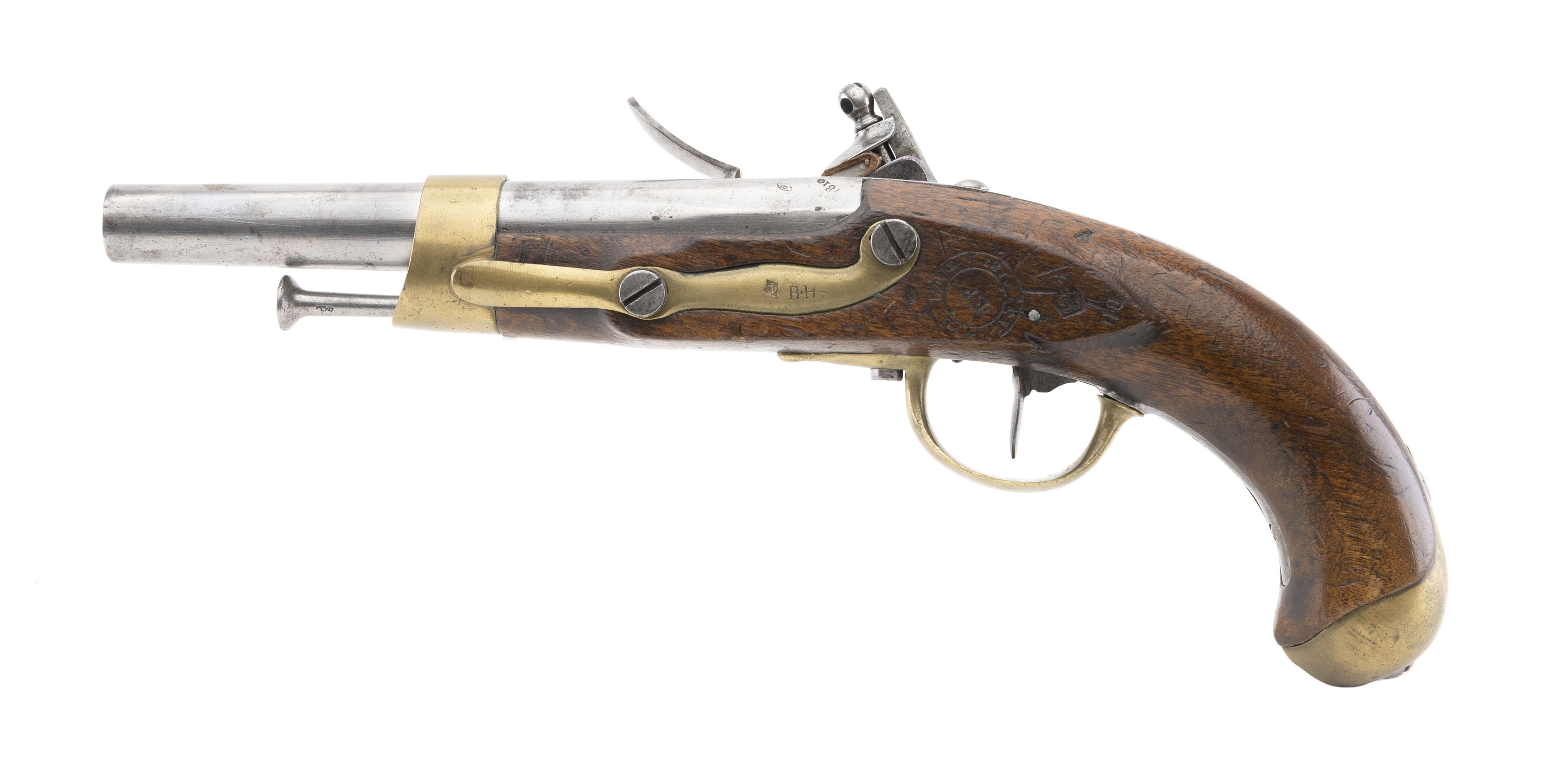 This is a fine 1810-dated French Model an 13 (1805) pistol. The overall length is approx. 14". The 7 7/8" round 69 caliber smooth bore barrel has an excellent, bright bore. All the metal is bright with very little staining. The barrel is marked FF forward of the touch hole with an impressed star and triangle and impressed star over B above the touch hole. The left flat has a B in an oval and 1810. The barrel tang is marked Mle. an. 13. (Model Year 13). The lock has a crown with T inside at top center and Manufre Imple over de Charleville (Charleville Imperial Manufactory) at bottom center. The brass nose cap, trigger guard, butt cap, and side plate have a smooth even patina. All except the side plate have the crown with T stamp. The side plate has an impressed script D and BH. The stock is very good with sharp edges, light issue dents and dings, no cracks or chips, a rondel with EF and 1810 on the left flat with a crown and BH to the rear. The action function correctly. This fine French Model an 13 pistol is fit for the finest French or European military pistol collection.
