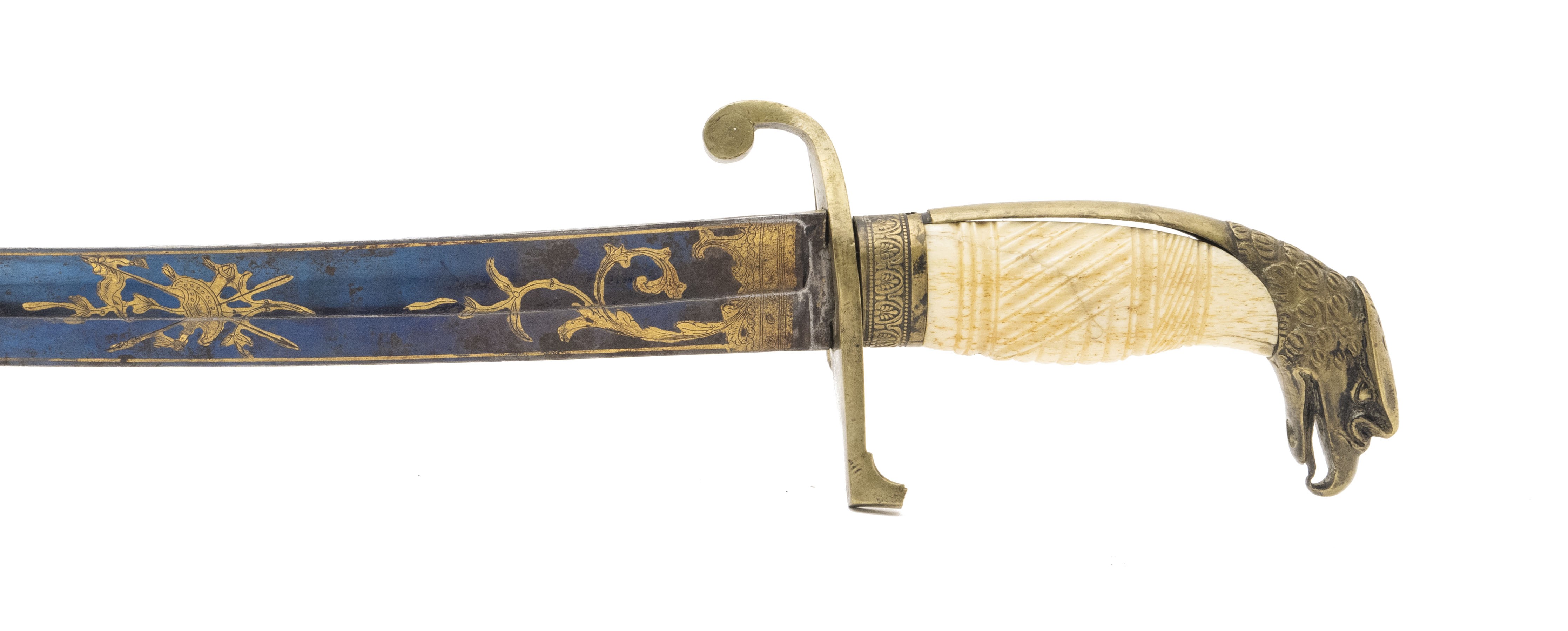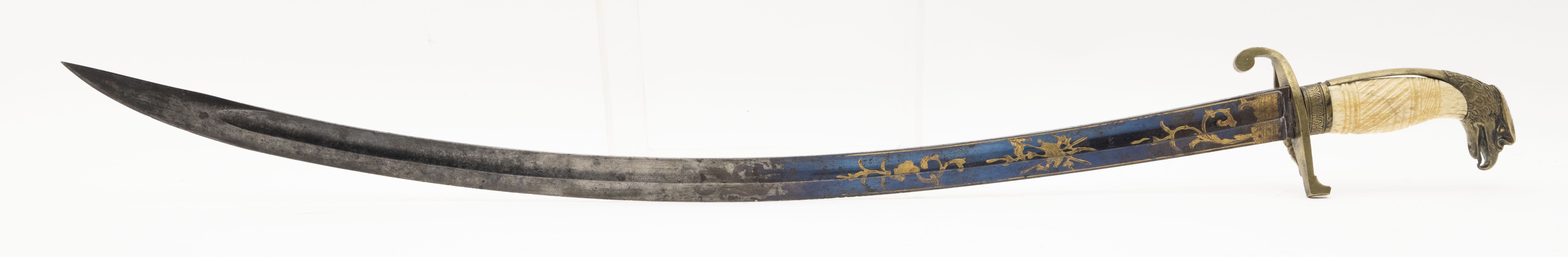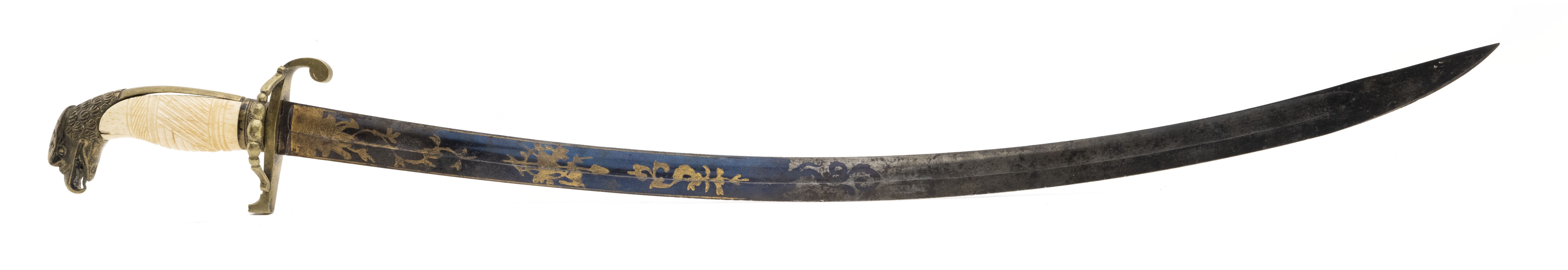 Circa 1810-1820. 28 ½” blade with blue and gilt finish. Hilt is Cast brass with a nice eagle. Grip is carved ivory. Guard is broken and it is a little loose. Very nice sword.