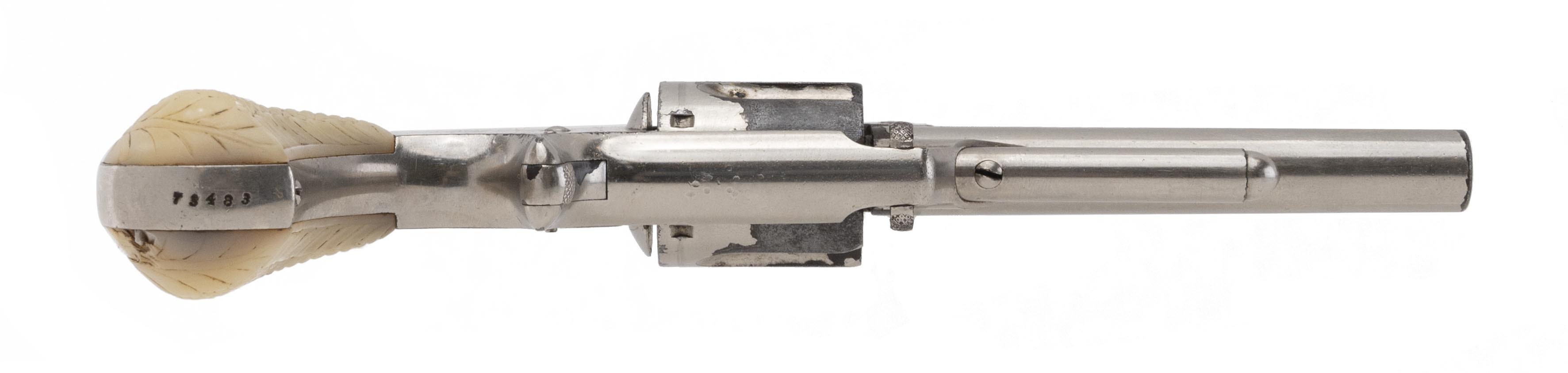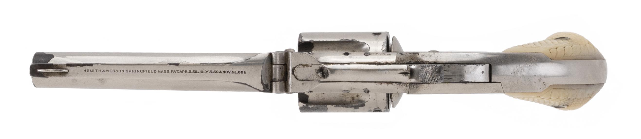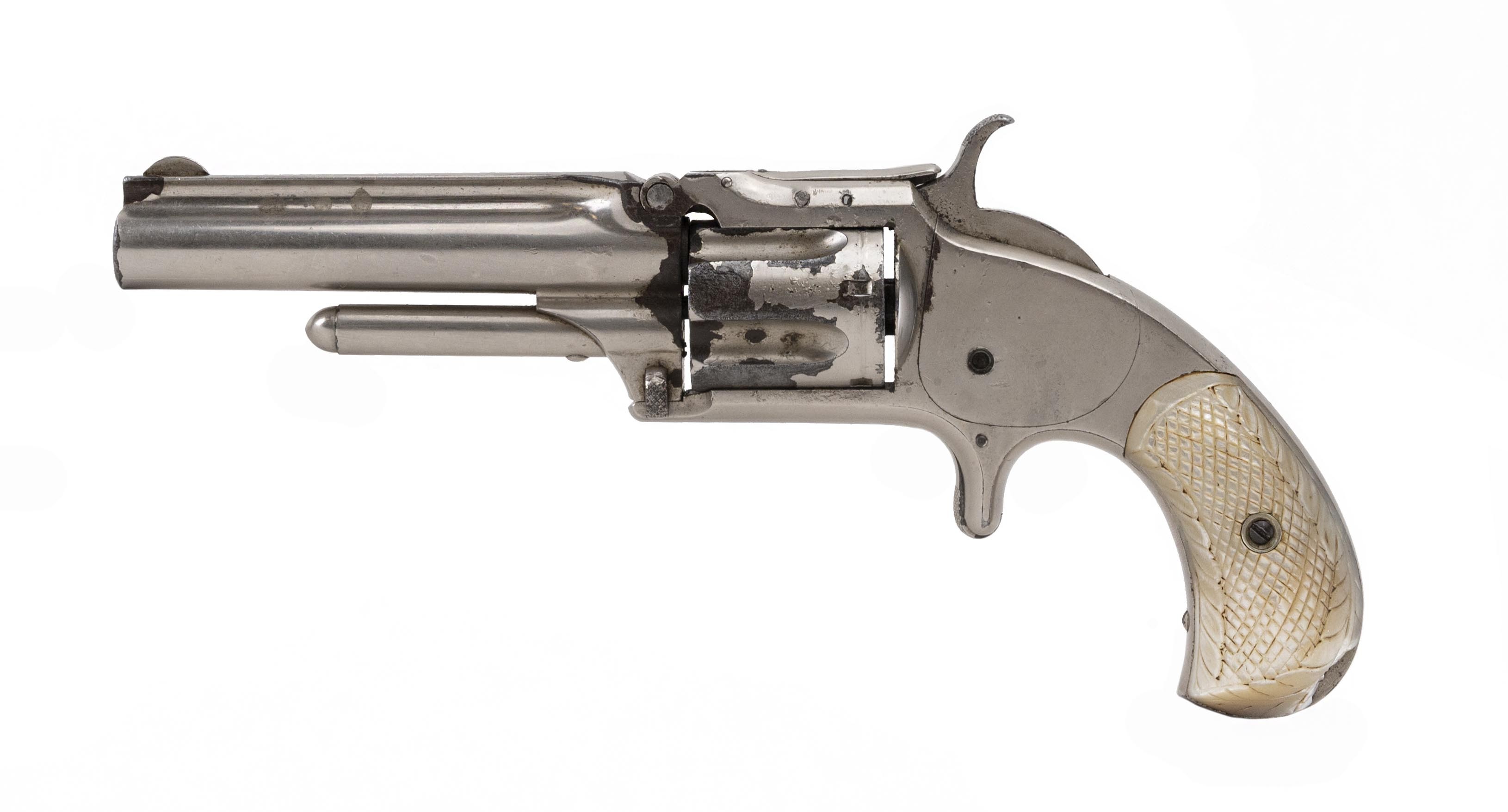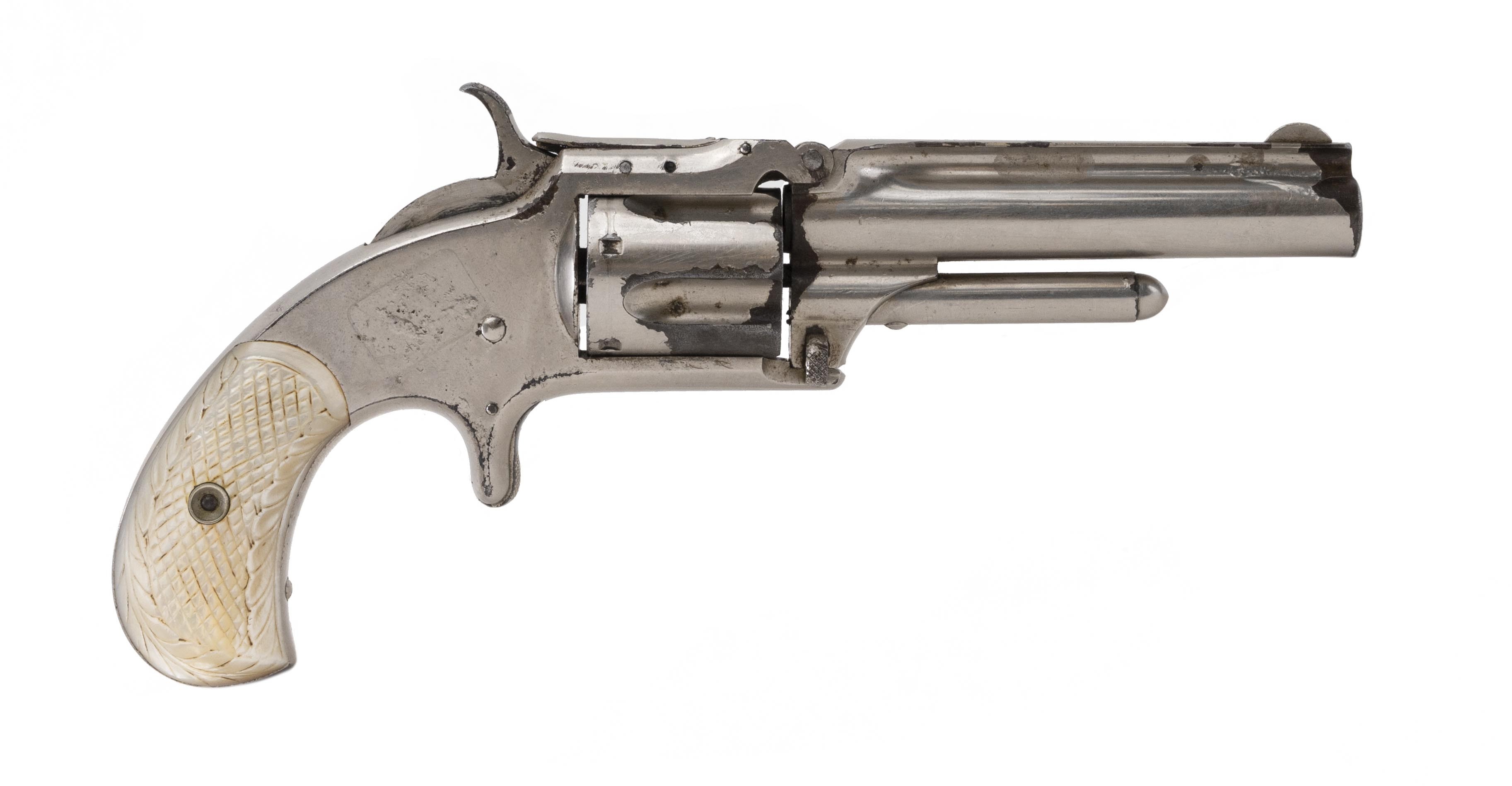 The Smith & Wesson 32 rimfire long caliber Model No. 1 1/2 (also known as the New Model 1 1/2) was made from 1868 to 1875. It features a fluted five-shot cylinder and birds head grips. The 3.5" barrel has a good rifled bore with moderate erosion in the grooves. Approx. 80% of the nickel finish remains with flaking on a couple of chambers, to the front of the cylinder on both sides, at the muzzle, and on various high spots. The mother of pearl grips are checkered and engraved in a leaf pattern along the edges. The bottom of the left grip has a small chip. The grips are very attractive. The barrel and frame are tight. The action functions correctly. With its attractive mother of pearl grips, this is a very attractive Smith & Wesson No. 1 1/2. It would be perfect for any S&W collection.