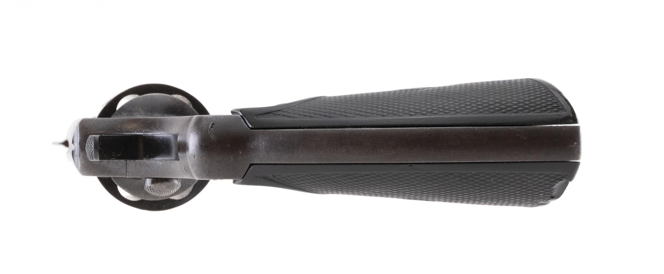 This 41 Colt caliber Colt Army Special revolver is circa 1911. The 4.5" round barrel has a good bore with firing erosion. The revolver retains approx. 30% of its original blue finish, mostly in protected areas, with the remainder turning brown. The checkered rampant Colt grips are good with a couple of old small chips on the bottom left and OW cut into the bottom of the right. The action functions correctly. Reasonably priced at $375.