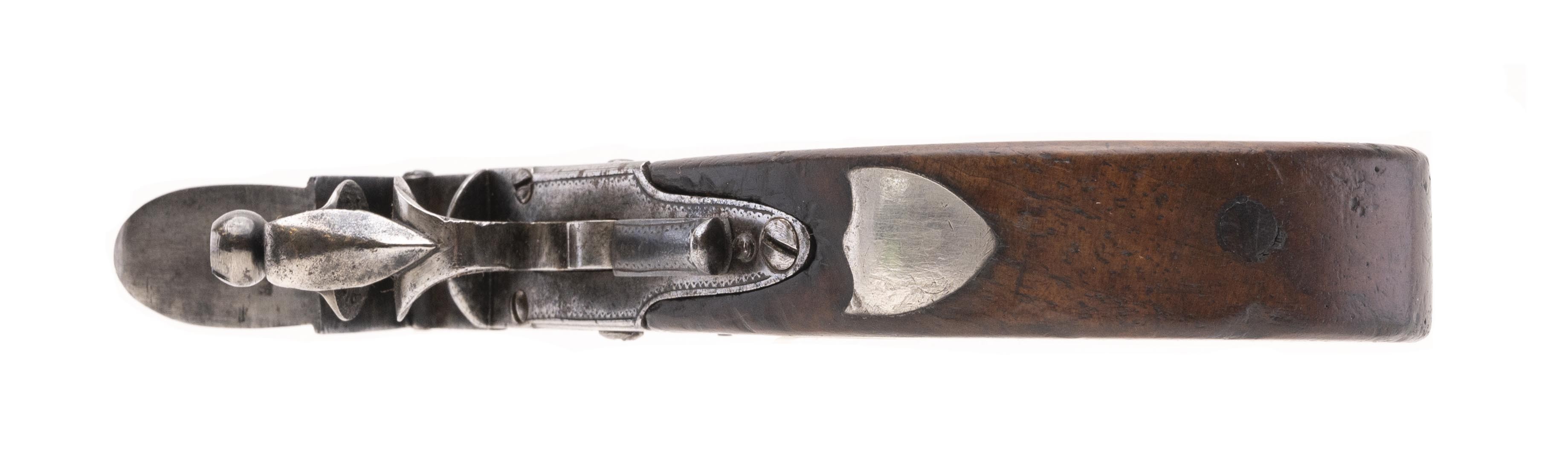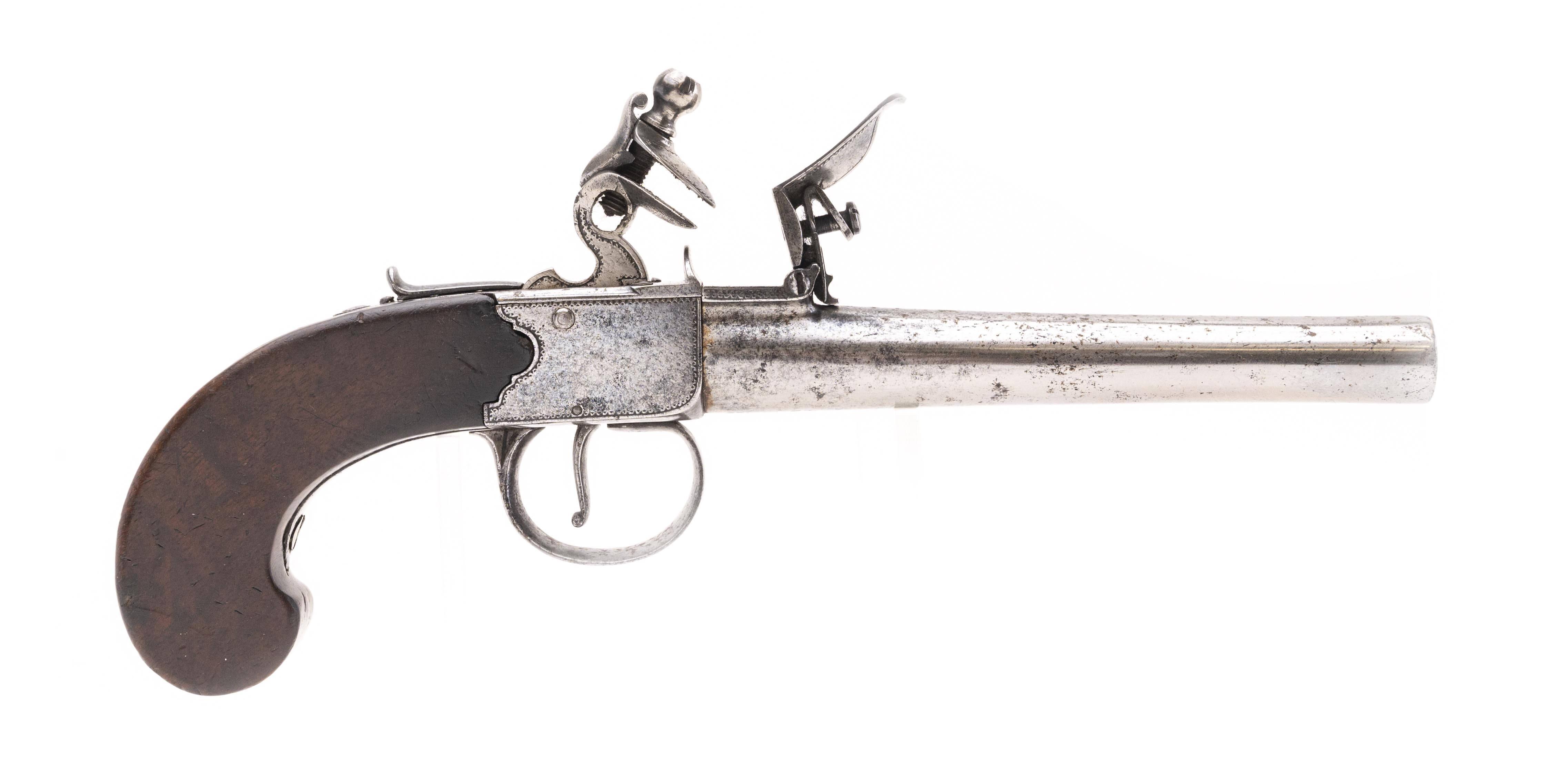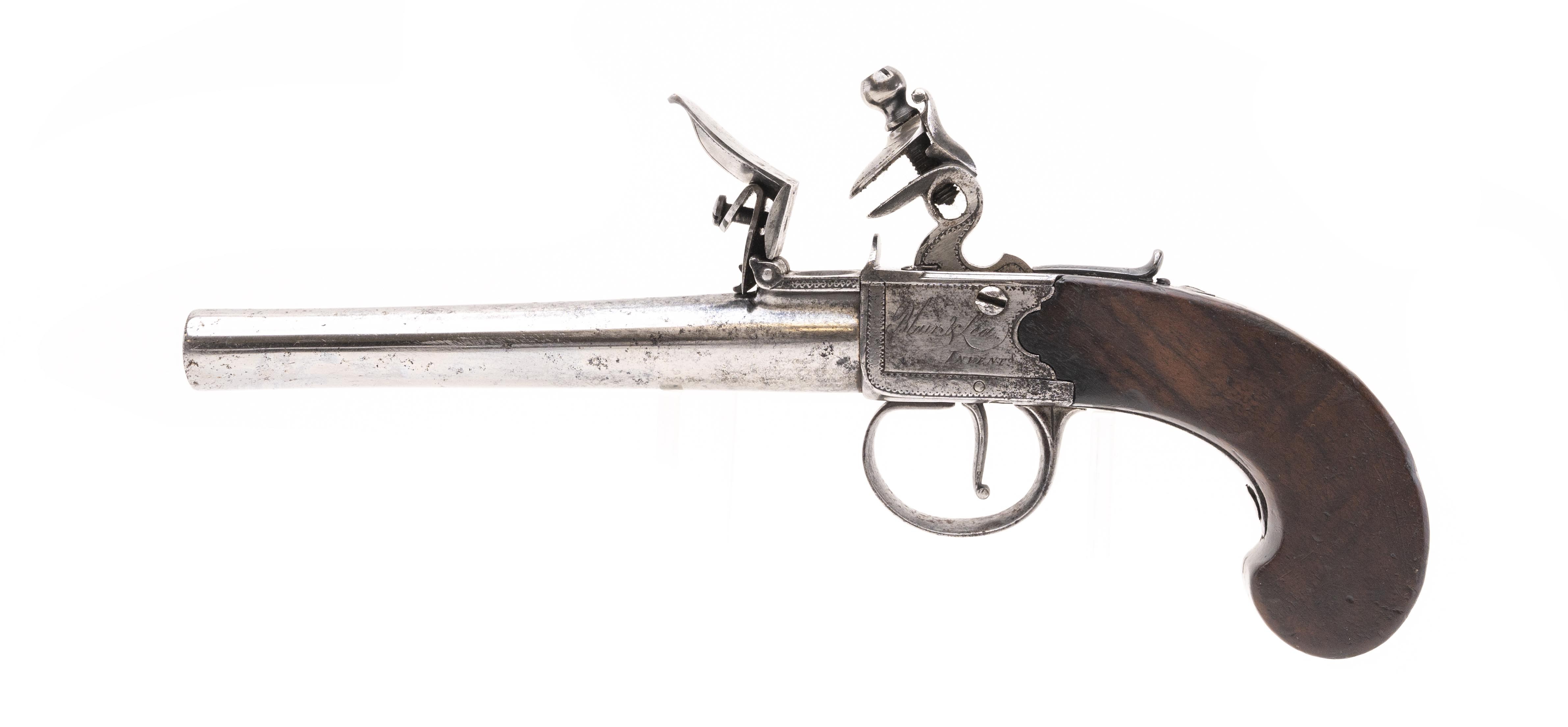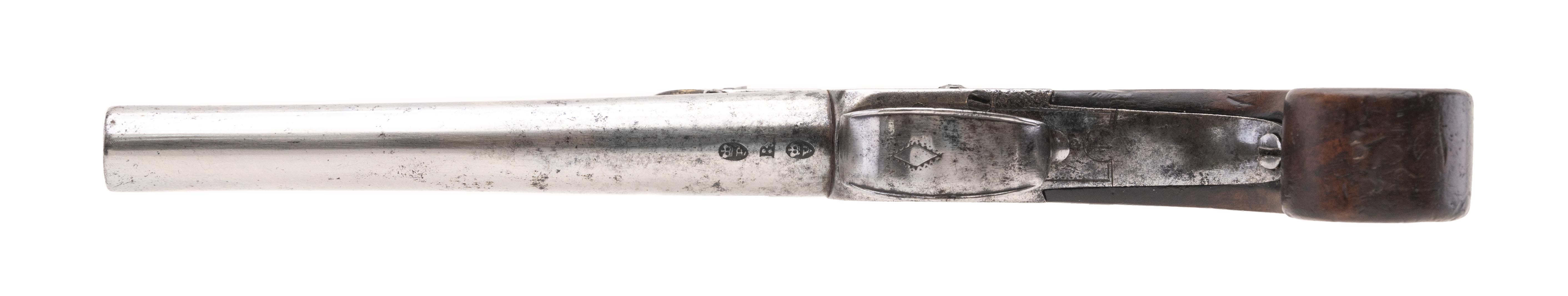 Left side of the box lock frame is marked in script "Blair & Lea". This very well made pistol is .45 caliber smoothbore. Barrel length is 6" and overall length is 9.25". Barrel has the London black powder proof and view mark. Cock has a sliding safety. The stock is very good with no chips or cracks and has a silver shield on the back for initials or crest. This pistol has eye appeal and is in very fine condition.