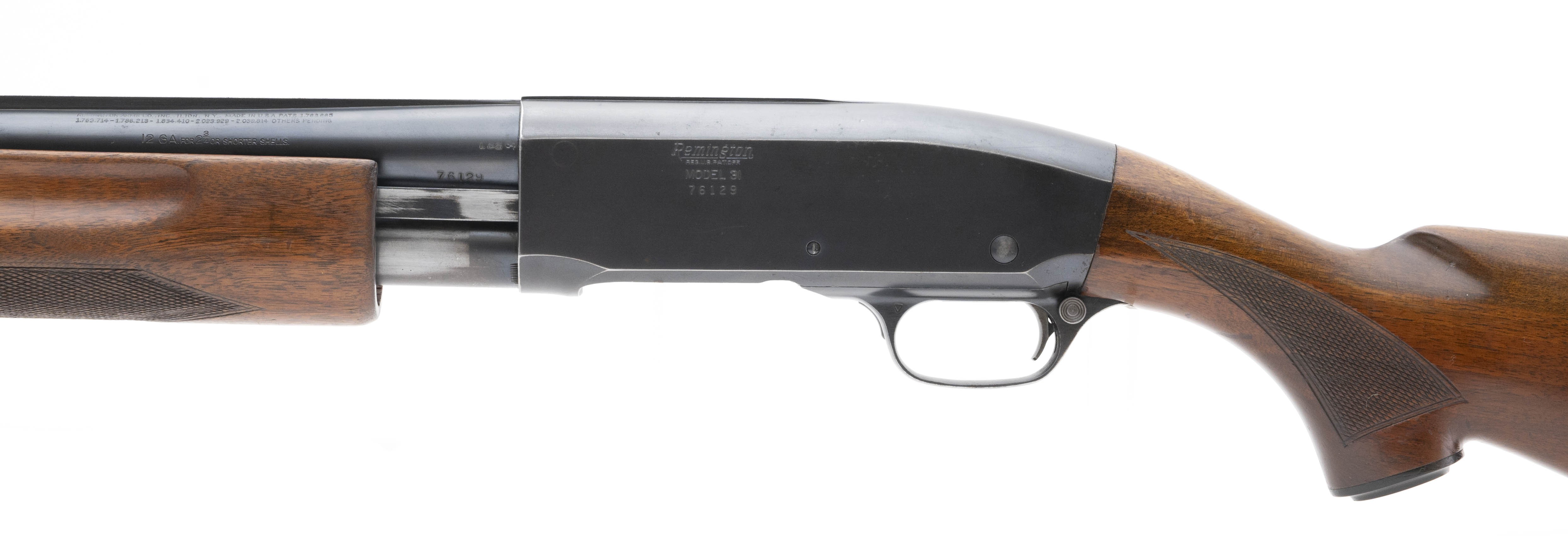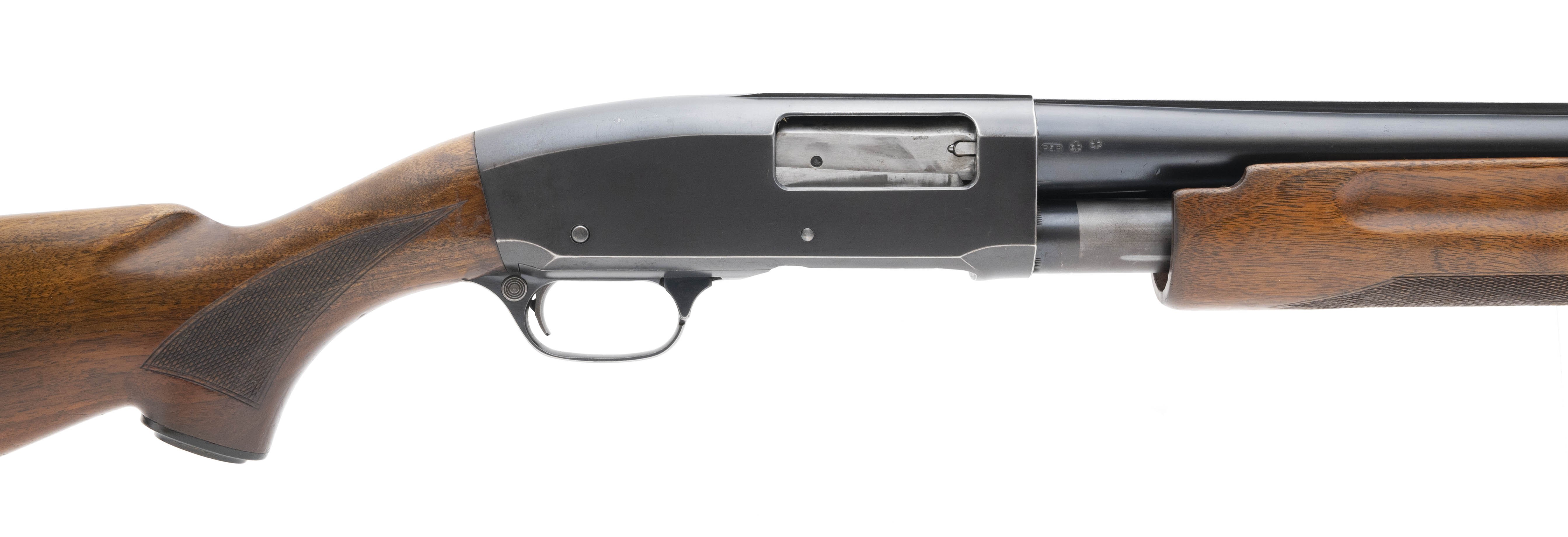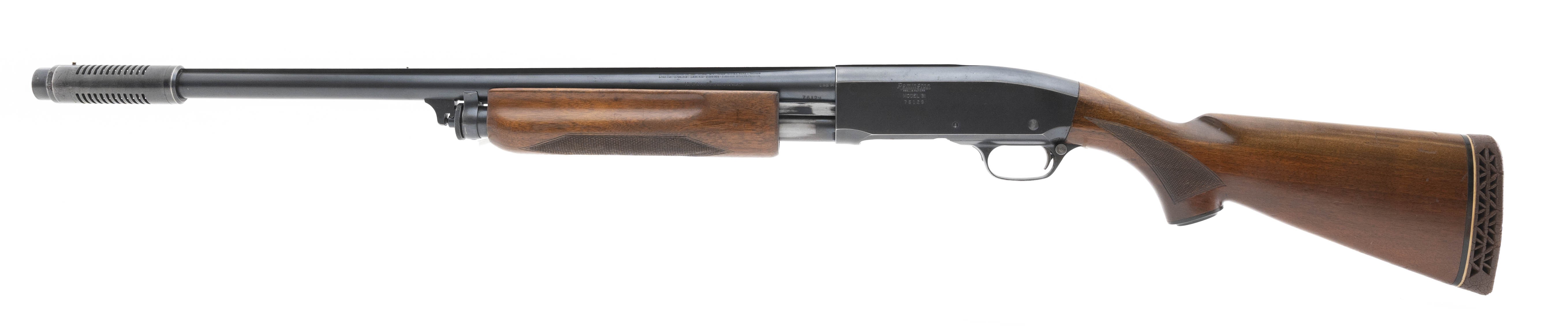 Special order Skeet pump gun with solid rib and factory Cutts Compensator, made in 1947. The barrel has no choke marking, indicating it was made with the Cutts Compensator, which has a Spreader choke installed. The stock is hand checkered with beavertail forend. The metal is very good with about 92% original blue. The stock has some marks and wear, and has a recoil pad added. The LOP is 13.5". An interesting vintage sporting gun.