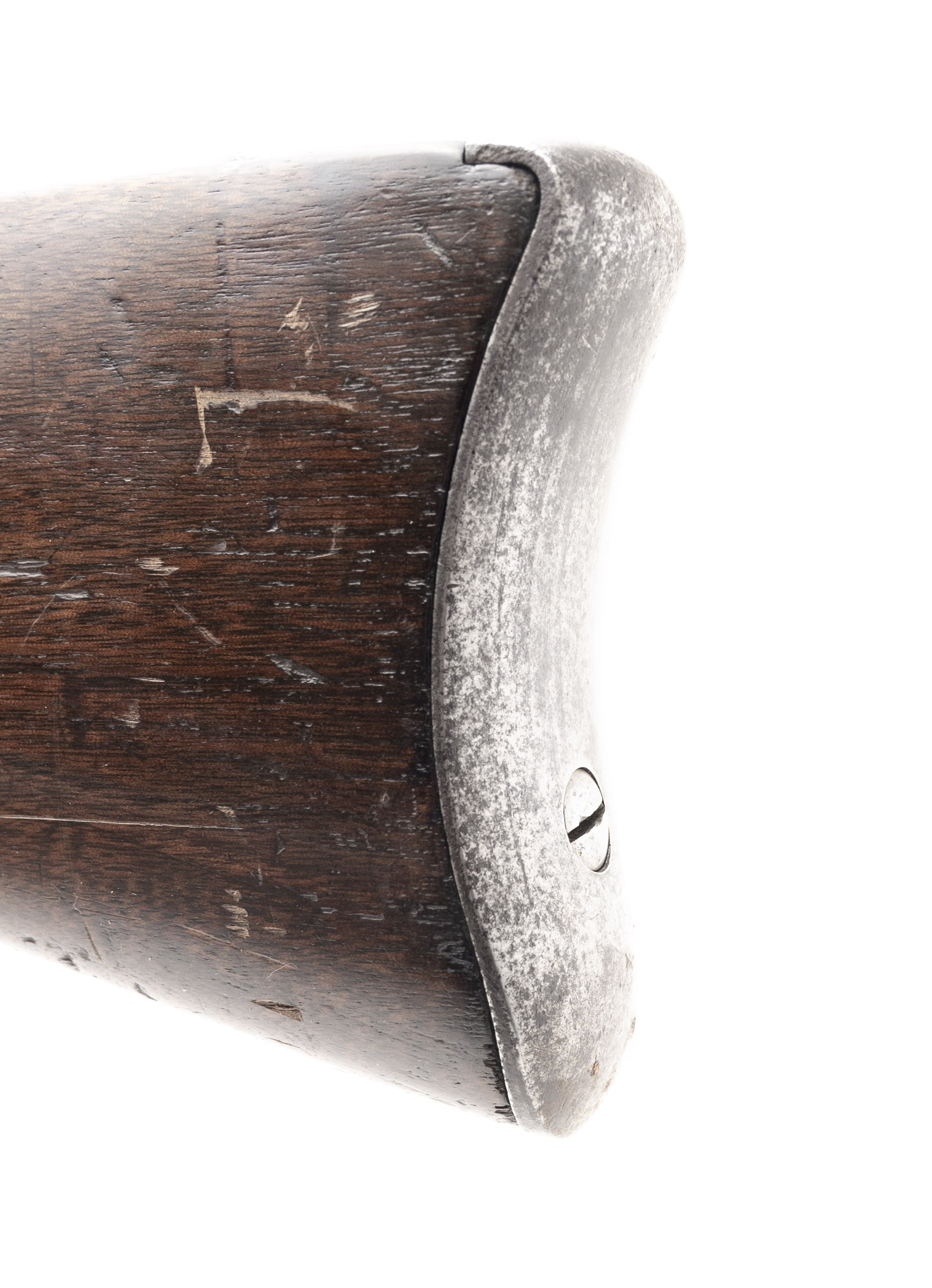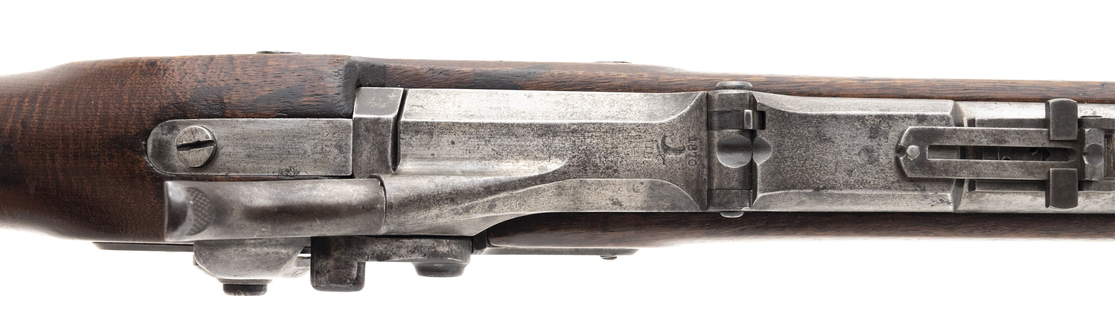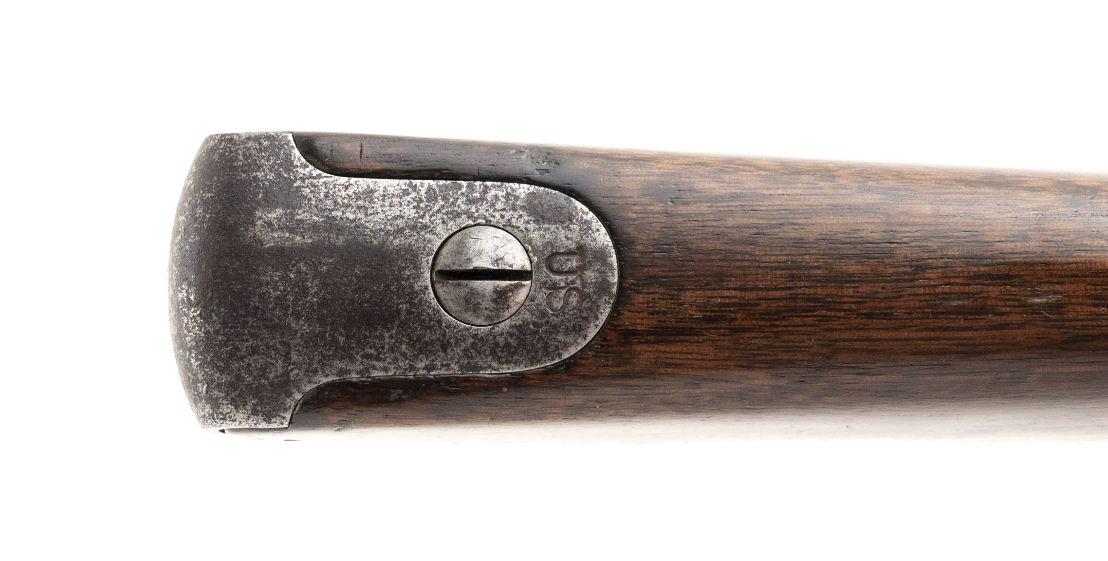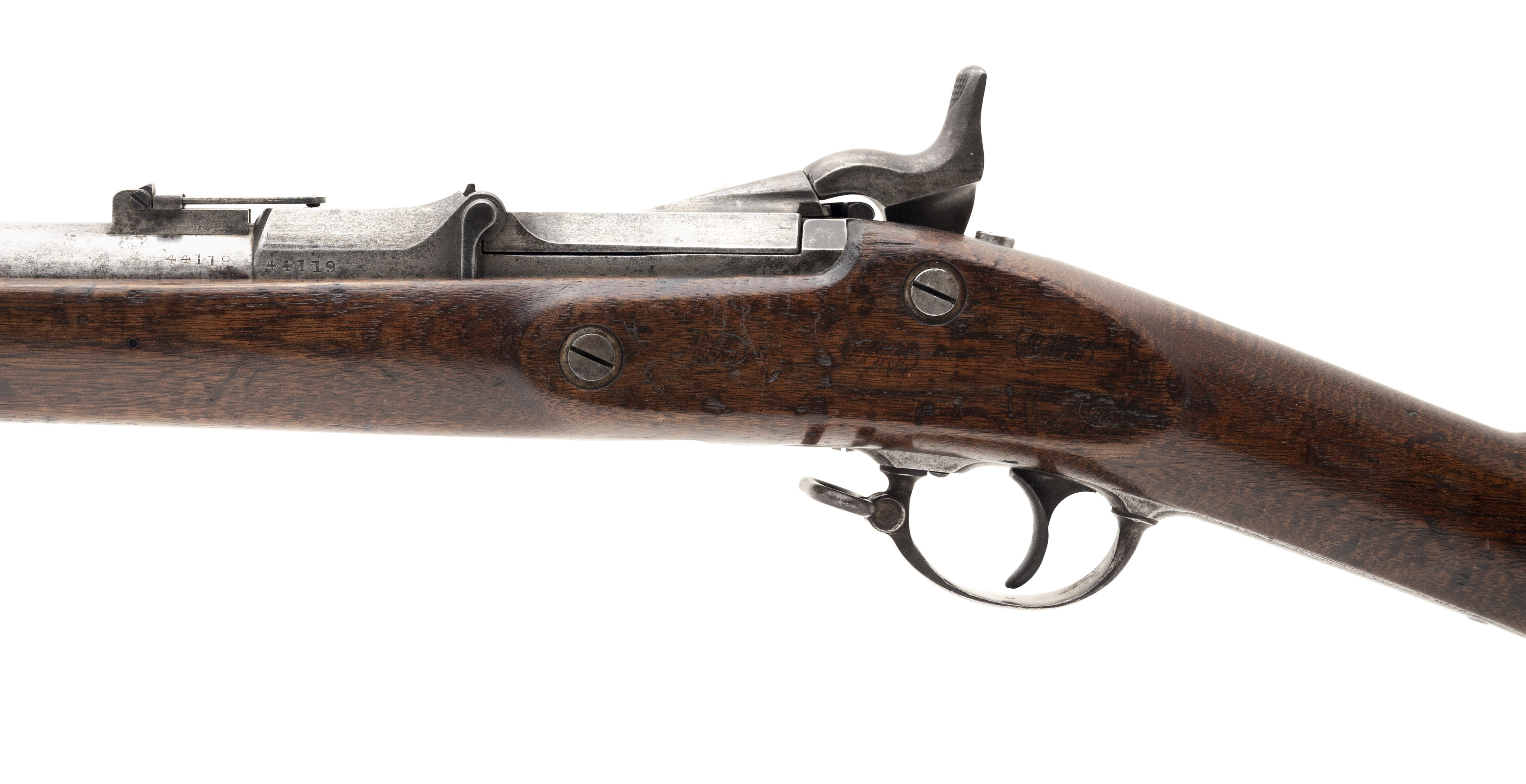 This 50 Government (50-70) U.S. Model 1868 Springfield trapdoor rifle is circa 1870. The 32.5" barrel has a bright bore with areas of firing erosion. All the metal is the original bright with scattered brown staining. It has a correct 1863 Springfield rifle musket lock. The stock is very good with wear along the ramrod channel and light to moderate overall usage dents and dings. There are, correctly, four cartouches on the left flat two of which are ESA. The action functions correctly. This basic Indian Wars firearm is a must for any Western or Indian Wars collection.