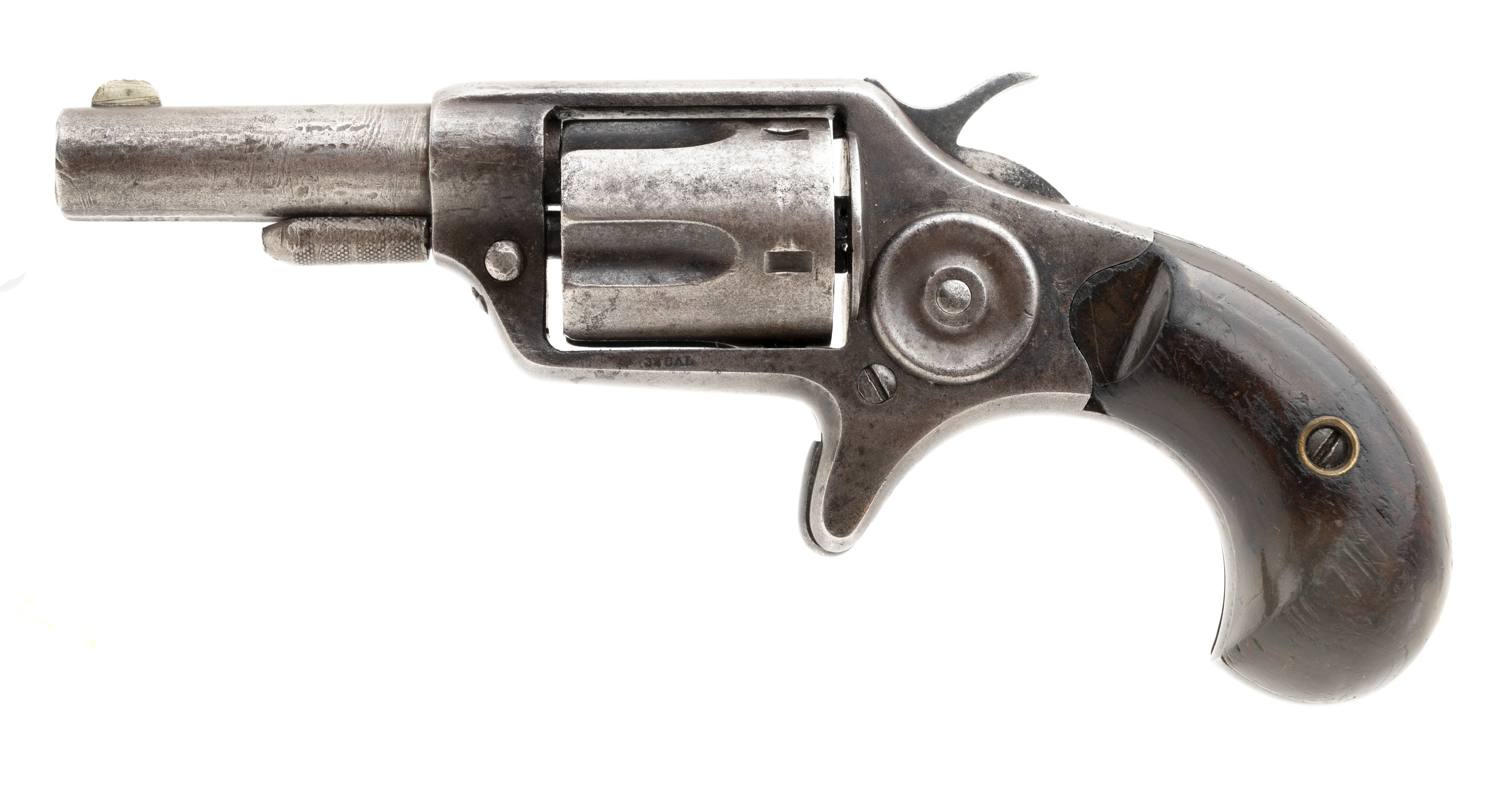 Made circa 1870s. 32 caliber with a 2 ¼” barrel. Metal is mostly a dark gray patina. Grips are very good. Action Works Well.