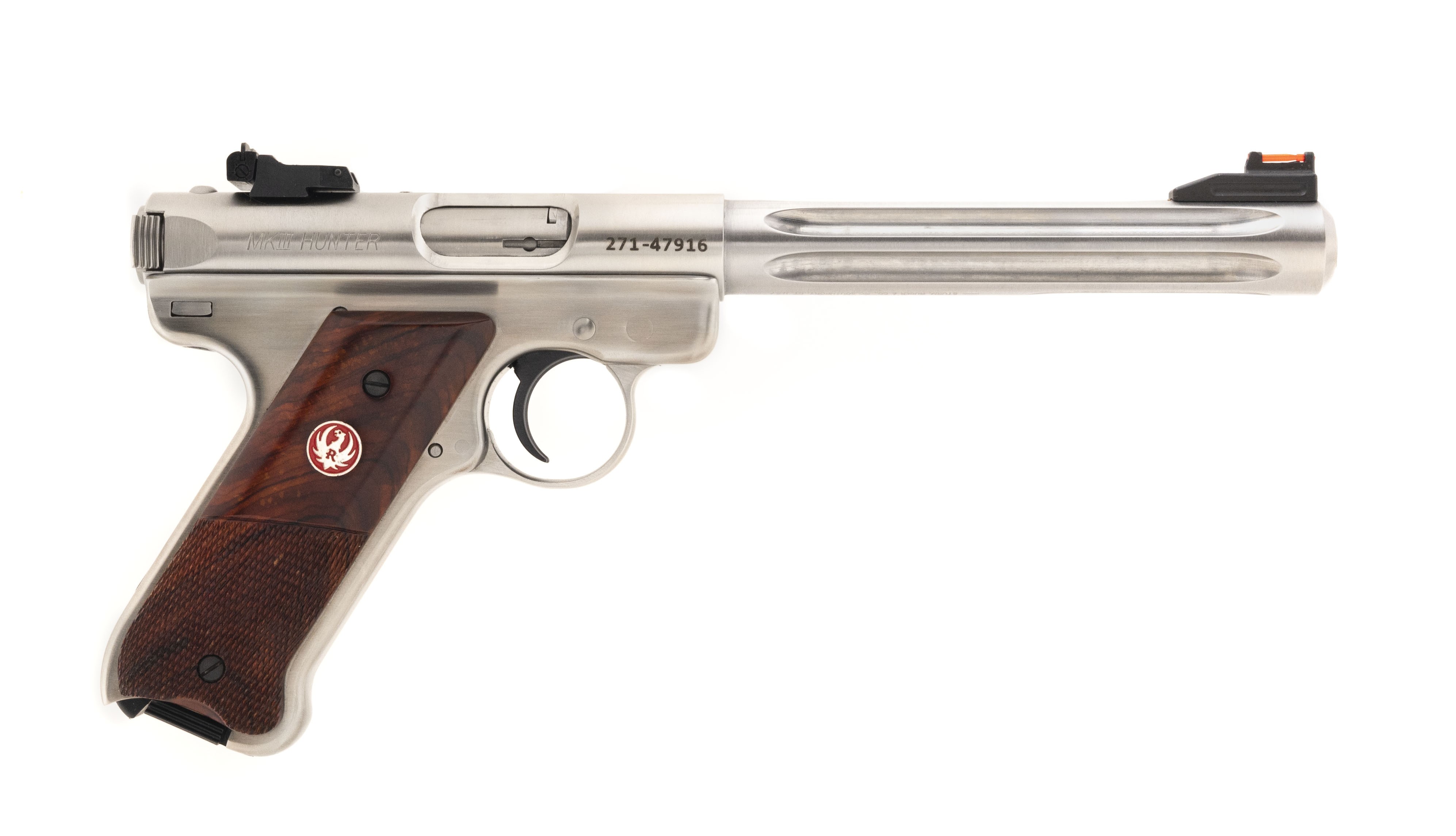 Stainless target pistol with 7" fluted barrel, adjustable rear sight and fiber optic front sight. Excellent condition with box and extra magazine.
