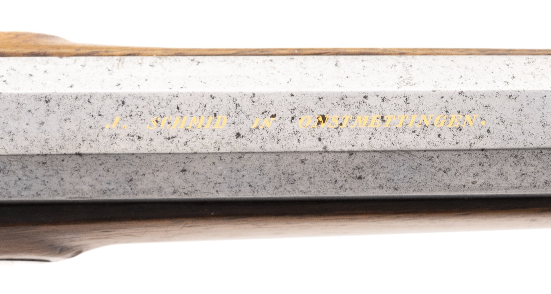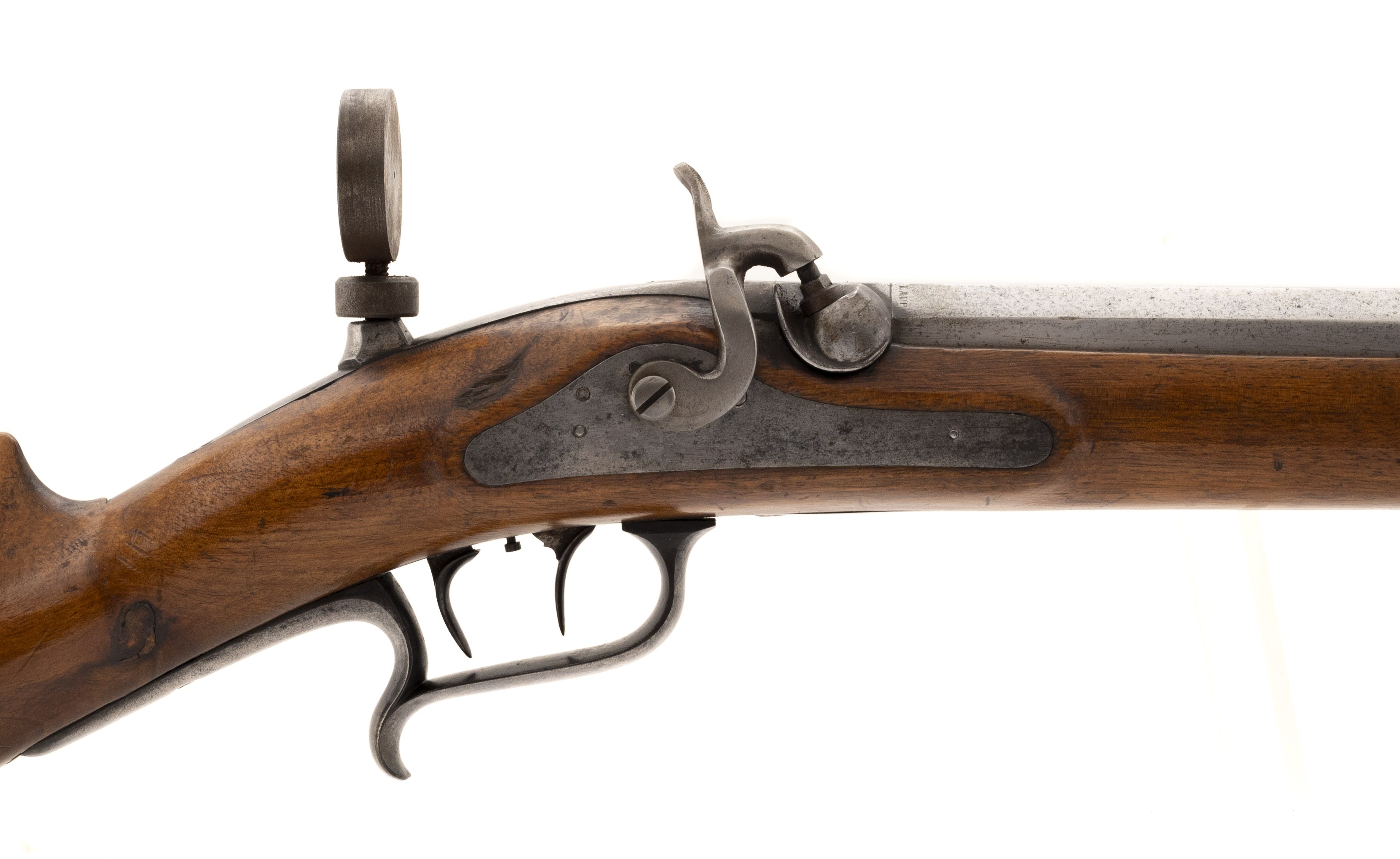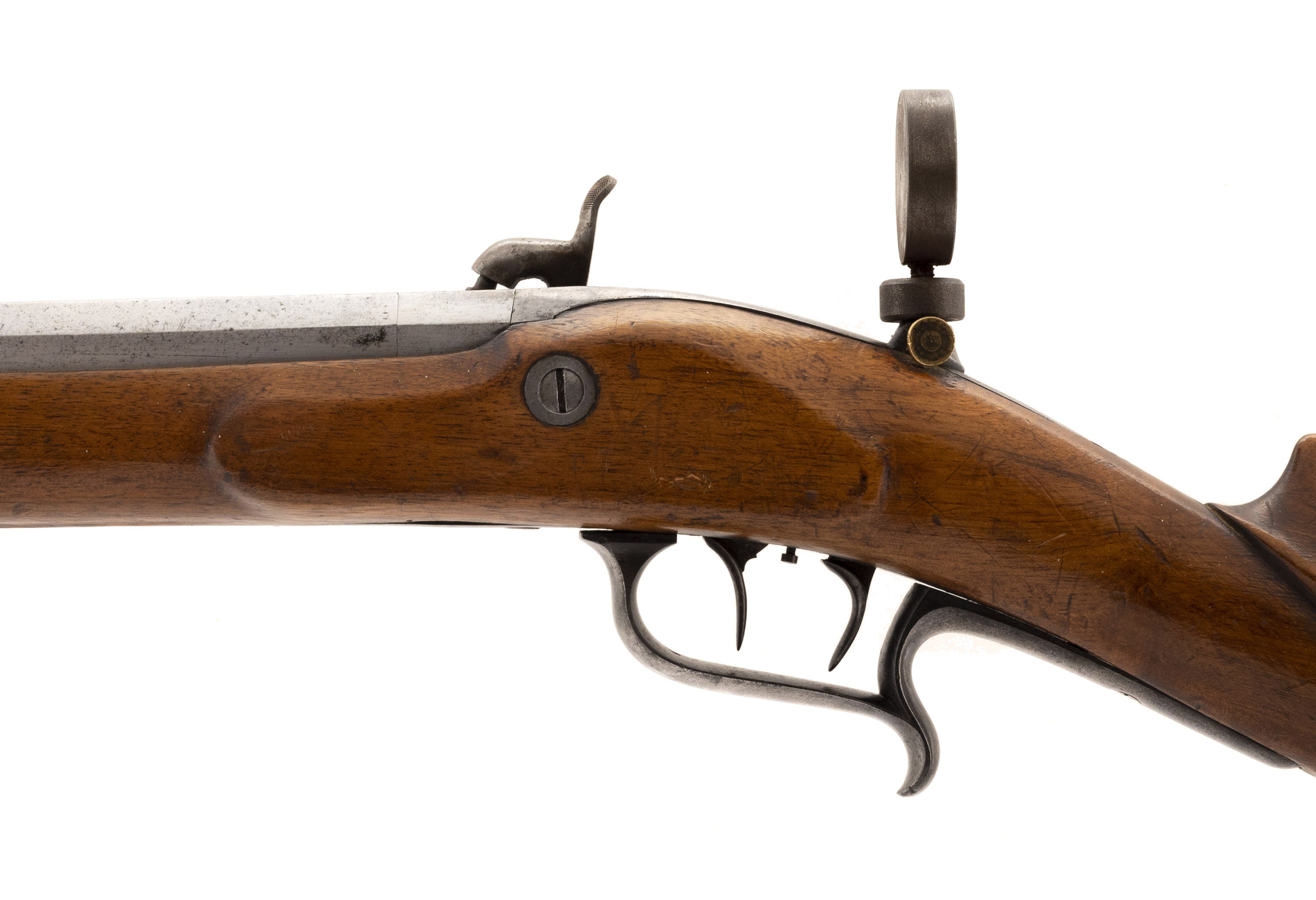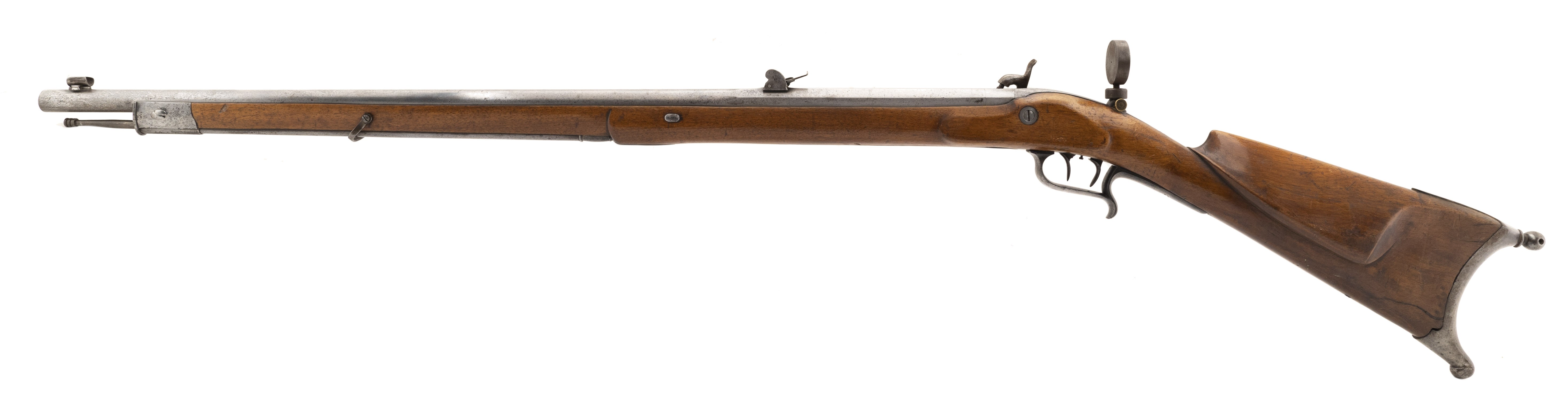 The percussion Swiss Model 1851 Feldstutzer rifle, also called the Eidgenossischer Stutzer 1851 (Federal Carbine 1851), was the first rifle to be introduced after the Federal Constitution of 1848 transferred armament responsibility from the Cantons to the Federal State. This was the first military rifle in Europe to depart from the 18mm caliber (71 caliber) for the smaller 10.4mm caliber bore (41 caliber). This change enabled the soldier to carry twice as much ammunition. The Model 1851 Feldstutzer rifle was issued to the sharpshooters of all Cantons. Like all Stutzers, it is equipped with double set triggers. In total, 6400 Model 1851 rifles were manufactured with many later being altered to the Milbank-Amsler system. The overall length is approx. 51". The 33.25" octagon to round barrel has a fine bore which has frosting in the grooves. The rifle weighs approx. 10 pounds. The rear sight is adjustable from 200 to 1000 paces. It is also equipped with a massive peep sight. The barrel is bright with light spottting. It is marked in gold inlay J. SCHMID IN ONSTMETTINGEN. . The barrel is equipped with a bayonet lug. The lock is bright with light staining and is ummarked. The hammer, trigger guard, Stutzen butt plate, and ramrod housing are mostly brigh with some brown mixed int. The ramrod and top swivel are present with the bottom swivel that screws into the stock being absent. The stock is very good with moderate wear, no cracks or chips, and an area on the upper tight butt that appears to have been too near a flame. The double set trigger action functtions correctly. This Swiss Model 1851 Feldstutzer rifle would be a great fit for your European or Swiss military rifle collection