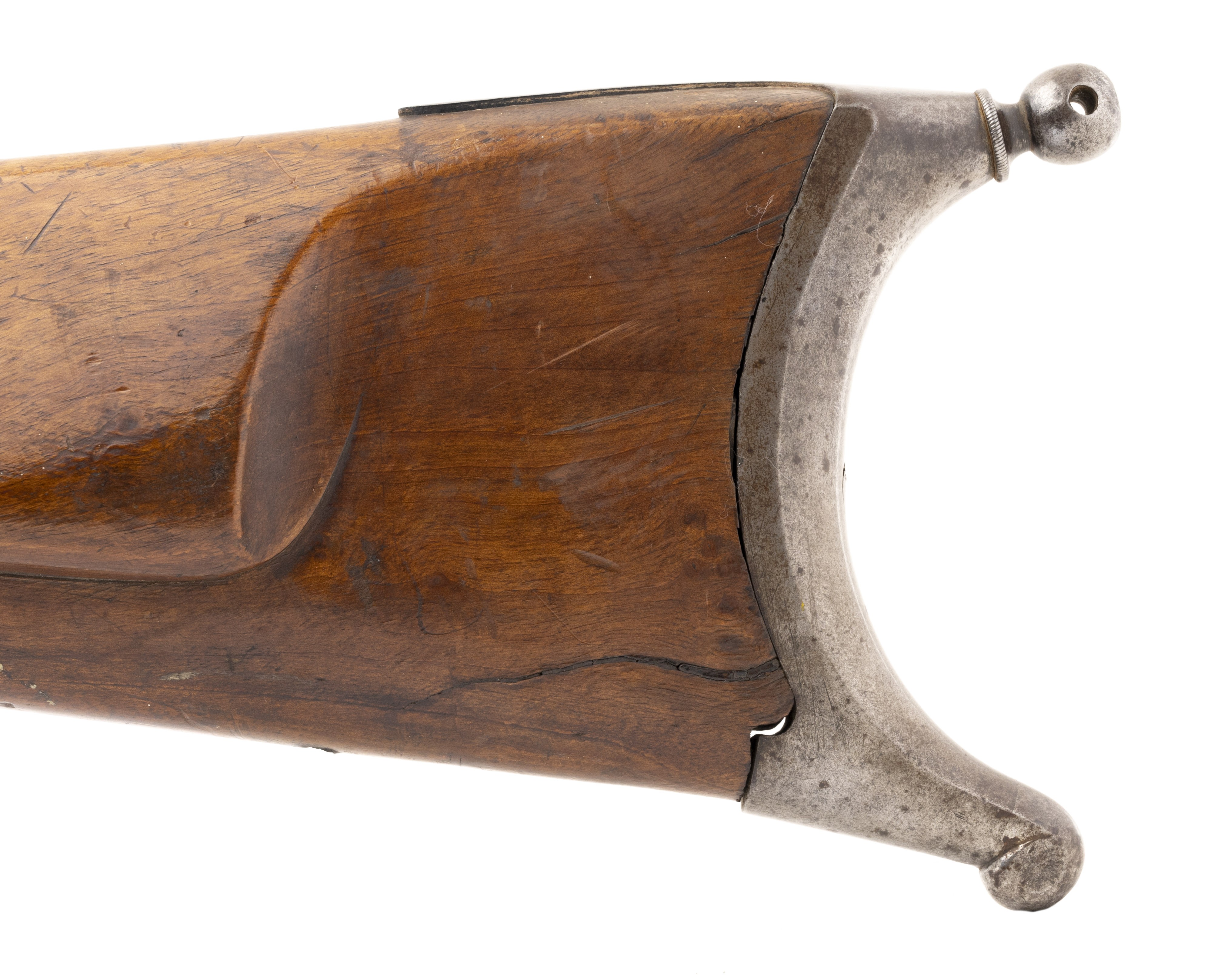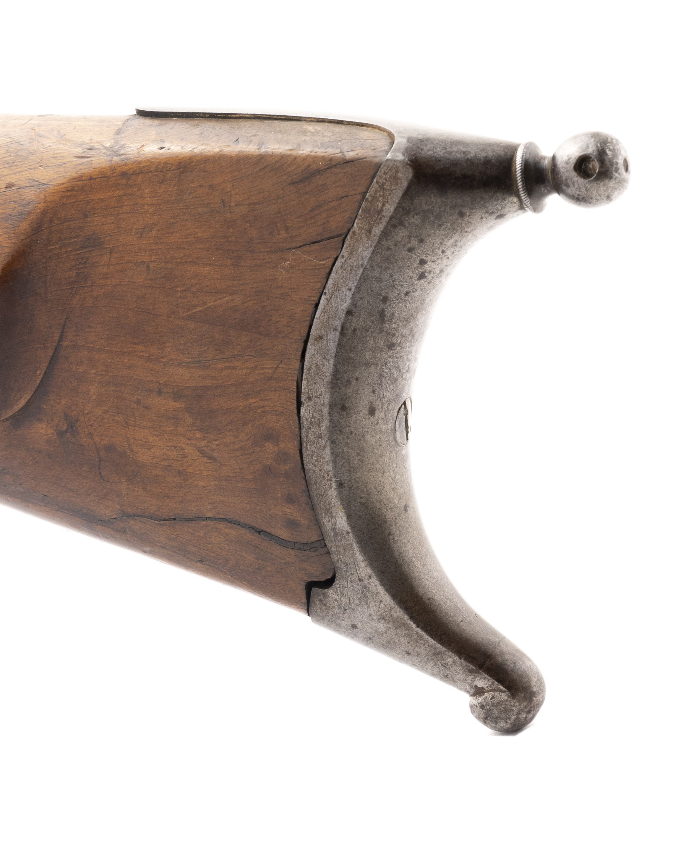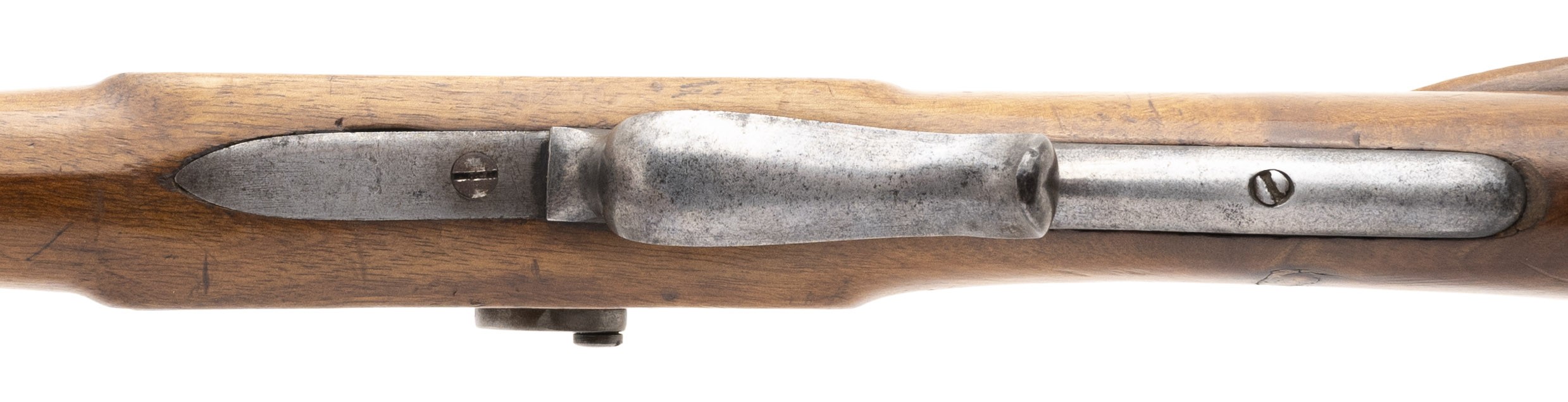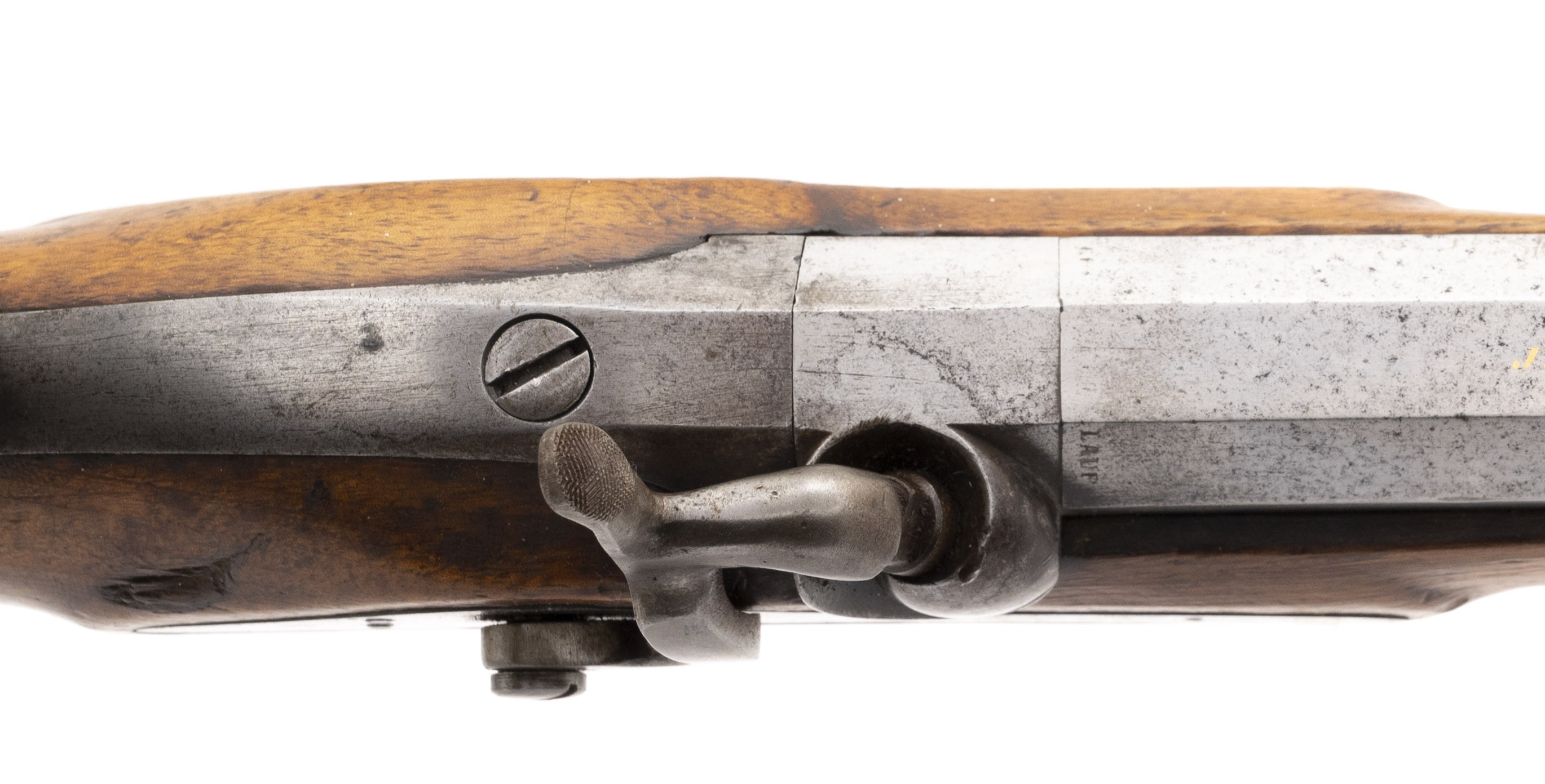 The percussion Swiss Model 1851 Feldstutzer rifle, also called the Eidgenossischer Stutzer 1851 (Federal Carbine 1851), was the first rifle to be introduced after the Federal Constitution of 1848 transferred armament responsibility from the Cantons to the Federal State. This was the first military rifle in Europe to depart from the 18mm caliber (71 caliber) for the smaller 10.4mm caliber bore (41 caliber). This change enabled the soldier to carry twice as much ammunition. The Model 1851 Feldstutzer rifle was issued to the sharpshooters of all Cantons. Like all Stutzers, it is equipped with double set triggers. In total, 6400 Model 1851 rifles were manufactured with many later being altered to the Milbank-Amsler system. The overall length is approx. 51". The 33.25" octagon to round barrel has a fine bore which has frosting in the grooves. The rifle weighs approx. 10 pounds. The rear sight is adjustable from 200 to 1000 paces. It is also equipped with a massive peep sight. The barrel is bright with light spottting. It is marked in gold inlay J. SCHMID IN ONSTMETTINGEN. . The barrel is equipped with a bayonet lug. The lock is bright with light staining and is ummarked. The hammer, trigger guard, Stutzen butt plate, and ramrod housing are mostly brigh with some brown mixed int. The ramrod and top swivel are present with the bottom swivel that screws into the stock being absent. The stock is very good with moderate wear, no cracks or chips, and an area on the upper tight butt that appears to have been too near a flame. The double set trigger action functtions correctly. This Swiss Model 1851 Feldstutzer rifle would be a great fit for your European or Swiss military rifle collection