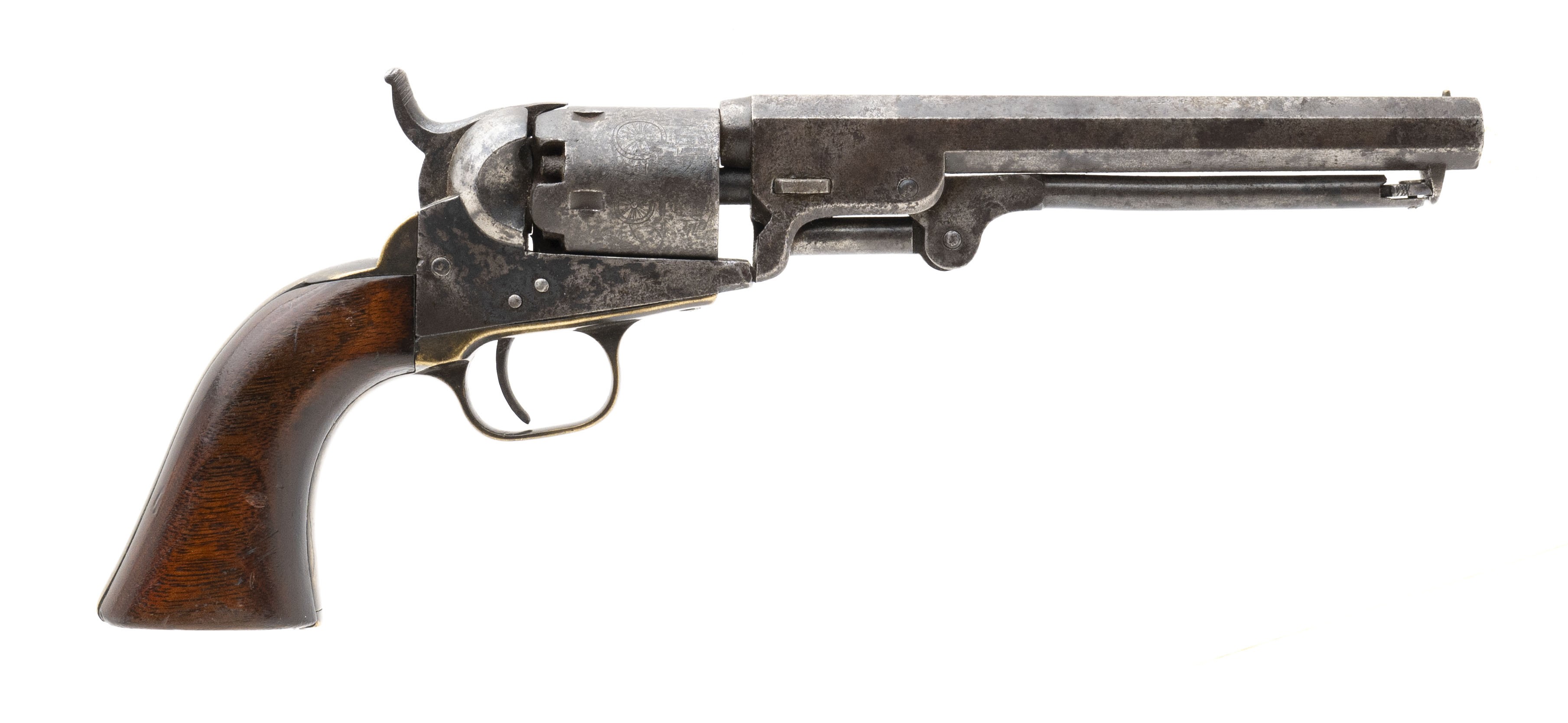 Serial number 93582. Made in 1854. 31 caliber with a 6” barrel. Metal has a dark gray patina with moderate pitting throughout the metal. Grips are very good. All numbers are matching. Action indexes, but does not lock up solidly.