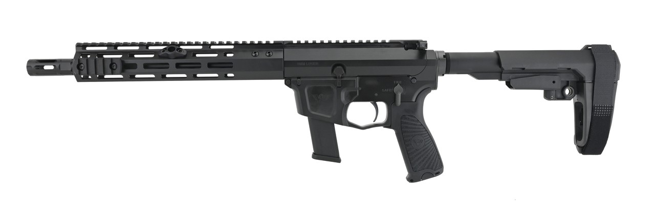 Wilson Combat AR9G 9mm caliber pistol. Wilson Combat AR pistol with 11” barrel, chambered in 9mm with enhanced trigger, M-Lok handguard, Ambi charging handle and SB Tactical pistol brace. Comes with soft case and one magazine.